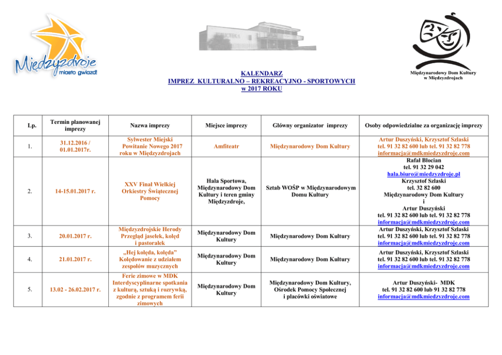 KALENDARZ IMPREZ KULTURALNO – REKREACYJNO - SPORTOWYCH w 2017 ROKU Termin planowanej imprezy Nazwa imprezy Miejsce imprezy Główny organizator imprezy 31.12.2016 / 01.01.2017r. Sylwester Miejski Powitanie Nowego 2017 roku w Międzyzdrojach Amfiteatr Międzynarodowy Dom Kultury 2. 14-15.01.2017 r. XXV Finał Wielkiej Orkiestry Świątecznej Pomocy Hala Sportowa, Międzynarodowy Dom Kultury i teren gminy Międzyzdroje, Sztab WOŚP w Międzynarodowym Domu Kultury 3. 20.01.2017 r. Międzyzdrojskie Herody Przegląd jasełek, kolęd i pastorałek Międzynarodowy Dom Kultury Międzynarodowy Dom Kultury 4. 21.01.2017 r. „Hej kolęda, kolęda” Kolędowanie z udziałem zespołów muzycznych Międzynarodowy Dom Kultury Międzynarodowy Dom Kultury Artur Duszyński, Krzysztof Szlaski tel. 91 32 82 600 lub tel. 91 32 82 778 [email protected] 13.02 - 26.02.2017 r. Ferie zimowe w MDK Interdyscyplinarne spotkania z kulturą, sztuką i rozrywką, zgodnie z programem ferii zimowych Międzynarodowy Dom Kultury Międzynarodowy Dom Kultury, Ośrodek Pomocy Społecznej i placówki oświatowe Artur Duszyński- MDK tel. 91 32 82 600 lub 91 32 82 778 [email protected] Lp. 1. 5. Osoby odpowiedzialne za organizację imprezy Artur Duszyński, Krzysztof Szlaski tel. 91 32 82 600 lub tel. 91 32 82 778 [email protected] Rafał Błocian tel. 91 32 29 042 [email protected] Krzysztof Szlaski tel. 32 82 600 Międzynarodowy Dom Kultury i Artur Duszyński tel. 91 32 82 600 lub tel. 91 32 82 778 [email protected] Artur Duszyński, Krzysztof Szlaski tel. 91 32 82 600 lub tel. 91 32 82 778 [email protected] Karawana Kultury XIII Międzynarodowy projekt wymiany kulturowej 6. 25.02.2017 konkurs -festiwal Music Island Open Singing Island Open Międzynarodowy Dom Kultury Fundacja Benefis Irina Lebedinskaya +48 504 631 770 [email protected] UM Międzyzdroje Jadwiga Bober Tel. 32 75 668 [email protected] 27.01.2017 r. V Gala Sportu Międzynarodowy Dom Kultury 8. 08.03.2017 r. Dzień Kobiet W programie m.in.: Występ „Teatru rodzinnego” oraz Koncert Międzynarodowy Dom Kultury Międzynarodowy Dom Kultury Artur Duszyński, Krzysztof Szlaski tel. 91 32 82 600 lub tel. 91 32 82 778 [email protected] 9. Kwiecień 2017 r. Kiermasz Świąteczny Święto Wiosny Międzynarodowy Dom Kultury Międzynarodowy Dom Kultury Stowarzyszenie Archeozdroje Artur Duszyński, Krzysztof Szlaski tel. 91 32 82 600 lub tel. 91 32 82 778 [email protected] 10. Kwiecień 2017 r. Sportowy Turniej brydża sportowego - parami pod honorowym Patronatem Burmistrza Międzyzdrojów Międzynarodowy Dom Kultury Międzynarodowy Dom Kultury i Samodzielna Sekcja Brydża Sportowego Stanisław Kulesza, Krzysztof Szlaski tel. 91 32 82 600 lub 91 32 82 778 [email protected] 11. Kwiecień 2017 XX Wiosenne Biegi Przełajowe Teren przy Szkole Podstawowej nr 2 w Wapnicy Szkoła Podstawowa nr 2 w Wapnicy Iwona Sołtysiak tel. 91 32 84 106 sp2wapnica @wp.pl Majówka w Międzyzdrojach program artystycznorozrywkowo –sportowy (koncerty, plener artystyczny, muzyczne występy plenerowe) Międzynarodowy Dom Kultury, Amfiteatr, Międzynarodowy Dom Kultury Artur Duszyński i Krzysztof Szlaski tel. 91 32 82 600 lub 91 32 82 778 [email protected] 03.05.2017 r. Miejskie obchody Święta Konstytucji 3-go Maja Międzynarodowy Dom Kultury i teren miasta Międzynarodowy Dom Kultury i Referat Promocji Urzędu Miejskiego 14. Maj 2017 r. „Perła Bałtyku OPEN Grand Prix Polski , Ogólnopolski Turniej Tańca Towarzyskiego Hala Sportowa im. A. Grubby przy Szkole Podstawowej nr 1 Taneczny Klub Sportowy „Jantar” Międzyzdroje Anna Zjawińska 601878373 [email protected] 15. 21.05.2017 r. Światowy Dzień Wiatru Międzynarodowy Dom Kultury Międzynarodowy Dom Kultury Stowarzyszenie Archeozdroje Artur Duszyński, Krzysztof Szlaski tel. 91 32 82 600 lub tel. 91 32 82 778 [email protected] 16. Maj 2017 r. Przedszkolny Piknik Rodzinny Przedszkole Miejskie w Międzyzdrojach Przedszkole miejskie „Morskie Skarby” Elwira Korcz tel. 91 32 80 362 17. Czerwiec 2017 r. Obchody Dnia św. Ottona Lubin Stowarzyszenie „Volvard” Joanna Kudłaszyk 7. 12. 13. 01.05. – 03.05.2017 r. Anetta Czyżak tel. 91 32 75 654 [email protected] 18. Czerwiec - sierpień 2017 r. Letni kiermasz „Książka za 1 zł” Miejska Biblioteka Publiczna w Międzyzdrojach 19. 01.06.2017 r. „Najlepszy Dzień Dziecka na Wyspach” Program dla dzieci Amfiteatr, Skwer rekreacyjny Lokalna grupa przedsiębiorców, Urząd Miejski w Międzyzdrojach, Międzynarodowy Dom Kultury, 20. 17.06.2017 r. „Neptunalia” Międzynarodowy Dom Kultury Międzynarodowy Dom Kultury 52 Międzynarodowy Festiwal Pieśni Chóralnej Międzynarodowy Dom Kultury Kościół Parafialny pw. św. Piotra Apostoła w Międzyzdrojach Stowarzyszenie Przyjaciół Międzynarodowego Festiwalu Pieśni Chóralnej w Szczecinie i Międzynarodowy Dom Kultury Amfiteatr, Stadion Miejski, ,plaża, Międzynarodowy Dom Kultury, skwer rekreacyjny, Hotel Amber Baltic, 21. 18 – 23.06.2017 r. 22. 05.07 - 09.07.2017 r. 22 Festiwal Gwiazd w Międzyzdrojach 23. Lipiec – Sierpień 2017 r. Artystyczne Lato w Międzyzdrojach Amfiteatr 24. Sierpień 2017 r. Bieg Śniadaniowy Start – skwer rekreacyjny przy ul. Promenada Gwiazd 25. 17.08. 2017 r. XVII Mityng Lekkoatletyczny im. W.Komara i T.Ślusarskiego Skwer rekreacyjny przy ul. Promenada Gwiazd w Międzyzdrojach Miejska Biblioteka Publiczna w Międzyzdrojach, Gmina Międzyzdroje, Międzynarodowy Dom Kultury Urząd Miejski w Międzyzdrojach, Międzynarodowy Dom Kultury „Sporting” Bogusław Mamiński „Sporting” Bogusław Mamiński Klub Biegacza „Sporting” Międzyzdroje i Urząd Miejski 668061866 [email protected] Monika Jakubowska, Szymon Głod, Tel. 913280442 [email protected] Wojciech Ryfczyński, Krzysztof Andrearczyk Anetta Czyżak Referat Promocji [email protected] Artur Duszyński tel. 91 32 82 600 [email protected] Artur Duszyński, Krzysztof Szlaski tel. 91 32 82 600 lub tel. 91 32 82 778 [email protected]