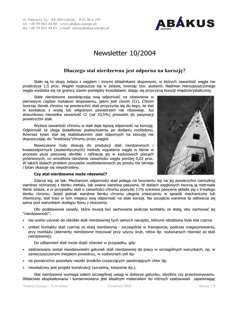 ul. Harcerzy 2c, 84-300 Lębork, P.O. Box 181 tel. +48 59 863 44 60 www.abakus-europe.pl fax +48 59 863 44 61 e-mail: [email protected] Newsletter 10/2004 Dlaczego stal nierdzewna jest odporna na korozję? Stale są to stopy żelaza z węglem i innymi składnikami stopowymi, w których zawartość węgla nie przekracza 1,5 proc. Węgiel rozpuszcza się w żelazie, tworząc tzw. austenit. Nadmiar nierozpuszczonego węgla wydziela się na granicy ziaren pomiędzy kryształami, stając się przyczyną korozji międzykrystalicznej. Stale nierdzewne zawdzięczają swą odporność na rdzewienie w pierwszym rzędzie metalowi stopowemu, jakim jest chrom (Cr). Chrom tworząc tlenek chromu na powierzchni stali przyczynia się do tego, że stal w kontakcie z wodą lub wilgotnym powietrzem nie rdzewieje. Już stosunkowo niewielka zawartość Cr (od 10,5%) prowadzi do pasywacji powierzchni stali. Wyższa zawartość chromu w stali daje lepszą odporność na korozję. Odporność ta ulega dodatkowo podwyższeniu po dodaniu molibdenu. Również tytan stał się stabilizatorem stali odpornych na korozję nie dopuszczając do “kradzieży”chromu przez węgiel. Nowoczesne huty stosują do produkcji stali nierdzewnych i kwasoodpornych (austenitycznych) metody wypalania węgla w tlenie w procesie poza piecowej obróbki i rafinację jej w kadziowych piecach próżniowych, co umożliwia obniżenie zawartości węgla poniżej 0,02 proc. W takich stalach problem procesów wydzieleniowych po prostu nie istnieje i tytan okazuje się niepotrzebny. Czy stal nierdzewna może rdzewieć? Zdarza się, że tak. Mechanizm odporności stali polega na tworzeniu się na jej powierzchni cieniutkiej warstwy ochronnej z tlenku metalu, tak zwana warstwa pasywna. W stalach węglowych tworzą ją nietrwałe tlenki żelaza, a w przypadku stali o zawartości chromu powyżej 11% warstwa pasywna składa się z trwałego tlenku chromu. Jeżeli jednak warstwa tlenku chromu ulegnie zniszczeniu w sposób mechaniczny lub chemiczny, stal traci w tym miejscu swą odporność na atak korozji. Na szczęście warstwa ta odtwarza się sama pod warunkiem dostępu tlenu z otoczenia. Oto podstawowe zasady, które muszą być zachowane podczas kontaktu ze stalą, aby zachować jej "nierdzewność": • nie wolno używać do obróbki stali nierdzewnej tych samych narzędzi, którymi obrabiana była stal czarna • unikać kontaktu stali czarnej ze stalą nierdzewną - szczególnie w transporcie, podczas magazynowania, przy montażu (elementy nierdzewne mocować przy użyciu śrub, nitów itp. wykonanych również ze stali nierdzewnej). Do odbarwień stali może dojść również w przypadku, gdy: • zastosowany został nieodpowiedni gatunek stali nierdzewnej do pracy w szczególnych warunkach, np. w zanieczyszczonym miejskim powietrzu, w roztworach soli itp. • na powierzchni pozostały resztki środków czyszczących zawierających chlor itp. • niewłaściwy jest projekt konstrukcji (szczeliny, kieszenie itp.). Stal nierdzewna wymaga zatem szczególnej uwagi w doborze gatunku, obróbce czy przechowywaniu. Właściwie eksploatowana i konserwowana jest idealnym materiałem do różnych zastosowań zapewniając Abakus Europe - Newsletter .Grudzień 2004 Strona 1/9 ul. Harcerzy 2c, 84-300 Lębork, P.O. Box 181 tel. +48 59 863 44 60 www.abakus-europe.pl fax +48 59 863 44 61 e-mail: [email protected] wieloletnie bezawaryjne użytkowanie wykonanych z niej elementów Proces korozji stali nierdzewnej jest bardzo długi i zależy od rodzaju środowiska, w którym eksploatowane jest urządzenie. W warunkach w jakich eksploatuje się jachty, głównym czynnikiem korozyjnym są związki chloru (pochodzące z wody morskiej). Powodują one korozję wżerową. Stale 316 i 316L, z molibdenem w składzie, charakteryzują się bardzo dużą odpornością na korozję wżerową w środowisku morskiej wody (zawiera dużo chlorków). Stale ferrytyczno-austenityczne Duplex są trudniejsze do spawania, ale ich właściwości mechaniczne są znacznie wyższe, bowiem ich wytrzymałość doraźna na rozciąganie jest nawet o 50proc. wyższa niż stali austenitycznych, choć plastyczność zdecydowanie niższa.1 2 Przegląd prasy: 2004-12-13: Polskie huty stali wypracują rekordowy zysk w 2004 r. (PAP, pr /2004-12-13) Produkcja stali wyższa o ok. 20 proc., średnio o 60 proc. wyższe ceny wyrobów, mniejsze o jedną trzecią długi i zysk brutto sięgający 2 mld zł - tak, według Hutniczej Izby PrzemysłowoHandlowej (HIPH), polskie huty żelaza i stali zamkną 2004 rok. Wzrost popytu i cen zapewnił w tym roku hutom wysokie zyski. HIPH szacuje, że wszyscy polscy wytwórcy stali zamkną rok dodatnimi wynikami. Po wrześniu łączny zysk brutto spółek hutniczych sięga 2 mld zł, wobec 50 mln zł straty w tym samym czasie 2003 r.; prawdopodobnie w końcu 2004 zysk będzie nieco mniejszy, m.in. z powodu umocnienia złotego. Rentowność hut brutto wyniosła 11,6 proc., a netto 9,6 proc. Różnica zobowiązań i należności zmniejszyła się z ponad 7 mld zł 1,5 roku temu do ok. 2,5 mld zł obecnie. Poprawa sytuacji finansowej sektora to - w ocenie Izby -także efekt dużej dyscypliny w zakresie obniżki kosztów w hutach. W ciągu trzech kwartałów przychody hut wzrosły o 50 proc., a koszty o 38 proc. Pozytywny obraz zakłóca, w ocenie Izby, ciągle zbyt wolne tempo realizacji niezbędnych inwestycji. "Niektórzy inwestorzy rozpoczęli inwestycje, inni są na etapie przygotowań. Koniunktura sprzyja inwestycjom, ale bardzo istotny jest tu czas, tym bardziej, że konkurencja nie śpi. Realizacja inwestycji poprawiłaby strukturę produkcji polskich hut na korzyść wyrobów wysokoprzetworzonych, które dziś dominują we wciąż rosnącym imporcie" - powiedział PAP prezes HIPH, Romuald Talarek. Po trzech kwartałach tego roku import wyrobów stalowych do Polski wzrósł o 19 proc., polski eksport o 30 proc. Choć polskie huty wysyłają za granicę ponad 0,6 m