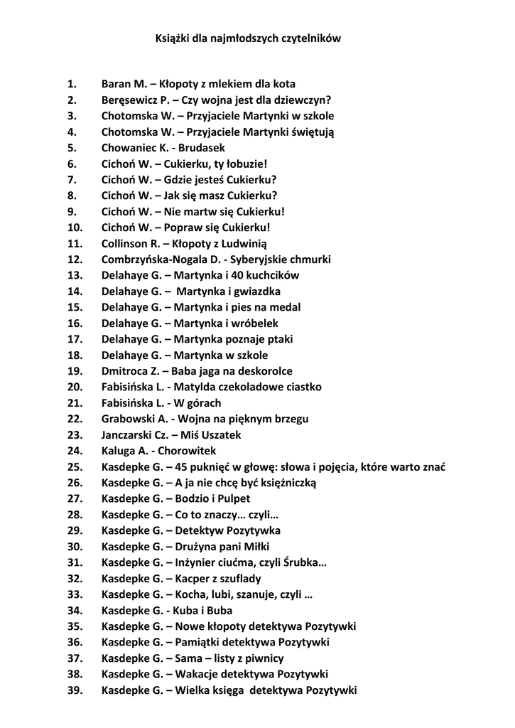 Książki dla najmłodszych czytelników 1. 2. 3. 4. 5. 6. 7. 8. 9. 10. 11. 12. 13. 14. 15. 16. 17. 18. 19. 20. 21. 22. 23. 24. 25. 26. 27. 28. 29. 30. 31. 32. 33. 34. 35. 36. 37. 38. 39. Baran M. – Kłopoty z mlekiem dla kota Beręsewicz P. – Czy wojna jest dla dziewczyn? Chotomska W. – Przyjaciele Martynki w szkole Chotomska W. – Przyjaciele Martynki świętują Chowaniec K. - Brudasek Cichoń W. – Cukierku, ty łobuzie! Cichoń W. – Gdzie jesteś Cukierku? Cichoń W. – Jak się masz Cukierku? Cichoń W. – Nie martw się Cukierku! Cichoń W. – Popraw się Cukierku! Collinson R. – Kłopoty z Ludwinią Combrzyńska-Nogala D. - Syberyjskie chmurki Delahaye G. – Martynka i 40 kuchcików Delahaye G. – Martynka i gwiazdka Delahaye G. – Martynka i pies na medal Delahaye G. – Martynka i wróbelek Delahaye G. – Martynka poznaje ptaki Delahaye G. – Martynka w szkole Dmitroca Z. – Baba jaga na deskorolce Fabisińska L. - Matylda czekoladowe ciastko Fabisińska L. - W górach Grabowski A. - Wojna na pięknym brzegu Janczarski Cz. – Miś Uszatek Kaluga A. - Chorowitek Kasdepke G. – 45 puknięć w głowę: słowa i pojęcia, które warto znać Kasdepke G. – A ja nie chcę być księżniczką Kasdepke G. – Bodzio i Pulpet Kasdepke G. – Co to znaczy… czyli… Kasdepke G. – Detektyw Pozytywka Kasdepke G. – Drużyna pani Miłki Kasdepke G. – Inżynier ciućma, czyli Śrubka… Kasdepke G. – Kacper z szuflady Kasdepke G. – Kocha, lubi, szanuje, czyli … Kasdepke G. - Kuba i Buba Kasdepke G. – Nowe kłopoty detektywa Pozytywki Kasdepke G. – Pamiątki detektywa Pozytywki Kasdepke G. – Sama – listy z piwnicy Kasdepke G. – Wakacje detektywa Pozytywki Kasdepke G. – Wielka księga detektywa Pozytywki 40. 41. 42. 43. 44. 45. 46. 47. 48. 49. 50. 51. 52. 53. 54. 55. 56. 57. 58. 59. 60. 61. 62. 63. 64. 65. 66. 67. 68. 69. 70. 71. 72. 73. 74. 75. 76. 77. 78. 79. 80. Kasdepke G. – Potworak i inne kosmiczne opowieści Krzemieniecka L. – Z przygód krasnala Hałabały Landau I. - Jaś i zaczarowany przyjaciel Letki E. – Czarusia Majgier K. – Idę do zerówki Majgier K. – Dzieciństwo jest super Majgier K. – Nowi sąsiedzi Nowak E. – Apollo 11 Olech J. - Arcybolek Olech J. – Mam prawo i nie zawaham się go użyć! Olech J. – Tytus – superpies Olech J. - Tytus w cyrku Onichimowska A. – Czas meteorów Ostrowicka E. - Sen Maciusia Ostrowska E. - Pierścioneczek Ostrowska E. - Mamusia i krokodyl Park B. – Zuźka D. Zołzik żegna zerówkę Park B. – Zuźka D. Zołzik imprezuj, Park B. – Zuźka D. Zołzik jest wyjątkowa Park B. – Zuźka D. Zołzik pierwszakiem Park B. – Z deszczu pod rynnę Park B. – Katastrofa morska Park B. – Głupi królik Park B. – Pada śnieg, pies się wściekł Park B. – Szachrajka Park B. – Narodziny gwiazdy Park B. – Bu… Bój się Pawłowska A. - Tygrysek Erwinek Piotrowaka E. - Tupcio Chrupcio: Kapryśna myszka, Piotrowaka E. - Tupcio Chrupcio: Wizyta u dziadków, Piotrowaka E. - Tupcio Chrupcio: Nie dam sobie dokuczać, Piotrowaka E. - Tupcio Chrupcio: Umiem się dzielić Schneider L. – Zuzia i jej kotek Schneider L. – Zuzia jest chora Schneider L. – Zuzia jeździ konno Schneider L. – Zuzia na plaży Schneider L. – Zuzia nocuje u Julii Schneider L. – Zuzia nie korzysta z pomocy nieznajomego Schneider L. – Zuzia piecze pizzę Schneider L. – Zuzia pomaga mamie Schneider L. – Zuzia w szpitalu 81. 82. 83. 84. 85. 86. 87. 88. 89. 90. 91. 92. 93. 94. 95. Schneider L. – Zuzia idzie do przedszkola Sobolewska M. – Moje ciało należy do mnie! Strumiłło-Miłosz G. – Dundzia, Franek i przyjaciele Sumińska D. - Dlaczego oczy kota świecą nocą Święcicka W. – Alicja i leśna gromadka Święcicka W. - Najmłodsza dżokejka Święcicka W. - Nasz przyjaciel delfin Tielmann Ch. – Maks nie rozmawia z obcymi Webb H. - dzielny mały Karmel Webb H. - Gdzie jest Rudek Webb H. - Kto pokocha psotkę Webb H. - Kto uratuje Iryska Webb H. - Porwanie małej Mili Webb H. - Reks, szczeniak z wakacji Webb H. - Smyk, uprowadzony szczeniak