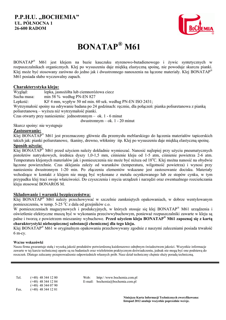 P.P.H.U. „BOCHEMIA” UL. PÓŁNOCNA 1 26-600 RADOM BONATAP® M61 BONATAP® M61 jest klejem na bazie kauczuku styrenowo-butadienowego i żywic syntetycznych w rozpuszczalnikach organicznych. Klej po wysuszeniu daje miękką elastyczną spoinę, nie powoduje skurczu pianki. Klej może być stosowany zarówno do jedno jak i dwustronnego nanoszenia na łączone materiały. Klej BONATAP® M61 posiada słabo wyczuwalny zapach. Charakterystyka kleju: Wygląd: lepka, jasnożółta lub ciemnoróżowa ciecz Sucha masa: min 58 % według PN-EN 827 Lepkość: KF 4 mm, wypływ 50 ml min. 60 sek. według PN-EN ISO 2431; Wytrzymałość spoiny na odrywanie badana po 24 godzinach: ręcznie, dla połączeń: pianka poliuretanowa z pianką poliuretanową – wyższa niż wytrzymałość pianki. Czas otwarty przy naniesieniu: jednostronnym – ok. 1 - 6 minut dwustronnym – ok. 1 - 20 minut Skurcz spoiny: nie występuje Zastosowanie: Klej BONATAP® M61 jest przeznaczony głównie dla przemysłu meblarskiego do łączenia materiałów tapicerskich takich jak: pianki poliuretanowe, tkaniny, drewno, włókniny itp. Klej po wysuszeniu daje miękką elastyczną spoinę. Sposób użycia: Klej BONATAP® M61 przed użyciem należy dokładnie wymieszać. Nanosić najlepiej przy użyciu pneumatycznych pistoletów natryskowych, średnica dyszy 1,0-1,5 mm, ciśnienie kleju od 1-5 atm, ciśnienie powietrza 2-6 atm. Temperatura klejonych materiałów jak i pomieszczenia nie może być niższa od 18oC. Klej można nanosić na obydwie łączone powierzchnie. Czas sklejania zależy od warunków (temperatura, wilgotność powietrza) i wynosi przy naniesieniu dwustronnym 1-20 min. Po złączeniu elementów wskazane jest zastosowanie docisku. Materiały wchodzące w kontakt z klejem nie mogą być wykonane z metalu ocynkowanego lub ze stopów cynku, w tym przypadku klej traci swoje właściwości. Do czyszczenia i mycia urządzeń i narzędzi oraz ewentualnego rozcieńczania kleju stosować BONAROS M. Składowanie i warunki bezpieczeństwa: Klej BONATAP® M61 należy przechowywać w szczelnie zamkniętych opakowaniach, w dobrze wentylowanym pomieszczeniu, w temp. 5-25 oC z dala od grzejników c.o. W pomieszczeniach magazynowych i produkcyjnych, w których stosuje się klej BONATAP ® M61 urządzenia i oświetlenie elektryczne muszą być w wykonaniu przeciwwybuchowym, ponieważ rozpuszczalniki zawarte w kleju są palne i tworzą z powietrzem mieszaniny wybuchowe. Przed użyciem kleju BONATAP® M61 zapoznaj się z kartą charakterystyki niebezpiecznej substancji chemicznej dla tego kleju. Klej BONATAP® M61 w oryginalnym opakowaniu przechowywany zgodnie z naszymi zaleceniami posiada trwałość 6 m-cy. Ważne wskazówki Nasza firma gwarantuje stałą i wysoką jakość produktów potwierdzoną każdorazowo odrębnym świadectwem jakości. Wszystkie informacje zawarte w tej karcie technicznej oparte są na badaniach oraz wieloletnim praktycznym doświadczeniu, jednak nie mogą być one podstawą do roszczeń. Dlatego zalecamy przeprowadzenie odpowiednich własnych prób. Nasz dział techniczny chętnie służy poradą techniczną. Tel. Fax. (+48) (+48) (+48) (+48) 48 344 12 80 48 344 12 84 48 344 07 90 48 344 12 81 Web: http:/ /www.bochemia.com.pl E-mail: [email protected] Niniejsza Karta Informacji Technicznych zweryfikowana: listopad 2012 anuluje wszystkie poprzednie wersje.