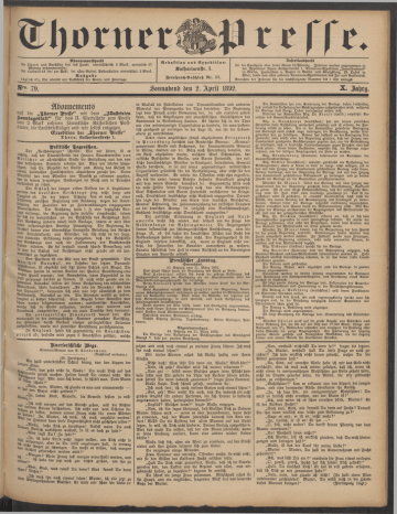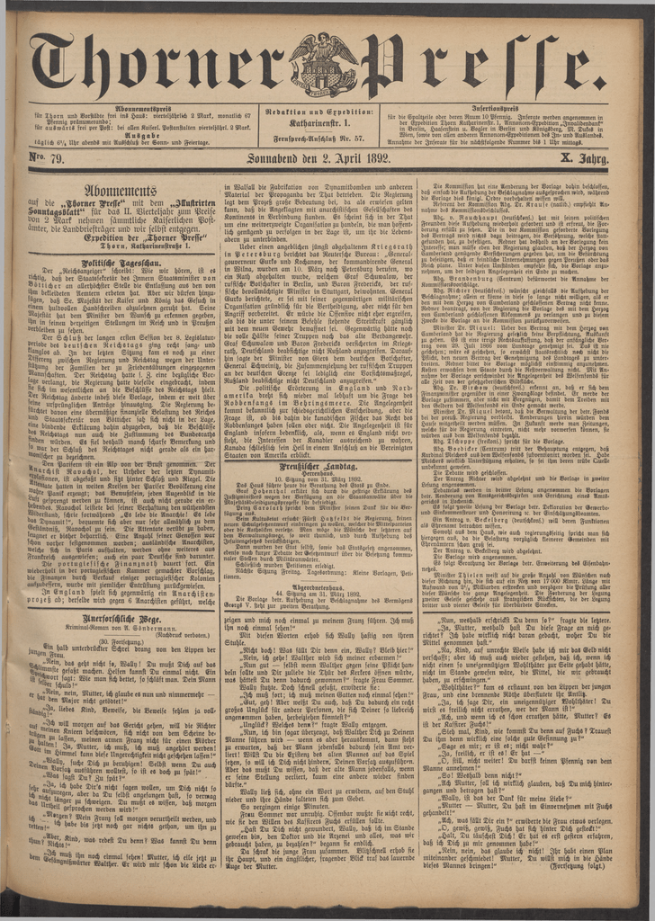 ÄH-nuemen18pve!A für T h o r n und Vorstädte frei ins H au s: vierteljährlich 2 M a r k , monatlich 67 Pfennig pränum erando; für a u s w ä r t s frei per Post: bei allen Kaiser!. Postanstalten vierteljährl. 2 M ark. Ausgabe tä g lic h 6 '/* U hr abends m it Ausschluß der S o n n - und Feiertage. ksr». 7g auf die „Thorn,r Fresse" m it dem „Illustrirten Konntagsvkalt" für das II. V iertelja hr zum Preise von 2 M ark nehmen sämmtliche Kaiserlichen Post ämter, die Landbriefträger und w ir selbst entgegen. Expedition der „Thorner Presse" T h o r « , Katharinenstraste I. D er ,,R e ic h s ^ z e !g e r ^ s c h ^ b t^ ^ W ie " w ir hören, ist es ^chtig, daß der Staatssekretär des In n e rn S taatsm inister v o n B ö t t i c h e r an allerhöchster S telle die Entlassung aus den von ihm bekleideten Aemtern erbeten hat. Aber w ir dürfen hinzu legen, daß Se. Majestät der Kaiser und König das Gesuch in einem huldvollen Handschreiben abzulehnen geruht hat. Seine Majestät hat dem M in iste r den Wunsch zu erkennen gegeben, >hn in seinen derzeitigen S tellungen im Reich und in Preußen verbleiben zu sehen. D er S c h lu ß der langen ersten Session der 8. L e g isla tu r periode des d e u t s c h e n R e i c h s t a g s ging recht sang- und Uanglos ab. I n der letzten Sitzung kam es noch zu einer Differenz zwischen Regierung und Reichstag wegen der Untertützung der F am ilie n der zu Friedensübungen eingezogenen Mannschaften. D e r Reichstag hatte s. Z. eine bezügliche V o r ig e verlangt, die Regierung hatte dieselbe eingebracht, indem vk sich im wesentlichen an die Beschlüsse des Reichstags hielt. Der Reichstag änderte indeß diese V orlage, indem er weit über isine ursprünglichen Anträge hinausging. D ie Regierung bemrchtet davon eine übermäßige finanzielle Belastung des Reiches Und Staatssekretär von Bötticher sah sich nicht in der Lage, eine bindende Erklärung dahin abzugeben, daß die Beschlüsse °es Reichstags nun auch die Zustim m ung des Bundesraths nnden würden. Es fiel deshalb manch scharfe Bemerkung und war der Schluß des Reichstages nicht gerade als ein har monischer zu bezeichnen. 2, Den P arisern ist ein A lp von der B rust genommen. D e r A n a rc h is t R a v a c h o l , der Urheber der letzten D yn a m itM o fio n e n , ist abgefaßt und fitzt hinter Schloß und Riegel. D ie M "ate hatten in weiten Kreisen der P ariser Bevölkerung eine vahre P anik erzeugt; das Bewußtsein, jeden Augenblick in die ^ u ft gesprengt werden zu können, ist auch nicht gerade ein er hebendes. Ravachol leistete bei seiner Verhaftung den wüthendsten Widerstand, schrie fortwährend „E s lebe die Anarchie! Es lebe ^ s D y n a m it!" , bequemte sich aber n u r sehr allmählich zu dem ^eständniß, Ravachol zu sein. D ie Attentate verübt zu haben, leugnet er bisher beharrlich. Eine Anzahl seiner Genossen w ar ichon vorher festgenommen w orden; ausländische Anarchisten, welche sich in P a ris aufhalten, werden ohne weiteres aus Frankreich ausgewiesen; auch ein paar Deutsche find darunter. D ie p o r t u g i e s i s c h e F i n a n z n o t h dauert fo rt. E in wiederholt in der portugiesischen Kammer gemachter Vorschlag, die F in a n ze n durch Verkauf einiger portugiesischer Kolonien aufzubessern, wurde m it ziemliche, Entrüstung zurückgewiesen. I n E n g l a n d spielt sich gegenwärtig ein A n a r c h i s t enp r o z e ß ab; derselbe w ird gegen 6 Anarchisten geführt, welche Nnerforschliche ASege. Kriminal-Roman von A. S ö n d e r m a n n . ------------------(Nachdruck verboten.) . „ (30. Fortsetzung.) " Schrei drang von den Lippen de das geht nicht so, W a lly ! D u mußt Dich auf da. ^ n m m s te gefaßt machen. Helfen kannst D u einm al nicht. E i, ist s,? ^o rt sagt: W ie man sich bettet, so schläft man. D ein M a n , '"»er schuld!" er "» in , M u tte r, ich glaube es nu n und nim m erm ehr — den M a jo r nicht getödtet!" ständig?«' ^"E>es K in d , Beweise, die Beweise fehlen ja voll °us w'.?? morgen au f das Gericht gehen, w ill die Richte trüge» beschwören, sich nicht von dem Scheine be zu h a lt.« , «'»inen armen Franz nicht fü r einen Mörde Gott i«, M u tte r, ich muß, ich muß angehört werden m H im m el kann diese Ungerechtigkeit nicht geschehen lassen D ein.« m suche Dich zu beruhigen! Selbst wenn D u au. en Vorsatz ausführen wolltest, so ist es da doch zu sp ä t!" «Was sagst D u ? Z u spät?" sehr a u s« .? ^ D ir '« nicht sagen wollen, um Dich nicht j ich nicht da D u selbst angefangen hast, so verma das U r t l, . u " ^ r M schweigen. D u mußt es wissen, daß morge " " h e il gesprochen werden w ir d !" ich - reiten,« ^ Katharinenstr. 1. Fernsprech-Anschluß N r. 57. JnsertionSpreis für die Spaltzeile oder deren R aum 10 Pfennig. Inserate werden angenommen in der Expedition Thorn Katharinenstr. 1, Annoncenexpedition „Jnvalidendank" in B erlin , Haasenstein u. Vogler in B e rlin und Königsberg, M . Dukes in W ien, sowie von allen anderen Annoncen-Expeditionen des I n - und AuslandeS. Annahme der Inserate fü r die nächstfolgende Numm er bis 1 U h r mittags. Sonnabend den L. A pril 1892. Abonnements Mägen F ra R e d a k t i o n und E x p e d i t i o n : ^ e i n Franz soll morgen ve ru rth e ilt werden, un ^ b e bis jetzt noch gar nichts gethan, um ih n z i h u n ? ' " a s redest D u denn? W as kannst D u den dem cEsän!?«^ "°ch einm al sehen! M u tte r, ich eile jetzt j Nangnißwärter W alther. E r w ird m ir schon die Liebe e in W alsall die F abrikation von D ynam itbom ben und anderem ' M a te ria l der Propaganda der T h a t betrieben. D ie Regierung legt dem Prozeß große Bedeutung bei, da als erwiesen gellen kann, daß die Angeklagten m it anarchistischen Gesellschaften des K ontinents in Verbindung standen. Es scheint sich in der T h a t i um eine weitverzweigte Organisation zu handeln, die man hoffent lich genügend zu verfolgen in der Lage ist, um ih r die Lebens adern zu unterbinden. ! Ueber