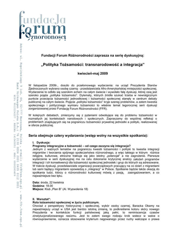 NIP: 9512224227 . REGON: 141045051 . KRS: 0000283409 Adres: ul. Kopcińskiego 9 lok. 44, 02-777 Warszawa, Polska . e-mail: [email protected] . www.ffr.free.ngo.pl Bank Volkswagen Polska S.A.: 76 2130 0004 2001 0435 0112 0001 Fundacji Forum Różnorodności zaprasza na serię dyskusyjną: „Polityka Tożsamości: transnarodowość a integracja” kwiecień-maj 2009 W listopadzie 2008r., doszło do przełomowego wydarzenia: na urząd Prezydenta Stanów Zjednoczonych wybrano osobę czarną - przedstawiciela Afro-Amerykańskiej mniejszości społecznej. Wydarzenie to odbiło się szerokim echem na całym świecie i wywołało falę dyskusji, której osią jest szeroko pojęta „polityka tożsamości”. Dylematy, których źródła szukać trzeba w newralgicznym punkcie przecięcia tożsamości jednostkowej i tożsamości społecznej stanęły w centrum debaty publicznej na całym świecie. Pojęcie „polityka tożsamości” kryje szereg problemów, a zatem kwestia społecznego i politycznego wymiaru tożsamości to właśnie temat tegorocznej serii dyskusji zorganizowanej przez Fundację Forum Różnorodności (FFR). W kolejnych debatach, zmierzymy się z pytaniami odwołujące się do problemu tożsamości w rozmaitych jej kontekstach narodowych i społecznych. Zapraszamy do wspólnej refleksji o problemach znajdujących się na pograniczu tożsamości prywatnej jednostki a polityki, realizowanej w sferze publicznej. Seria obejmuje cztery wydarzenia (wstęp wolny na wszystkie spotkania): I. Dyskusja: Programy integracyjne a tożsamość – od czego zaczyna się integracja? Jednym z ważnych tematów na pograniczu kwestii tożsamości i polityki to kwestia integracji migrantów i tworzenia spójnego społeczeństwa różnorodnego, a więc takiego w którym różnice religijne, kulturowe, etniczne traktuje się jako istotny „potencjał” a nie zagrożenie. Pierwsze wydarzenie w serii dyskusyjnej ma na celu dokonanie krytycznej analizy założeń programów integracji i ich konsekwencji dla tożsamości społecznej jednostek i grup do których są adresowane. W trakcie dyskusji, przedstawiciele organizacji pozarządowych pracujący na co dzień z migrantami lub sami będący migrantami opowiedzą o „integracji” w Polsce. Spotkanie będzie także okazją do spotkania ludzi, którzy o różnorodności kulturowej mówią z pasją, zaangażowaniem, a co najważniejsze bez lęku. Data: środa, 22 kwietnia Godzina: 18.00 Miejsce: Klub „Plan B” (Al. Wyzwolenia 18) II. Warsztat*: Rola tożsamości społecznej w życiu publicznym. Chociaż z perspektywy historycznej i społecznej, wybór osoby czarnej, Baracka Obamy na najważniejszy urząd w USA jest bardzo istotną zmianą, to podkreślanie koloru skóry nowego Prezydenta w kontekście funkcji państwowej jaką pełni, to reminiscencja czasów zinstytucjonalizowanego rasizmu. Jest to zatem swego rodzaju krok wstecz w walce o równouprawnienie, oznacza stosowanie kryterium negowanego przez ruchy walczące o prawa obywatelskie mniejszości Afro-Amerykańskiej w Stanach. Ciesząc się, iż dokonał się taki postęp, jednocześnie, uznajemy, że jesteśmy wciąż daleko od ideału społeczeństwa różnorodnego, o którym tak pięknie mówił i marzył Martin Luther King Jr. Uczestnicy warsztatu przejdą interaktywny proces szukania odpowiedzi na pytania: dlaczego cechy, takie jak płeć czy rasa, mają wpływ na wybory polityczne jednostek? W jaki sposób informacja na temat przynależności społecznej modyfikuje postrzeganie ważnych bohaterów życia publicznego? Warsztat będzie podstawą do rozmowy o paradoksie przejawiającym się w dyskusji o wyborze Obamy. Data: sobota, 25 kwietnia Godzina: 15.00 Miejsce: Ogrodowa Café (ul. Ogrodowa 51, www.ogrodowacafe.com) *Liczba miejsc ograniczona. Zapraszamy osoby zainteresowane udziałem w warsztacie do przesłania zgłoszenia na adres: [email protected] do 22 kwietnia. III. Spotkanie: Pojęcie „rasy” w Europie i w Stanach Zjednoczonych – porównanie z perspektywy historycznej. Po wyborze Obamy na prezydenta Stanów Zjednoczonych, wielu komentatorów ogłosiło nadejście ery „post-rasowej”, w której różnice etniczne i koloru skóry nie mają znaczenia. W trakcie spotkania, dr Ewa Łuczak (Uniwersytet Warszawski) zastanowi się nad tym, jak dążenie do ideału spójnego społeczeństwa różnorodnego w USA powoduje pewien konflikt między perspektywą „uniwersalną" i wizją społeczeństwa „ponad-rasowego”, a perspektywą podkreślającą różnice etniczne i wykorzystujące do tego celu pojęcie „rasy”. Dr Łuczak przedstawi również różnice w sposobie traktowania pojęcia „rasy” w Stanach i w Europie. Data: czwartek, 21 maja Godzina: 19.00 Miejsce: Res Publica Nowa (ul. Gałczyńskiego 5) IV. Dyskusja: Diaspora i Tożsamość – Polacy od Stanów do Anglii. Dr Michał Garapich (CRONEM, University of Surrey) i dr Anna Sosnowska (Uniwersytet Warszawski), przedstawią wyniki swoich badań nad społecznościami polskimi w USA i w Anglii. Dyskusja będzie próbą odpowiedzi na pytania: jak Polacy w Stanach Zjednoczonych i w Anglii definiują swoją tożsamość? Co oznacza dla nich „polskość”? Jak postrzeganie własnej tożsamości zmienia się pod wpływem doświadczenia migracji i sytuacji społecznej w nowym kraju? W jakich kontekstach społecznych nagłaśniają Polacy swoją tożsamość i w jakim celu? Data: piątek, 29 maja Godzina: 18.00 Miejsce: Res Publica Nowa (ul. Gałczyńskiego 5) Seria dyskusyjna odbywa się w ramach Programu FFR „Dialog” i realizowana jest dzięki wsparciu Ambasady Amerykańskiej w Warszawie. Więcej informacji o FFR: www.ffr.org.pl