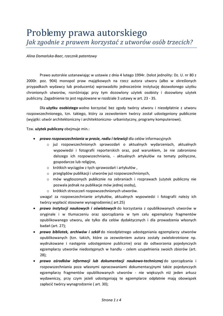 Problemy prawa autorskiego Jak zgodnie z prawem korzystać z utworów osób trzecich? Alina Domańska‐Baer, rzecznik patentowy Prawo autorskie ustanawiając w ustawie z dnia 4 lutego 1994r. (tekst jednolity: Dz. U. nr 80 z 2000r. poz. 904) monopol praw majątkowych na rzecz autora utworu (albo w określonych przypadkach wydawcy lub producenta) wprowadziło jednocześnie instytucję dozwolonego użytku chronionych utworów, rozróżniając przy tym dozowlony użytek osobisty i dozowlony użytek publiczny. Zagadnienie to jest regulowane w rozdziale 3 ustawy w art. 23 ‐ 35. Dla użytku osobistego wolno korzystać bez zgody twórcy utworu i nieodpłatnie z utworu rozpowszechnionego, tzn. takiego, który za zezwoleniem twórcy został udostępniony publicznie (wyjątki: utwór architektoniczny i architektoniczno‐ urbanistyczny, programy komputerowe). Tzw. użytek publiczny obejmuje min.: • • • • prawo rozpowszechniania w prasie, radiu i telewizji dla celów informacyjnych o już rozpowszechnionych sprawozdań o aktualnych wydarzeniach, aktualnych wypowiedzi i fotografii reporterskich oraz, pod warunkiem, że nie zabroniono dalszego ich rozpowszechniania, ‐ aktualnych artykułów na tematy polityczne, gospodarcze lub religijne, o krótkich wyciągów z tych sprawozdań i artykułów , o przeglądów publikacji i utworów już rozpowszechnionych, o mów wygłoszonych publicznie na zebraniach i rozprawach (użytek publiczny nie pozwala jednak na publikacje mów jednej osoby), o krótkich streszczeń rozpowszechnionych utworów. uwaga! za rozpowszechnianie artykułów, aktualnych wypowiedzi i fotografii należy ich twórcy wypłacić stosowne wynagrodzenie;( art.25) prawo instytucji naukowych i oświatowych do korzystania z opublikowanych utworów w oryginale i w tłumaczeniu oraz sporządzania w tym celu egzemplarzy fragmentów opublikowanego utworu, ale tylko dla celów dydaktycznych i dla prowadzenia własnych badań (art. 27); prawo bibliotek, archiwów i szkół do nieodpłatnego udostępniania egzemplarzy utworów opublikowanych (tzn. takich, które za zezwoleniem autora zostały zwielokrotnione np. wydrukowane i następnie udostępnione publicznie) oraz do odtworzenia pojedynczych egzemplarzy utworów niedostępnych w handlu ‐ celem uzupełnienia swoich zbiorów (art. 28); prawo ośrodków informacji lub dokumentacji naukowo‐technicznej do sporządzania i rozpowszechniania poza własnymi opracowaniami dokumentacyjnymi także pojedynczych egzemplarzy fragmentów opublikowanych utworów ‐ nie większych niż jeden arkusz wydawniczy, przy czym jeżeli udostępniają te egzemplarze odpłatnie mają obowiązek zapłacić twórcy wynagrodzenie ( art. 30); Strona 1 z 4 • prawo cytatu ‐ zgodnie z którym wolno bez zgody autora przytaczać w utworach stanowiących samoistną całość urywki rozpowszechnionych utworów lub drobne utwory w całości, w zakresie uzasadnionym wyjaśnianiem, analizą krytyczną, nauczaniem lub prawami gatunku twórczości, a także w celach dydaktycznych i naukowych wolno zamieszczać rozpowszechnione drobne utwory lub fragmenty większych utworów w podręcznikach i wypisach, przy czym wówczas cytowanemu twórcy przysługuje prawo do wynagrodzenia (art.29). Pamiętać należy, że programy komputerowe mogą być wykorzystywane we własnym utworze na warunkach dozwolonego użytku publicznego tylko na zasadach prawa cytatu tzn. utwór w którym program jest cytowany jest utworem samoistnym, a przytoczenie jego fragmentu jest niezbędne dla wyjaśnienia, analizy lub nauczania. Ustawodawca wyłączył bowiem w stosunku do programów komputerowych przywilej dozwolonego użytku z przytoczonych wyżej artykułów: 27, 28 i 30. Warto również wiedzieć, że w Polsce fotografie korzystają z ochrony prawem autorskim dopiero od roku 1994. Pod rządami ustawy o prawie autorskim z roku 1952 korzystały tylko te fotografie, które były oznaczone literką Ó (copyright). Osoba korzystająca z prawa dozwolonego użytku nie musi wprawdzie uzyskiwać zgody cytowanego autora, ale ma obowiązek wymienienia twórcy i źródła cytowanego fragmentu (art. 34) z tym, że ustawodawca nie precyzuje sposobu w jaki ten obowiązek ma być zrealizowany. Sąd Najwyższy w orzeczeniu z 29.12.1971r. wypowiedział zaakceptowany w doktrynie pogląd, że "wymaganiu wyraźnego wymienienia źródła, z którego pochodzi fragment cudzego dzieła nie czyni zadość wymienienie tego dzieła w zestawieniu literatury bez jakiegokolwiek wyjaśnienia ani zasady, ani stopnia wykorzystania tego dzieła" (OSN1972 nr 7‐8 poz.133). Zwyczajowo wymaga się, by bądź bezpośrednio przy cytowanym fragmencie, bądź w przypisach podać: nazwisko autora, tytuł publikacji, stronę, na której znajduje się zapożyczony materiał, nazwę wydawnictwa oraz rok wydania, ewentualnie, przy wykorzystaniu materiałów prasowych, tytuł periodyku, nr i datę egzemplarza, w którym wydrukowany został zapożyczony materiał. Jeżeli zapożyczenie z cudzego utworu wykracza poza zakres użytku dozwolonego zawsze wymagana jest zgoda autora, wydawnictwa lub producenta utworu, z którego autor późniejszej publikacji zamierza skorzystać. Twórca utworu zapożyczonego ma także prawo do wynagrodzenia, z którego jednak może zrezygnować, jeżeli strony ustalą to we wzajemnym porozumieniu. Wyjątek od tej zasady zawiera art. 33, zgodnie z którym można opublikować w encyklopediach i atlasach utwory plastyczne i fotograficzne bez zgody twórcy, o ile nawiązanie porozumienia z twórcą celem uzyskania jego zezwolenia napotyka trudne do przezwyciężenia przeszkody. Nie zwalnia to jednak wydawcy atlasu lub encyklopedii od zapłacenia twórcy wynagrodzenia. Konieczność pozyskiwania zgody na korzystanie z cudzych utworów rodzi dwa podstawowe pytania: • • w zakresie czyich obowiązków leży uzyskanie takiej zgody? jak praktycznie ją pozyskiwać?. Strona 2 z 4 Ani samo prawo autorskie ani przepisy 
