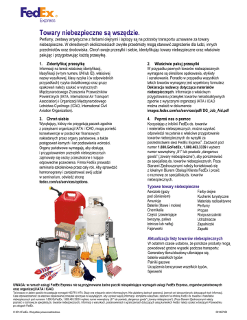 Towary niebezpieczne są wszędzie. Perfumy, zestawy artystyczne z farbami olejnymi i laptopy są na potrzeby transportu uznawane za towary niebezpieczne. W określonych okolicznościach zwykłe przedmioty mogą stanowić zagrożenie dla ludzi, innych przedmiotów oraz środowiska. Chroń swoje przesyłki i siebie, identyfikując towary niebezpieczne oraz właściwie pakując i przygotowując każdą przesyłkę. 1. Zidentyfikuj przesyłkę 2. Właściwie pakuj przesyłki Informacji na temat właściwej identyfikacji, klasyfikacji (w tym numeru UN lub ID), właściwej nazwy wysyłkowej, klasy ryzyka i (w odpowiednich przypadkach) ryzyka dodatkowego oraz grupy opakowań należy szukać w wytycznych Międzynarodowego Zrzeszenia Przewoźników Powietrznych (IATA, International Air Transport Association) i Organizacji Międzynarodowego Lotnictwa Cywilnego (ICAO, International Civil Aviation Organization). W przypadku pewnych towarów niebezpiecznych wymagane są określone opakowania, etykiety i oznakowanie. Ponadto w przypadku wszystkich takich towarów wymagany jest wypełniony formularz Deklaracja nadawcy dotycząca materiałów niebezpiecznych. Informacje o właściwym przygotowaniu przesyłek towarów nieradioaktywnych zgodnie z wytycznymi organizacji IATA i ICAO można znaleźć w dokumencie images.fedex.com/us/services/pdf/ DG_Job_Aid.pdf 3. Chroń siebie 4. Poproś nas o pomoc Wysyłający, którzy nie przygotują paczek zgodnie z przepisami organizacji IATA i ICAO, mogą ponieść konsekwencje w postaci kar finansowych nakładanych przez organy państwowe, a także postępowań karnych i kar pozbawienia wolności. Organy państwowe wymagają, aby obsługą i przygotowaniem przesyłek niebezpiecznych zajmowały się osoby przeszkolone i mające odpowiednie pozwolenia. Firma FedEx prowadzi seminaria szkoleniowe przez cały rok. Aby sprawdzić harmonogramy i zarejestrować swój udział w seminarium, odwiedź stronę fedex.com/us/services/options. Korzystając z infolinii FedEx ds. towarów i materiałów niebezpiecznych, można uzyskać odpowiedzi na pytania o właściwe przygotowanie towarów niebezpiecznych do wysyłki za pośrednictwem sieci FedEx Express®. Zadzwoń pod numer 1.800.GoFedEx, 1.800.463.3339 i wybierz numer wewnętrzny „81” lub powiedz „dangerous goods” („towary niebezpieczne”), aby porozmawiać ze specjalistą ds. towarów niebezpiecznych. Poza Stanami Zjednoczonymi należy kontaktować się z lokalnym Biurem Obsługi Klienta FedEx i prosić o rozmowę ze specjalistą ds. towarów niebezpiecznych. Typowe towary niebezpieczne Aerozole (gazy pod ciśnieniem) Amunicja Baterie (litowe i mokre) Chemikalia Części (zawierające benzynę, paliwo lotnicze lub naftę) Fajerwerki Farby olejne Kuchenki turystyczne Materiały radioaktywne Perfumy Propan Rozpuszczalniki Udrażniacze Zapalniczki Zapałki Aktualizacja listy towarów niebezpiecznych W ostatnim czasie ustalono, że poniższe produkty mogą powodować groźne wypadki podczas transportu: Generatory tlenu/obudowy utleniające się, baterie wszelkich typów Palniki gazowe Urządzenia benzynowe wszelkich typów, fajerwerki UWAGA: w ramach usługi FedEx Express nie są przyjmowane żadne paczki niespełniające wymagań usługi FedEx Express, organów państwowych oraz organizacji IATA i ICAO. Ta broszura w żaden sposób nie zastępuje wymagań 49CFR i IATA. Służy ona wyłącznie celom informacyjnym. Nie udzielamy żadnych gwarancji, jawnych ani dorozumianych, dotyczących tych informacji. Cała odpowiedzialność za właściwe zapakowanie przesyłek spoczywa na wysyłającym. Aby uzyskać więcej informacji i kompletne wskazówki, zadzwoń na infolinię FedEx ds. towarów i materiałów niebezpiecznych pod numerem 1.800.GoFedEx, 1.800.463.3339 i wybierz numer wewnętrzny „81” lub powiedz „dangerous goods” („towary niebezpieczne”). (Poza Stanami Zjednoczonymi należy poprosić o rozmowę ze specjalistą ds. towarów niebezpiecznych). Informacji o warunkach, postanowieniach i ograniczeniach dotyczących usług kurierskich FedEx należy szukać w bieżącym Przewodniku po usługach FedEx. ® © 2014 FedEx. Wszystkie prawa zastrzeżone. 0014274DI