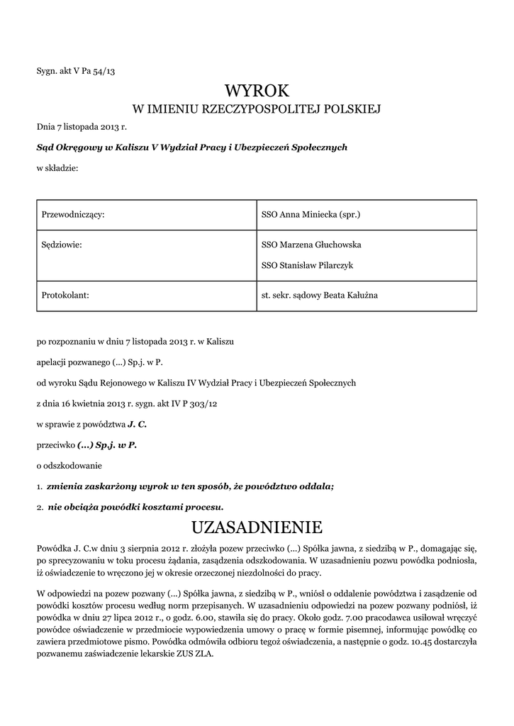 Sygn. akt V Pa 54/13 WYROK W IMIENIU RZECZYPOSPOLITEJ POLSKIEJ Dnia 7 listopada 2013 r. Sąd Okręgowy w Kaliszu V Wydział Pracy i Ubezpieczeń Społecznych w składzie: Przewodniczący: SSO Anna Miniecka (spr.) Sędziowie: SSO Marzena Głuchowska SSO Stanisław Pilarczyk Protokolant: st. sekr. sądowy Beata Kałużna po rozpoznaniu w dniu 7 listopada 2013 r. w Kaliszu apelacji pozwanego (...) Sp.j. w P. od wyroku Sądu Rejonowego w Kaliszu IV Wydział Pracy i Ubezpieczeń Społecznych z dnia 16 kwietnia 2013 r. sygn. akt IV P 303/12 w sprawie z powództwa J. C. przeciwko (...) Sp.j. w P. o odszkodowanie 1. zmienia zaskarżony wyrok w ten sposób, że powództwo oddala; 2. nie obciąża powódki kosztami procesu. UZASADNIENIE Powódka J. C.w dniu 3 sierpnia 2012 r. złożyła pozew przeciwko (...) Spółka jawna, z siedzibą w P., domagając się, po sprecyzowaniu w toku procesu żądania, zasądzenia odszkodowania. W uzasadnieniu pozwu powódka podniosła, iż oświadczenie to wręczono jej w okresie orzeczonej niezdolności do pracy. W odpowiedzi na pozew pozwany (...) Spółka jawna, z siedzibą w P., wniósł o oddalenie powództwa i zasądzenie od powódki kosztów procesu według norm przepisanych. W uzasadnieniu odpowiedzi na pozew pozwany podniósł, iż powódka w dniu 27 lipca 2012 r., o godz. 6.00, stawiła się do pracy. Około godz. 7.00 pracodawca usiłował wręczyć powódce oświadczenie w przedmiocie wypowiedzenia umowy o pracę w formie pisemnej, informując powódkę co zawiera przedmiotowe pismo. Powódka odmówiła odbioru tegoż oświadczenia, a następnie o godz. 10.45 dostarczyła pozwanemu zaświadczenie lekarskie ZUS ZLA. Wyrokiem z dnia 16 kwietnia 2013 roku, w sprawie o sygn. akt IV P 303/12, Sąd Rejonowy w Kaliszu zasądził od pozwanego (...) Spółka jawna, z siedzibą w P., na rzecz powódki kwotę 4.713,90 zł tytułem odszkodowania za niezgodne z prawem wypowiedzenie umowy o pracę, rozstrzygnął o kosztach postępowania i nadał wyrokowi rygor natychmiastowej wykonalności, co do kwoty 1.571,30 zł zasądzonej w punkcie 1 wyroku. Powyższy wyrok zapadł w oparciu o następujący stan faktyczny: Powódka J. C.w dniu 21 maja 2001 r. zawarła z poprzednikiem prawnym pozwanego (...) Spółka cywilnaZakład Pracy (...)w P.umowę o pracę na czas określony do dnia 31 grudnia 2010 r. Po czym z powódką pozwany zawierał kolejne umowy na czas określony. W dniu 09 grudnia 2011 r. strony zawarły aneks do umowy o pracę wskazując, iż łączy ich umowa o pracę na czas nieokreślony od dnia 22 sierpnia 2011 r. Powódka wykonywała pracę na terenie zakładu pozwanego w P.w Dziale Reklamacji na pakowni na stanowisku magazynier-pakowacz. Do jej obowiązków należało przepakowywanie towaru i sprawdzenie tego towaru – artykułów agd typu szklanki, talerze i przejrzenie tego towaru. W dziale tym, razem z powódką, na tym samym stanowisku pracy pracowały J. K., J. N., L. W., I. W.i M. L.. Wszystkie panie są zatrudnione na umowę o pracę na czas określony. Z tym, że J. K.umowę o pracę na czas określony w dniu 26 maja 2008 r. zawarła z firmą (...) Spółka cywilnaz siedzibą w P., której wspólnikami byli wspólnicy pozwanej spółki jawnej – J. M.i M. M., zaś w dniu 31 października 2012 r. umowę o pracę na czas określony od 1 listopada 2012 r. do dnia 31 grudnia 2021 r. z J. M.prowadzącym działalność gospodarczą o nazwie (...). J. K.nie jest jedynym pracownikiem wykonującym pracę na terenie zakładu pozwanego, zatrudnionym przez inną firmę niż pozwana spółka. Powódka w dniu 27 lipca 2012 r. stawiła się do pracy o godz. 6.00. Podpisała listę obecności. Przebrała się w strój roboczy i udała się na pakownię do swojego stanowiska pracy. Nikomu nie zgłaszała, aby się źle czuła czy była chora, a tym bardziej aby dysponowała zaświadczeniem lekarskim ZUS ZLA stwierdzającym jej niezdolność do pracy. Po stawieniu się na pakowni powódka została poproszona przez kierownika działu reklamacji Z. K.do pomieszczenia socjalnego, gdzie wręczyła powódce oświadczenie w przedmiocie wypowiedzenia umowy o pracę. Powódka przeczytała przedmiotowe pismo. Po czym je oddała i odmówiła potwierdzenia swoim podpisem, iż takie pismo jej wręczono. Jako przyczynę uzasadniającą wypowiedzenie umowy o pracę pozwany wskazał redukcję etatu z powodu likwidacji stanowiska pracy magazynier-pakowacz. Po wręczeniu wypowiedzenia powódka opuściła zakład pracy pozwanego, a następnie, w tym samym dniu, dostarczyła zaświadczenie lekarskie ZUS ZLA, stwierdzające jej niezdolność do pracy za okres od dnia 26 lipca 2012 r. do dnia 8 sierpnia 2012 r. z powodu choroby. Na miejsce powódki nie został przyjęty nowy pracownik. Pozwany wybrał powódkę do zwolnienia z uwagi na jej konfliktowy charakter i brak staranności w wykonywaniu obowiązków pracowniczych. Przeciętne miesięczne wynagrodzenie powódki wynosiło 1.571,30 zł. Powyższy stan faktyczny Sąd Rejonowy ustalił na podstawie zeznań świadków E. W. k. 77 v – 78, Z. K. k. 75 v – 76, 78 v, I. D. k. 102 v – 103, G. M. k. 103 – 104 v, S. L. k. 76 v, D. R. k. 76 v – 77, K. S. k. 77 – 77 v, M. P. k. 104 v – 105, oraz dokumentów w postaci akt osobowych powódki oraz akt osobowych J. N., L. W., M. L. i I. W., a także dokumentów na k. 30, 25 do 29, 54 do 56. Sąd odmówił wiary przesłuchaniu świadka G. M. co do okoliczności, iż wszystkie panie zatrudnione na tym samym stanowisku pracy co powódka, to pracownicy pozwanej spółki, albowiem twierdzenie świadka w sposób oczywisty pozostaje w sprzeczności z umową o pracę J. K. znajdującej się w jej aktach osobowych. Sąd ustalając przedmiotowy stan faktyczny pominął dowód z przesłuchania stron, albowiem w ocenie Sądu, w myśl art. 299 k.p.c., wszystkie okoliczności, istotne dla rozstrzygnięcia sprawy, zostały wyjaśnione. Ponadto strony, prawidłowo wezwane do osobistego stawiennictw