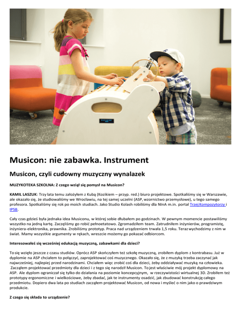 Musicon: nie zabawka. Instrument Musicon, czyli cudowny muzyczny wynalazek MUZYKOTEKA SZKOLNA: Z czego wziął się pomysł na Musicon? KAMIL LASZUK: Trzy lata temu założyłem z Kubą (Kozikiem – przyp. red.) biuro projektowe. Spotkaliśmy się w Warszawie, ale okazało się, że studiowaliśmy we Wrocławiu, na tej samej uczelni (ASP, wzornictwo przemysłowe), u tego samego profesora. Spotkaliśmy się rok po moich studiach. Jako Studio Kolash robiliśmy dla NInA m.in. portal Trzej Kompozytorzy i IPSB. Cały czas gdzieś była jednaka idea Musiconu, w której sobie dłubałem po godzinach. W pewnym momencie postawiliśmy wszystko na jedną kartę. Zaczęliśmy go robić pełnoetatowo. Zgromadziłem team. Zatrudniłem inżynierów, programistę, inżyniera-elektronika, prawnika. Zrobiliśmy prototyp. Praca nad urządzeniem trwała 1,5 roku. Teraz wychodzimy z nim w świat. Mamy wszystkie argumenty w rękach, wreszcie możemy go pokazać odbiorcom. Interesowałeś się wcześniej edukacją muzyczną, zabawkami dla dzieci? To się wzięło jeszcze z czasu studiów. Oprócz ASP skończyłem też szkołę muzyczną, zrobiłem dyplom z kontrabasu. Już w dyplomie na ASP chciałem to połączyć, zaprojektować coś muzycznego. Okazało się, że z muzyką trzeba zaczynać jak najwcześniej, najlepiej przed narodzinami. Chciałem więc zrobić coś dla dzieci, żeby oddziaływać muzyką na człowieka. Zacząłem projektować przedmioty dla dzieci i z tego się narodził Musicon. To jest właściwie mój projekt dyplomowy na ASP. Ale dyplom ograniczał się tylko do działania na poziomie koncepcyjnym, w rzeczywistości wirtualnej 3D. Zrobiłem też prototypy ergonomiczne i wielkościowe, żeby zbadać, jak te instrumenty osadzić, jak zbudować konstrukcję całego przedmiotu. Dopiero dwa lata po studiach zacząłem projektować Musicon, od nowa i myśleć o nim jako o prawdziwym produkcie. Z czego się składa to urządzenie? Musicon składa się w sumie z bardzo prostych elementów – z bębenka, z dzwonków (zwanych potocznie cymbałkami)i grzechotki – ale ich połączenie jest tutaj rzeczą wyjątkową. Sama forma i funkcjonalność to jego główne atuty. Musicon bazuje na podstawowych instrumentach Orffa, szeroko wykorzystywanych w edukacji muzycznej. To był naturalny wybór. Zaczęliśmy od trzech instrumentów, ale będziemy go rozbudowywać. Clou to sposób ich uruchamiania – bęben wyposażony w przyciski. Tymi przyciskami możemy na bieżąco budować ścieżkę dźwiękową. Dzieje się to naturalnie. Dziecko podchodząc do Musicona od razu rozumie, jak działa ten mechanizm, widzi kolorowe elementy, zaczyna je dotykać, wciskać, samo naturalnie zaczyna tworzyć muzykę. Można ją przyspieszać, zwalniać, wszystko dzieje się na bieżąco w trakcie grania. Jakie jeszcze instrumenty planujecie dodać? Na pewno najbardziej sprawdzają się instrumenty perkusyjne i tutaj mamy ich sporo rozpracowanych – grzechotki, guiro, talerze, gongi. Myślimy też o instrumentach dętych. Docelowo chcemy traktować Musicon jako platformę, która będzie miałą różne zastosowania. Np. jakieś elementy, które będą uczyć fizyki – choćby koparka, którą zakładamy na szynę. Jedna ścieżka uruchamia łyżkę, druga uruchamia podnoszenie, trzecia uruchamia obrót i wtedy możemy programować różne przedmioty albo urządzenia. Albo możemy zrobić teatrzyk – zamiast instrumentów założyć laleczki, każda będzie miała ruchome ręce, tułów, głowę i przyciskami możemy programować ich taniec albo interakcję między nimi. Możemy zrobić jakieś laboratorium fizyczne – możemy bardzo szeroko je rozbudowywać o różne przedmioty, które będzie można analogowo programować. ft. m ateriały promocyjne Czy planujecie masową produkcję Musiconu? Albo czy użytkownicy sami będą mogli projektować dodatkowe elementy? Jeszcze o tym nie myśleliśmy. Zakładaliśmy, co potwierdziło się w trakcie pracy, że bardzo istotna jest tutaj precyzja, dokładność wykonania. Przy analogowych elementach ciężko jest seryjnie,na dużą skalę produkować. To musi być ręcznie dostrajane, ręcznie precyzyjnie wykańczane. To nigdy nie będzie masówka. To jak produkcja fortepianu – precyzyjna robota. Czy wyobrażasz sobie, że Musicon będzie inspirujący dla zawodowych muzyków? Robiliśmy pierwsze testy z trzema zespołami. W czerwcu Musicon będzie wykorzystany w studiu do nagrania profesjonalnej płyty. Już jest jedno zamówienie od zespołu. Nie mogę jeszcze zdradzić kto, ale znana polska wokalistka zamawia Musicon na czerwiec. Możliwe więc, że już w czerwcu nasz wynalazek zaistnieje jako profesjonalny instrument na dwóch płytach. fot. materiały promocyjne Jaka jest wasza docelowa grupa wiekowa? Zajęcia z Patrykiem Zakrockim, które odbędą się w sobotę 4 czerwca w NInA przeznaczone są dla dzieci w wieku 5-8 lat… Zakładaliśmy, że wiek odbiorcy to będzie do trzech lat do ośmiu. Okazało się, że trzy- czterolatki świetnie sobie radzą z tym narzędziem, ale nie tylko, nawet nastolatki widzą w nim coś atrakcyjnego. Przy pracy nad prototypem córki inżyniera, z którym współpracujemy, w wieku dziesięciu i trzynastu lat tak wsiąkały w Musicon, że korzystały z każdej możliwości, żeby na nim pograć. Byłem zdziwiony, że nastolatka była tym „zajarana”. To było dla niej zdecydowanie odpowiednie – nie czuła się wcale zbyt dorosła, nie czuła, że to jest zabawka dla dzieci, tylko traktowała Musicon jak normalny instrument. Wydaje mi się, że dziecko, które będzie w stanie wciskać przyciski to dolna granica, a górnej granicy nie ma. Dorośli również chcą używać Musiconu jako instrumentu. Nie jest on zabawką, jest instrumentem. Jeśli chodzi o scenariusze zajęć – co może zainteresować nauczycieli – to na razie nad nimi pracujemy. Do tego potrzebowaliśmy w pełni działającego prototypu. Chcemy stworzyć ca