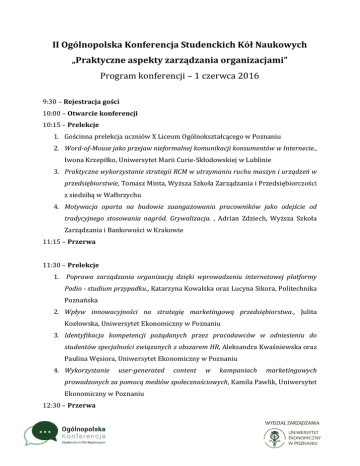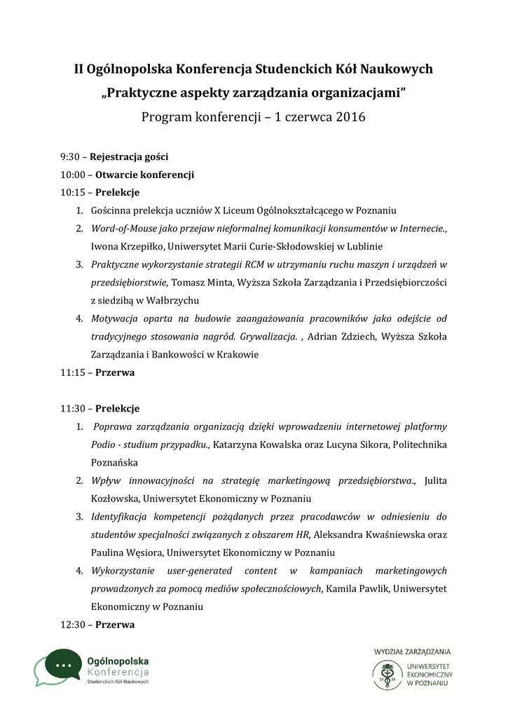 II Ogólnopolska Konferencja Studenckich Kół Naukowych „Praktyczne aspekty zarządzania organizacjami” Program konferencji – 1 czerwca 2016 9:30 – Rejestracja gości 10:00 – Otwarcie konferencji 10:15 – Prelekcje 1. Gościnna prelekcja uczniów X Liceum Ogólnokształcącego w Poznaniu 2. Word-of-Mouse jako przejaw nieformalnej komunikacji konsumentów w Internecie., Iwona Krzepiłko, Uniwersytet Marii Curie-Skłodowskiej w Lublinie 3. Praktyczne wykorzystanie strategii RCM w utrzymaniu ruchu maszyn i urządzeń w przedsiębiorstwie, Tomasz Minta, Wyższa Szkoła Zarządzania i Przedsiębiorczości z siedzibą w Wałbrzychu 4. Motywacja oparta na budowie zaangażowania pracowników jako odejście od tradycyjnego stosowania nagród. Grywalizacja. , Adrian Zdziech, Wyższa Szkoła Zarządzania i Bankowości w Krakowie 11:15 – Przerwa 11:30 – Prelekcje 1. Poprawa zarządzania organizacją dzięki wprowadzeniu internetowej platformy Podio - studium przypadku., Katarzyna Kowalska oraz Lucyna Sikora, Politechnika Poznańska 2. Wpływ innowacyjności na strategię marketingową przedsiębiorstwa., Julita Kozłowska, Uniwersytet Ekonomiczny w Poznaniu 3. Identyfikacja kompetencji pożądanych przez pracodawców w odniesieniu do studentów specjalności związanych z obszarem HR, Aleksandra Kwaśniewska oraz Paulina Węsiora, Uniwersytet Ekonomiczny w Poznaniu 4. Wykorzystanie user-generated content w kampaniach marketingowych prowadzonych za pomocą mediów społecznościowych, Kamila Pawlik, Uniwersytet Ekonomiczny w Poznaniu 12:30 – Przerwa 12:45 – Prelekcje gościnne 12:45-13:05 – Szymon Buchwald, Konsultant, Smart Project. 13:05-13:15 – Sebastian Bąkowski, prezentacja firmy Promag 13:15-14:00 – „Skuteczna komunikacja - źródło sukcesu projektów wdrożeń nowoczesnych rozwiązań w różnego typu magazynach., Jakub Dolata, Menedżer Kluczowych Projektów, Promag 14:30 – Obiad Karafka Bistro&Cafe 16:00 – Warsztaty: 1. Personal branding - czyli jak budować swoją markę na rynku pracy., Maciej Mazurek oraz Zuzanna Woźniak, Bee Talents (sala 111A, Gmach Główny) 2. Jak skutecznie stawiać cele, żeby osiągnąć sukces?, Agnieszka Maruda Sperczak, Instant Influence (sala 307A, Gmach Główny) 3. MS Excel - wykorzystanie programu podczas pracy analityka biznesowego., Szymon Buchwald, Smart Project (sala 7B, Budynek B) 18:00 – Afterparty w klubie Cooliozum Ul. Święty Marcin 45, pasaż różowy