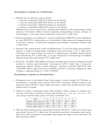Przykładowe zadania na I kolokwium: 1. Dłużnik ma do spłacenia cztery weksle: – o wartości nominalnej 2500 PLN płatny po 25 dniach, – o wartości nominalnej 5000 PLN płatny po 35 dniach, – o wartości nominalnej 7500 PLN płatny po 40 dniach, – o wartości nominalnej 10000 PLN płatny po 45 dniach. Dłużnik zwraca się do wierzyciela o zamianę tych weksli na jeden równoważny weksel płatny po 60 dniach. Oblicz wartość nominalną równoważnego weksla, wiedząc, że obowiązująca w tym dniu stopa dyskontowa wynosi 6% w skali roku. 2 Sześciotygodniowy bon skarbowy o wartości nominalnej 10000 PLN został zakupiony po cenie 9650 PLN i odsprzedany po 2 tygodniach. Jaką rentowność osiągnięto przez 2 tygodnie, wiedząc, że rentowność osiągnięta przez kolejne 4 tygodnie wyniosła 16% w skali roku? 3. Inwestor chce zainwestować wolne środki finansowe. Co jest dla niego korzystniejsze: nabycie w banku 6–miesięcznego certyfikatu oprocentowanego 7, 5% w skali roku i trzymanie go do dnia wykupu czy nabycie 4–miesięcznego certyfikatu depozytowego oprocentowanego 8% w skali roku, a po jego wykupieniu 2–miesięcznego certyfikatu depozytowego oprocentowanego 7% w skali roku? 4. W okresie 1.02.2009–28.02.2009 w sprzedaży dostępne były dwuletnie obligacje oszczędnościowe o stałym oprocentowaniu, wynoszącym 5,25% w skali roku z roczną kapitalizacją odsetek. Inwestor nabył obligacje o łącznym nominale 5000 PLN dnia 15.02.2009. Oblicz, jaką rentowność uzyskałby inwestor, trzymając obligacje do dnia wykupu, a jaką sprzedając je w dniu 1.03.2010. Przykładowe zadania na II kolokwium: 1. Przypuszcza się, że dywidendy firmy będą rosnąć w stałym tempie 3%. Wiedząc, że dywidenda w ostatnim roku wyniosła 24,27 PLN, natomiast bieżąca rynkowa cena akcji jest równa 100 PLN, oblicz, jaką rentowność w skali roku uzyska inwestor, który zakupi akcje tej spółki. 2. Obliczyć ryzyko i oczekiwaną stopę zysku portfela 3 akcji, wiedząc, że udziały wartościowe tych akcji w portfelu wynoszą odpowiednio wA = 0, 4, wB = 0, 2, wC = 0, 4 oraz znając wartości stóp zysku tych akcji z ostatnich 5 lat. Rok Stopa zysku akcji A Stopa zysku akcji B Stopa zysku akcji C 1. 6% 12% 18% 2. 3% −6% 12% 3. 12% 3% 6% 4. −18% 6% 6% 5. −12% 18% 12% 3. Obecnie akcja nieprzynosząca dywidendy kosztuje 150 PLN, a wolna od ryzyka stopa procentowa wynosi 8% w skali roku. Ile powinna kosztować europejska opcja sprzedaży akcji, jeśli 4-miesięczna europejska opcja kupna tej akcji z ceną wykonania 170 PLN kosztuje 9 PLN? 1 4. Obecna cena akcji nieprzynoszącej dywidendy wynosi 200 PLN, a wolna od ryzyka stopa procentowa – 9% w skali roku. Po miesiącu i po 2 miesiącach cena akcji może wzrosnąć lub zmaleć o 10 PLN. Obliczyć sprawiedliwą cenę 2-miesięcznej europejskiej opcji kupna akcji o cenie wykonania 150 PLN. Przykładowe pytania testowe: • Co to jest weksel i jakie są jago rodzaje? • Na czym polega różnica między dyskontem handlowym i prostym? • Co to jest bon skarbowy i jakie są jego cechy? • Wymienić rodzaje polskich obligacji skarbowych. Scharakteryzować obligacje TZ. • Czym różnią się obligacje o zmiennym oprocentowaniu od obligacji indeksowanych? • Co to jest akcja? • Wymień i opisz modele wzrostu dywidend. • Podaj dwie zasady racjonalnego inwestowania. • Czym różni się odchylenie standardowe od semiodchylenia standardowego? • Scharakteryzować opcję amerykańską oraz europejską. • Wyjaśnić pojęcia: termin wygaśnięcia opcji oraz termin realizacji opcji. • Podać trzy różnice pomiędzy kontraktami ”futures” a ”forward”. 2
