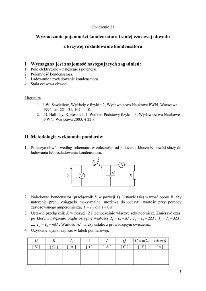 Ćwiczenie 21 Wyznaczanie pojemności kondensatora i stałej czasowej obwodu z krzywej rozładowanie kondensatora I. Wymagana jest znajomość następujących zagadnień: 1. 2. 3. 4. Pole elektryczne – natężenie i potencjał. Pojemność kondensatora. Ładowanie i rozładowanie kondensatora. Stała czasowa obwodu. Literatura 1. I.W. Sawieliew, Wykłady z fizyki t.2, Wydawnictwo Naukowe PWN, Warszawa 1994, str. 22 – 31, 107 - 110. 2. D. Halliday, R. Resnick, J. Walker, Podstawy fizyki t. 3, Wydawnictwo Naukowe PWN, Warszawa 2003, § 22.8. II. Metodologia wykonania pomiarów 1. Połączyć obwód według schematu: w zależności od położenia klucza K obwód służy do ładowania lub rozładowania kondensatora. K 2 A 1 U C V R 2. Naładować kondensator (przełącznik K w pozycji 1). Ustawić taką wartość oporu R, aby natężenie prądu osiągnęło maksymalną, możliwą do odczytu wartość przy pomocy zastosowanego amperomierza, I I 0 dla t 0 s . 3. Ustawić przełącznik K w pozycji 2 i jednocześnie włączyć sekundomierz. Zmierzyć czas, po którym natężenie prądu osiągnie wartości I1 I 0 I , I 2 I 0 2I , I 3 I 0 3I , ..., I n I 0 nI . Wartość I należy ustalić z prowadzącym ćwiczenia. 4. Uzyskane wyniki zapisać w tabeli pomiarowej. U R I0 t I Q [V] [] [ A] [s] [ A] [C] C ± u(C) ± u() [ F] [s] 1 III. Obliczenia 1. Sporządzić wykresy zależności prądu rozładowania od czasu I f t oraz ln I f1 t . 2. Wartość ładunku zgromadzonego na okładkach kondensatora obliczyć wyznaczając wartość pola powierzchni zawartego między osią czasu a krzywą I f t . 3. Wyznaczyć pojemność kondensatora z zależności: Q C U 4. Obliczyć stałą czasową obwodu: a) na podstawie wykresu I(t) korzystając z definicji stałej czasowej, b) z zależności RC , c) korzystając z wykresu ln I f1 t poprzez wyznaczenie współczynnika kierunkowego tej prostej. Przedyskutować otrzymane wyniki. 5. Na wykresie I f t zaznaczyć niepewności pomiarowe. Niepewność pomiaru natężenia prądu obliczyć na podstawie klasy przyrządu pomiarowego i niepewności odczytu. Uwzględnić również fakt, że lim I t 0 . Pomiary są przeprowadzone w skończonym t interwale czasu, w którym natężenie prądu nie spada do zera – wpływa to na niepewność wyznaczenia ładunku. Niepewność wyznaczenia pojemności kondensatora obliczyć metodą różniczki zupełnej. 6. Przy wyznaczaniu stałej czasowej obwodu z zależności ln I f1 t metodą najmniejszych kwadratów dopasować, do uzyskanych wyników prostą. Na podstawie nachylenia prostej wyznaczyć stałą czasową obwodu. Wyznaczyć odchylenia standardowe u(a), u(b) parametrów prostej. 2