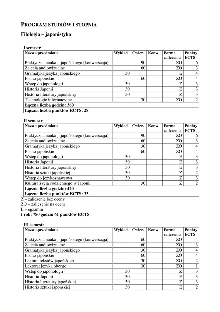 PROGRAM STUDIÓW I STOPNIA Filologia – japonistyka I semestr Nazwa przedmiotu Praktyczna nauka j. japońskiego (konwersacja) Zajęcia audiowizualne Gramatyka języka japońskiego Pismo japońskie Wstęp do japonologii Historia Japonii Historia literatury japońskiej Technologie informacyjne Łączna liczba godzin: 360 Łączna liczba punktów ECTS: 28 Wykład Ćwicz. Konw. 90 60 Forma Punkty zaliczenia ECTS ZO ZO E ZO Z E Z ZO 30 60 30 30 30 30 6 3 4 4 3 3 3 2 II semestr Nazwa przedmiotu Praktyczna nauka j. japońskiego (konwersacja) Zajęcia audiowizualne Gramatyka języka japońskiego Pismo japońskie Wstęp do japonologii Historia Japonii Historia literatury japońskiej Historia sztuki japońskiej Wstęp do językoznawstwa Kultura życia codziennego w Japonii Łączna liczba godzin: 420 Łączna liczba punktów ECTS: 33 Z – zaliczenie bez oceny ZO – zaliczenie na ocenę E – egzamin I rok: 780 godzin 61 punktów ECTS Wykład Ćwicz. Konw. 90 60 30 60 Forma Punkty zaliczenia ECTS ZO ZO ZO ZO E E E Z Z Z 30 30 30 30 30 30 6 3 4 4 3 3 3 2 3 2 III semestr Nazwa przedmiotu Praktyczna nauka j. japońskiego (konwersacja) Zajęcia audiowizualne Gramatyka języka japońskiego Pismo japońskie Lektura tekstów japońskich Lektorat języka obcego Wstęp do japonologii Historia Japonii Historia literatury japońskiej Historia sztuki japońskiej Wykład Ćwicz. 60 60 30 60 30 30 30 30 30 30 Konw. Forma Punkty zaliczenia ECTS ZO ZO ZO ZO ZO ZO Z E Z E 4 3 4 4 2 1 3 3 3 2 Wstęp do językoznawstwa Wychowanie fizyczne Łączna liczba godzin: 450 Łączna liczba punktów ECTS: 32 30 E Z 30 3 0 IV semestr Nazwa przedmiotu Praktyczna nauka j. japońskiego (konwersacja) Zajęcia audiowizualne Gramatyka języka japońskiego Pismo japońskie Lektura tekstów japońskich Lektorat języka obcego Wstęp do japonologii Historia Japonii Historia literatury japońskiej Proseminarium Wychowanie fizyczne Łączna liczba godzin: 450 Łączna liczba punktów ECTS: 29 II rok: 900 godzin 61 punktów ECTS Wykład Ćwicz. Konw. 60 60 30 60 30 30 30 30 30 30 30 Forma Punkty zaliczenia ECTS ZO ZO ZO ZO ZO ZO E E E ZO Z 4 3 4 4 2 1 3 3 3 2 0 V semestr Nazwa przedmiotu Wykład Ćwicz. Konw. Forma Punkty zaliczenia ECTS Praktyczna nauka j. japońskiego (konwersacja) 30 ZO Zajęcia audiowizualne 30 ZO Pismo japońskie 30 ZO Lektura tekstów japońskich 30 ZO Lektorat języka obcego 30 ZO Kompozycja tekstu japońskiego 30 ZO Wykład monograficzny 30 E Seminarium licencjackie 30 Z Konwersatorium specjalizacyjne 30 Z Filozofia; antropologia kultury 30 ZO Wykład specjalistyczny 30 ZO Realizacja pracy dyplomowej 40 Łączna liczba godzin: 370 Łączna liczba punktów ECTS: 28 Po V semestrze obowiązują praktyki zawodowe w wymiarze 4 tygodni. (1 punkt ECTS) 2 2 2 2 1 3 3 3 3 2 2 3 VI semestr Nazwa przedmiotu Praktyczna nauka j. japońskiego (konwersacja) Zajęcia audiowizualne Pismo japońskie Lektura tekstów japońskich Lektorat języka obcego Kompozycja tekstu japońskiego Seminarium licencjackie Wykład Ćwicz. Konw. 30 30 30 30 30 30 30 Forma Punkty zaliczenia ECTS ZO ZO ZO ZO E ZO ZO 2 2 2 2 2 3 3 Konwersatorium specjalizacyjne Filozofia; antropologia kultury Wykład specjalistyczny 30 Realizacja pracy dyplomowej Łączna liczba godzin: 380 Łączna liczba punktów ECTS: 30 III rok: 750 godzin + 72 godziny praktyk 59 punktów ECTS 30 30 ZO ZO ZO 80 RAZEM: 2430 godzin + 72 godziny praktyk 181 punktów ECTS Zatwierdzono na Radzie Wydziału w dniu 17 stycznia 2012 r. Obowiązuje od semestru letniego roku akademickiego 2011/2012 3 2 2 7