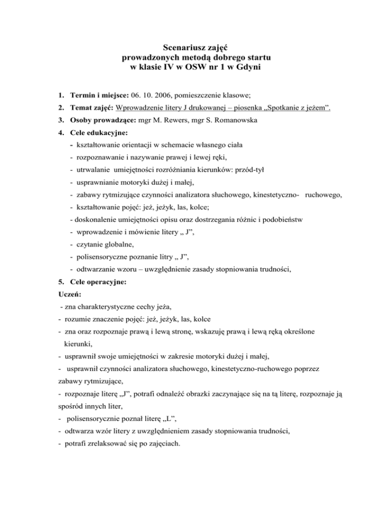 Scenariusz zajęć prowadzonych metodą dobrego startu w klasie IV w OSW nr 1 w Gdyni 1. Termin i miejsce: 06. 10. 2006, pomieszczenie klasowe; 2. Temat zajęć: Wprowadzenie litery J drukowanej – piosenka „Spotkanie z jeżem”. 3. Osoby prowadzące: mgr M. Rewers, mgr S. Romanowska 4. Cele edukacyjne: - kształtowanie orientacji w schemacie własnego ciała - rozpoznawanie i nazywanie prawej i lewej ręki, - utrwalanie umiejętności rozróżniania kierunków: przód-tył - usprawnianie motoryki dużej i małej, - zabawy rytmizujące czynności analizatora słuchowego, kinestetyczno- ruchowego, - kształtowanie pojęć: jeż, jeżyk, las, kolce; - doskonalenie umiejętności opisu oraz dostrzegania różnic i podobieństw - wprowadzenie i mówienie litery „ J”, - czytanie globalne, - polisensoryczne poznanie litry „ J”, - odtwarzanie wzoru – uwzględnienie zasady stopniowania trudności, 5. Cele operacyjne: Uczeń: - zna charakterystyczne cechy jeża, - rozumie znaczenie pojęć: jeż, jeżyk, las, kolce - zna oraz rozpoznaje prawą i lewą stronę, wskazuję prawą i lewą ręką określone kierunki, - usprawnił swoje umiejętności w zakresie motoryki dużej i małej, - usprawnił czynności analizatora słuchowego, kinestetyczno-ruchowego poprzez zabawy rytmizujące, - rozpoznaje literę „J”, potrafi odnaleźć obrazki zaczynające się na tą literę, rozpoznaje ją spośród innych liter, - polisensorycznie poznał literę „L”, - odtwarza wzór litery z uwzględnieniem zasady stopniowania trudności, - potrafi zrelaksować się po zajęciach. 6. Metody: metoda dobrego startu; werbalna – opis, rozmowa, pogadanka, praca z tekstem; oglądowa – obserwacja, pokaz; praktycznego działania – pisanie różnymi technikami, malowanie farbami plakatowymi konturów jeża; waloryzacyjna – odpoczynek i relaksacja przy muzyce, zabawy ruchowe; 7. Formy zajęć: zajęcia lekcyjne, zbiorowe, jednolite 8. Pomoce i środki: kasztany, ilustracja jeża i napis „JEŻ”, kontur jeża na dużym formacie szarego papieru, latarka, nagranie piosenki, magnetofon, wzory litery „J” drukowanej, ilustracje i podpisy wyrazów rozpoczynających się na lirę „J” (jabłko, jeleń, jajo”, tacki z kasza manną, blok rysunkowy, farby plakatowe, flamastry, zeszyty uczniów. 9. Przebieg zajęć: a) Zajęcia wprowadzające: Powitanie: piosenka „Witaj (imię dziecka)”; Ćwiczenia usprawniające orientację w schemacie ciała: piosenka „Głowa, ramiona, kolana, pięty”; praca w parach – osoby w parach witają się ze sobą przy użyciu różnych części ciała wskazywanych przez nauczyciela; ćwiczenia orientacji w przestrzeni: dzieci podają zgodnie z poleceniem kasztany, które ułożone są przed i za nimi, np. „Podaj kasztan, który jest przed Tobą”. Rozwiązanie przez uczniów zagadki: Kolczasty zwierzak ma z igieł kubraczek. Latem drepcze po borze, zimą śpi w leśnej norze” (jeż); Odpowiadanie uczniów na pytania: Czy spotkali kiedyś jeża?, Jak wygląda?, Gdzie można go spotkać? Obserwacja konturów jeża i wodzenie po nim palcem Poznanie piosenki „Spotkanie z jeżem” 1. Jejku, jejku ktoś ty taki, Jak to nie wiesz, jestem jeżem. Jejku jakie ty masz kolce Jeż to jednak dziwne zwierze. 2. Jestem taki, jaki jestem Lecz choć jestem najeżony I kłujący niby kaktus To mam swoje dobre strony. 3. Jestem miły, jestem grzeczny, Mówię proszę i dziękuję. A jeżeli mnie nie dotkniesz, To ja Ciebie nie pokłuję. wysłuchanie przez uczniów piosenki pt. „Spotkanie z jeżem”; wytłumaczenie niezrozumiałych zwrotów i słów; odpowiedzi uczniów na pytania dotyczące tekstu piosenki; ćwiczenia językowe: dokończenie wyrażenia – duży jeż – mały… (jeżyk); wyklaskiwanie słów „jeż” i „jeżyk”, liczenie sylab, określanie gdzie więcej; b) Zajęcia właściwe: Ćwiczenia ruchowe: chodzenie drobnymi krokami (tak jak jeże) w różnych kierunkach, na sygnał – uczniowie kucają i chowają głowy (jeże się boją); uderzanie palcami w podłogę – naśladowanie tupania jeża – najpierw wolno, potem coraz szybciej; Ćwiczenia ruchowo-słuchowe: Uczniowie wyobrażają sobie, że są na spacerze w parku. Śpiewają piosenkę i rytmicznie spacerują, wysoko unosząc kolana. Ćwiczenia ruchowo-słuchowo-wzrokowe: rysowanie igieł jeża na dywanie palcem w rytm śpiewanej piosenki; Przyjrzenie się i opisanie, z jakich elementów się składa litera „J”. Co przypomina? Czytanie globalne wyrazu „Jeż” oraz rozpoznawanie litery „J” w innych wyrazach rozpoczynających się lub zawierających literę „J” (jajko, jabłko, jeleń) Obserwacja przez uczniów sposobu kreślenia litery; pisanie i śpiewanie zwrotki piosenki; Poznanie polisensoryczne litery; Pisanie litery: na wzorze, na tacce z kaszą, grubym flamastrem w zeszytach; Pomalowanie jeża farbami plakatowymi i dorysowanie mu jabłka. c) Zajęcia końcowe: Leżenie na dywanie z zamkniętymi oczami i słuchanie spokojnej muzyki. Uczniowie wyobrażają sobie, że spacerują po lesie.