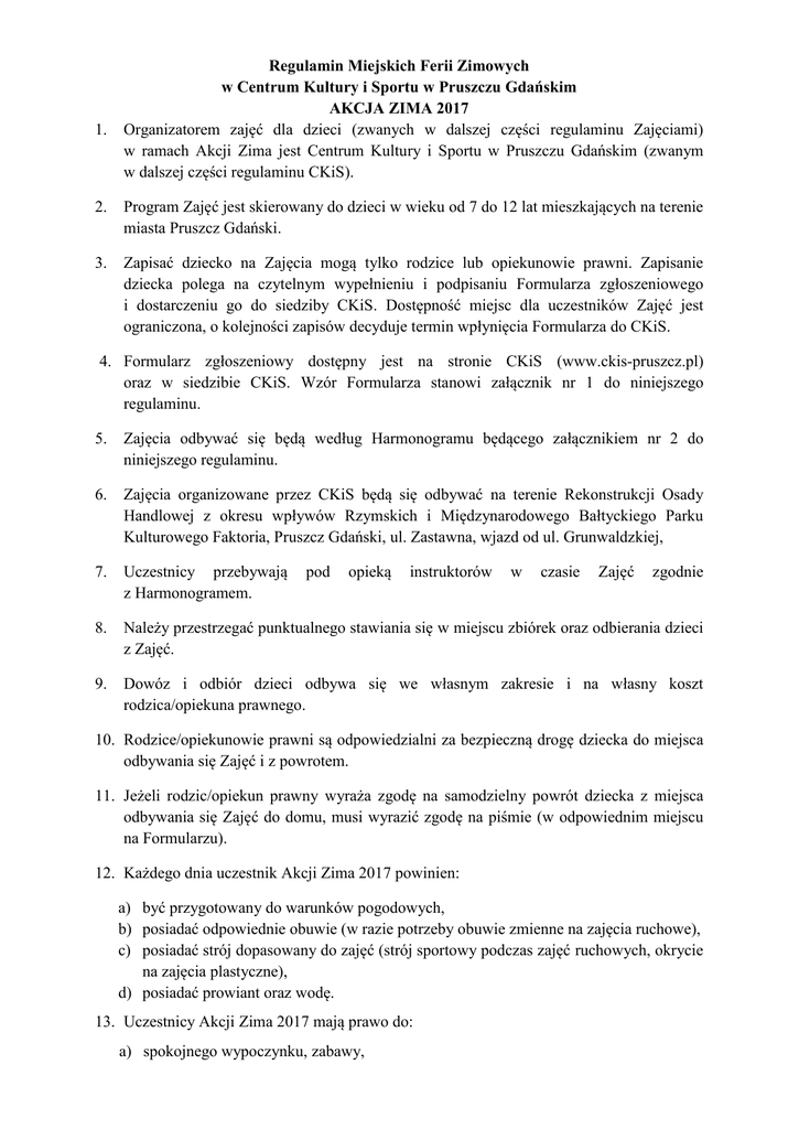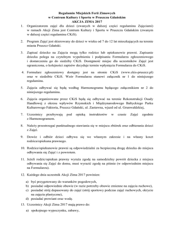 1. Regulamin Miejskich Ferii Zimowych w Centrum Kultury i Sportu w Pruszczu Gdańskim AKCJA ZIMA 2017 Organizatorem zajęć dla dzieci (zwanych w dalszej części regulaminu Zajęciami) w ramach Akcji Zima jest Centrum Kultury i Sportu w Pruszczu Gdańskim (zwanym w dalszej części regulaminu CKiS). 2. Program Zajęć jest skierowany do dzieci w wieku od 7 do 12 lat mieszkających na terenie miasta Pruszcz Gdański. 3. Zapisać dziecko na Zajęcia mogą tylko rodzice lub opiekunowie prawni. Zapisanie dziecka polega na czytelnym wypełnieniu i podpisaniu Formularza zgłoszeniowego i dostarczeniu go do siedziby CKiS. Dostępność miejsc dla uczestników Zajęć jest ograniczona, o kolejności zapisów decyduje termin wpłynięcia Formularza do CKiS. 4. Formularz zgłoszeniowy dostępny jest na stronie CKiS (www.ckis-pruszcz.pl) oraz w siedzibie CKiS. Wzór Formularza stanowi załącznik nr 1 do niniejszego regulaminu. 5. Zajęcia odbywać się będą według Harmonogramu będącego załącznikiem nr 2 do niniejszego regulaminu. 6. Zajęcia organizowane przez CKiS będą się odbywać na terenie Rekonstrukcji Osady Handlowej z okresu wpływów Rzymskich i Międzynarodowego Bałtyckiego Parku Kulturowego Faktoria, Pruszcz Gdański, ul. Zastawna, wjazd od ul. Grunwaldzkiej, 7. Uczestnicy przebywają z Harmonogramem. 8. Należy przestrzegać punktualnego stawiania się w miejscu zbiórek oraz odbierania dzieci z Zajęć. 9. Dowóz i odbiór dzieci odbywa się we własnym zakresie i na własny koszt rodzica/opiekuna prawnego. pod opieką instruktorów w czasie Zajęć zgodnie 10. Rodzice/opiekunowie prawni są odpowiedzialni za bezpieczną drogę dziecka do miejsca odbywania się Zajęć i z powrotem. 11. Jeżeli rodzic/opiekun prawny wyraża zgodę na samodzielny powrót dziecka z miejsca odbywania się Zajęć do domu, musi wyrazić zgodę na piśmie (w odpowiednim miejscu na Formularzu). 12. Każdego dnia uczestnik Akcji Zima 2017 powinien: a) być przygotowany do warunków pogodowych, b) posiadać odpowiednie obuwie (w razie potrzeby obuwie zmienne na zajęcia ruchowe), c) posiadać strój dopasowany do zajęć (strój sportowy podczas zajęć ruchowych, okrycie na zajęcia plastyczne), d) posiadać prowiant oraz wodę. 13. Uczestnicy Akcji Zima 2017 mają prawo do: a) spokojnego wypoczynku, zabawy, b) uczestniczenia w zajęciach, c) korzystania ze wszystkich urządzeń i sprzętów niezbędnych do realizacji programu zgodnie z ich przeznaczeniem, d) wnoszenia próśb i skarg oraz propozycji zmian w programie, e) bezpośredniego zwracania się w sprawach osobistych do instruktora, f) w przypadku niedyspozycji, zgłosić to instruktorowi. 14. Uczestnicy Akcji Zima 2017 mają obowiązek: przestrzegać niniejszego regulaminu, przestrzegać zasad bezpieczeństwa i ppoż, dbać o bezpieczeństwo swoje i innych, bezwzględnie podporządkować się poleceniom instruktorów, przestrzegać harmonogramu pracy w danym dniu, szanować mienie CKiS, pomoce dydaktyczne oraz własność innych uczestników, kulturalnie zachowywać się podczas spożywania posiłków, zachować higienę osobistą, ład i czystość w pomieszczeniach, w których będą odbywać się zajęcia, h) przebywać wraz z grupą pozostałych uczestników - w trakcie zajęć zabrania się samowolnego oddalania się od grupy. a) b) c) d) e) f) g) 12. Samowolne oddalenie się od instruktorów, niesubordynacja, niezdyscyplinowanie, niewykonywanie poleceń instruktorów, nieprzestrzeganie niniejszego regulaminu będzie karane upomnieniem lub naganą. W ostateczności organizator ma prawo odmowy dalszego udziału dziecka w Zajęciach. 13. Za szkody wyrządzone przez dziecko materialnie odpowiadają rodzice/opiekunowie prawni. 14. CKiS nie odpowiada za rzeczy zagubione przez uczestników w czasie Zajęć oraz za zniszczenia rzeczy należących do dzieci, dokonane przez innych uczestników. 15. CKiS zaleca nie przynoszenie na Zajęcia cennych urządzeń, np. telefonów komórkowych, odtwarzaczy muzyki, konsol do gry itp., niekoniecznych do udziału w Zajęciach. 16. Przed przystąpieniem do Zajęć rodzice/opiekunowie prawni powinni poinformować organizatora o stanie zdrowia dziecka, zwłaszcza o chorobach przewlekłych. 17. Przy zapisywaniu dziecka na Zajęcia należy podać aktualny numer telefonu kontaktowego do rodzica lub opiekuna prawnego dziecka. 18. W przypadku konieczności wycofania dziecka z Zajęć, należy powiadomić o tym CKiS w możliwie najkrótszym czasie 19. Organizator zastrzega sobie prawo do wprowadzania zmian w Harmonogramie Zajęć. Załącznik 1 Wzór Formularza Data wpłynięcia:................................ nr zgłoszenia:................... KWESTIONARIUSZ OSOBOWY – AKCJA ZIMA 2017 Formularz mogą wypełnić i podpisać wyłącznie rodzice lub opiekunowie prawni. * - Niepotrzebne skreślić Formularz wypełnić drukowanymi literami Imię i nazwisko dziecka...................................................................................................................... Imię i nazwisko rodzica/opiekuna prawnego*......................................................................................... Wiek dziecka i data urodzenia............................................................................................................. PESEL............................................................................................................................................ Adres zamieszkania........................................................................................................................... Tel. kontaktowy rodzica/opiekuna prawnego......................................................................................... Wyrażam zgodę / Nie wyrażam zgody* na samodzielny powrót mojego dziecka po zajęciach, odbywających się podczas i Sportu w Pruszczu Gdańskim. Akcji Zima 2017 organizowanej przez Centrum Kultury .......................................................... (p