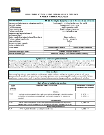 M AŁ O PO L S K A WYŻ SZ A S ZK OŁ A E K ON OM I CZN A W TA RN O WI E KARTA PROGRAMOWA Moduł kształcenia M-29 Polityka turystyczna w Polsce i na świecie Nazwa modułu kształcenia w języku angielskim Kierunek studiów Profil kształcenia Forma kształcenia Poziom przedmiotu (podstawowy/specjalnościowy/ ogólnouczelniany) Status przedmiotu (obowiązkowy/do wyboru) Poziom modułu kształcenia Język wykładowy Semestr realizacji modułu Liczba punktów ECTS Liczba godzin Jednostka realizująca moduł Moduły poprzedzające Tourism policy in Poland and around the world Tu r y st yk a i R ekr e acj a O gól n oak ad em ic k i Stu d ia n i e st ac jon ar n e Sp ec ja ln o śc io wy Ob ow i ązk ow y Stu d ia I stop n i a Po ls ki IV 1 Forma modułu: wykład Forma modułu: dwiczenia 10 Katedra Turystyki i Rekreacji Podstawy turystyki, Ekonomika turystyki i rekreacji Syntetyczna charakterystyka modułu Przedmiot poświęcony jest zagadnieniom związanym z polityką turystyczną prowadzoną przez Polskę i kraje swiata. Jest to ukazane z różnych poziomów zarządzania turystyką tj. Unii Europejskiej i krajowej administracji rządowej (w tym Polskiej Organizacji Turystycznej) czy innych instytucji ogólnopolskich oraz samorządu terytorialnego, w tym szczególnie z poziomu gminy, która w znaczący sposób przyczynia się do bezpośredniego rozwoju turystyki. Cele modułu Celem zajęd jest nabycie przez studenta podstawowej wiedzy z zakresu polityki turystycznej, w tym jej zakresu na poszczególnych szczeblach zarządzania, zarówno z perspektywy paostwa polskiego jak i struktur europejskich. W toku zajęd student zapozna się z konkretnymi instytucjami odpowiedzialnymi za prawidłowy rozwój turystyki w Polsce. Opis efektów kształcenia modułu Symbol efektu kształcenia dla modułu W_01 U_01 K_01 Osiągnięte efekty kształcenia Wiedza: - posiada podstawową wiedzę z zakresu struktur związanych z kształtowaniem polityki turystycznej na poszczególnych poziomach zarządzania rozwojem turystyki Umiejętności: - potrafi scharakteryzowad działalnośd podstawowych instytucji i organizacji turystycznych na poszczególnych szczeblach zarządzania rozwojem turystyki Kompetencje społeczne: - potrafi myśled i działad w sposób przedsiębiorczy Odniesienie do efektów kształcenia dla kierunku K_W02 +++ K_W10+++ K_U08 +++ K_K03 +++ Kryteria oceny efektów kształcenia oraz metody ich weryfikacji Symbol efektu kształcenia na ocenę na ocenę na ocenę na ocenę na ocenę 2 3 4 5 6 K_W01 Nie posiada podstawowej wiedzy Posiada wiedzę odtwórczą, nieuporządkowaną Umie dokonywad wyboru, sprawnie posługuje się zdobytą wiedzą K_U01 Nie potrafi wykorzystad zdobytej wiedzy Wykorzystuje wiedzę odtwórczo, w sposób nieuporządkowany Wykonuje typowe zadania K_K01 Jest niezaangażowany Wykazuje nieznaczne zaangażowanie Wykazuje umiarkowanie zaangażowanie i zainteresowanie (1) Rozumie i stosuje w Wiedza wybiega praktyce zdobytą poza podstawowe wiedzę i sprawnie treści programowe, wykonuje analizy biegle się nią posługuje, jest samodzielny i twórczy Sprawnie i Umiejętności umiejętnie wybiegają poza wykorzystuje podstawowe treści zdobytą wiedzę w programowe, jest praktyce samodzielny i twórczy Jest zaangażowany Jest bardzo i zainteresowany zaangażowany, wspiera innych Metody weryfikacji efektów kształcenia (2) PR PR PR (1) wpisad symbol efektu kształcenia (2) wpisad np.: EU – egzamin ustny; EP – egzamin pisemny; T – test; P – prezentacja; PR – projekt; ES – esej; RE – referat, KO – kolokwium opisowe, PP – przykłady praktyczne, PE – platforma e-learningowa, CS – case study itp. Treści kształcenia modułu Forma modułu: wykład 1. Pojęcie polityki turystycznej; cele, zakres, instrumenty i formy polityki turystycznej. 2. Podmioty realizujące politykę turystyczną; funkcje paostwa w kształtowaniu polityki turystycznej, zadania Narodowej Administracji Turystycznej (NTA) i Narodowej Organizacji Turystycznej (NTO). 3. Zarządzanie turystyką na szczeblu regionalnym i lokalnym; polityka turystyczna samorządu terytorialnego w Polsce; turystyka w zadaniach gmin, powiatów, województw; wybrane regionalne i lokalne organizacje turystyczne. 4. Organizacje i stowarzyszenia branżowe w turystyce działające w Polsce. 5. Wybrane międzynarodowe organizacje turystyczne; Wpływ UE na kształtowanie polityki turystycznej na poziomie Europy i kraju. Literatura podstawowa Literatura uzupełniająca Forma modułu: dwiczenia Alejziak W., Turystyka w obliczu wyzwań XXI wieku, Albis Kraków 1999. Alejziak W., Marciniec T., Międzynarodowe organizacje turystyczne, ALBIS, Kraków 2003. Kurek W. (red.), Turystyka, PWN, Warszawa 2007. - dokumenty prawne związane z organizacją i funkcjonowaniem struktur/ instytucji Metody dydaktyczne podające (wykład, opis), problemowe (metoda przypadków), praktyczne (metoda projektów) Nakład czasu pracy studenta w przeliczeniu na godziny i punkty ECTS Elementy składające się na pracę studenta Udział w wykładach Ilośd godzin 10 Udział w dwiczeniach Samodzielne studiowanie tematyki wykładów Samodzielne przygotowanie się do dwiczeo Przygotowanie się do egzaminu Przygotowanie się do zaliczenia 5 Ilośd punktów ECTS Przygotowanie eseju Przygotowanie prezentacji Przygotowanie referatu Przygotowanie projektu 10 Inne (wymienid jakie) Suma 25 1