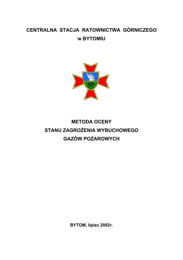 CENTRALNA STACJA RATOWNICTWA GÓRNICZEGO w BYTOMIU METODA OCENY STANU ZAGROŻENIA WYBUCHOWEGO GAZÓW POŻAROWYCH BYTOM, lipiec 2002r. Stosownie do przepisów pkt. 1.63.14. zał. nr 3 do rozporządzenia Ministra Gospodarki z dn. 12 czerwca 2002r. w sprawie ratownictwa górniczego (Dz.U. Nr 94 z 2002r., poz. 838) ustala się jak niżej metodę oceny stanu zagrożenia wybuchowego gazów pożarowych. Dyrektor Naczelny Centralnej Stacji Ratownictwa Górniczego mgr inż. Zygmunt Kajdasz Bytom, lipiec 2002r. - 1 - Metoda oceny stanu zagrożenia wybuchowego gazów pożarowych 1. Wyniki pomiarów składu gazów pożarowych z punktów pomiarowych, przekazywane do sztabu akcji, muszą być dokumentowane i na bieżąco analizowane przez kierownika akcji, szczególnie pod względem zagrożenia wybuchowego. Danymi wejściowymi są zawartości poszczególnych składników gazowych wyrażonych w postaci procentowych udziałów objętościowych w odniesieniu do atmosfery suchej, tj. metanu CH4, wodoru H2, tlenku węgla CO, dwutlenku węgla CO2, etylenu C2H4 i etanu C2H6. 2. Ocenę stanu zagrożenia wybuchowego należy przeprowadzać metodą stałego trójkąta wybuchowości. W tym celu należy sporządzić wykres, w którym oś X stanowi wskaźnik stężenia gazów wybuchowych, a oś Y stanowi wskaźnik stężenia tlenu. Obszar wybuchowości jest zamkniętym trójkątem, którego wierzchołki mają współrzędne: D ( 5,00; 19,88) - dolna granica wybuchowości, G (15,00; 17,79) - górna granica wybuchowości, S ( 5,18; 9,47) - szczytowa granica wybuchowości. Stały trójkąt wybuchowości - 2 - Strzałki obrazują kierunki zmian składu mieszaniny spowodowane dopływem gazów obojętnych (a), powietrza (b), gazów palnych (c). Odcinek AB - proste mieszaniny powietrza i gazów palnych Obszar powyżej AB - mieszaniny sztucznie wzbogacone w tlen Obszar ASC - mieszaniny niewybuchowe z powodu nadmiaru gazów obojętnych Obszar ADS - mieszaniny niewybuchowe z powodu nadmiaru powietrza Obszar DGS - mieszaniny wybuchowe Obszar SGBE - mieszaniny niewybuchowe z powodu nadmiaru gazów palnych Obszar OCSE - mieszaniny bezpieczne 3. Każdej mieszaninie gazowej można przypisać punkt „P”, dla którego wyznacza się współrzędne Xp i Yp. Kolejność postępowania przy wyznaczaniu współrzędnych Xp i Yp jest następująca: - obliczenie współczynnika α określającego wpływ CO2 na wybuchowość w punkcie szczytowym α= CO 2 − 0,03 CO 2 + N 2 − 3,778 × O 2 - obliczenie sumy gazów palnych ΦGp ΦGp = CH4+H2+CO+C2H4+C2H6 - ustalenie współczynnika β dla poszczególnych gazów palnych, określającego wpływ CO2 w zależności od położenia punktu p w stosunku do charakterystycznego obszaru wybuchowości danego gazu β CH = 4 20,93 − (O2 + 0,2093 × Φ Gp ) 10,376 − 3,016 × α - 14,918 − 3,533 × α 2 20,93 − (O2 + 0,2093 × Φ Gp ) β CO = 13,039 − 3,396 × α βC H = 4 βC H = 2 - 20,93 − (O2 + 0,2093 × Φ Gp ) βH = 2 3 6 20,93 − (O2 + 0,2093 × Φ Gp ) 14,269 − 3,526 × α 20,93 − (O2 + 0,2093 × Φ Gp ) 11,872 − 2,909 × α Wartość współczynnika β może przyjmować wielkość tylko od 0 ÷ 1. W przypadku gdy z wyliczenia otrzymamy β ≥ 1, do dalszych obliczeń przyjąć należy β = 1. Gdy z wyliczeń wynika β < 1, do dalszych obliczeń przyjąć należy wartość faktycznie obliczoną. - obliczenie współrzędnej Xp ( ) X CH 4 = Φ Gp − 0,78 × α × β CH × CH 4 4 ( ) X H 2 = 4,643 + 0,14 × Φ Gp − 0,01 × O2 − 0,107 × α × β H 2 × H 2 X CO = (3,117 + 0,161 × Φ Gp − 0,007 × O2 − 0,4 × α × β CO )× CO ( ) ( ) X C2 H 4 = 4,121 + 0,385 × Φ Gp − 0,009 × O2 − 0,216 × α × β C 2H 4 × C 2 H 4 X C2 H 6 = 1,937 + 1,052 × Φ Gp − 0,005 × O2 − 0,724 × α × β C2 H 6 × C 2 H 6 Xp = X CH 4 + X H 2 + X CO + X C2 H 4 + X C2 H 6 Φ Gp - 4 - - obliczenie współrzędnej Yp YCH 4 = (O2 − 2,852 × β CH 4 ) × CH 4 YH 2 = (5,401 + 0,116 × Φ Gp + 0,698 × O2 − 2,435 × α × β H 2 ) × H 2 YCO = (3,622 + 0,133 × Φ Gp + 0,797 × O2 − 2,619 × α × β CO ) × CO YC2 H 4 = (4,849 + 0,072 × Φ Gp + 0,729 × O2 − 2,519 × α × β C2 H 4 ) × C 2 H 4 YC2 H 6 = (2,233 − 0,037 × Φ Gp + 0,875 × O2 − 2,391 × α × β C2 H 6 ) × C 2 H 6 Yp = Symbole YCH 4 + YH 2 + YCO + YC2 H 4 + YC2 H 6 Φ Gp O2 , CO2 , CH 4 , H 2 , CO, C2 H 4 , C2 H 6 oznaczają udziały objętościowe poszczególnych gazów wyrażone w procentach. 4. Przy ocenie stanu zagrożenia wybuchowego zaleca się wymagane obliczenia parametrów wybuchowości gazów wykonywać przy komputerowego, a otrzymane wyniki obliczeń dokumentować. pomocy programu