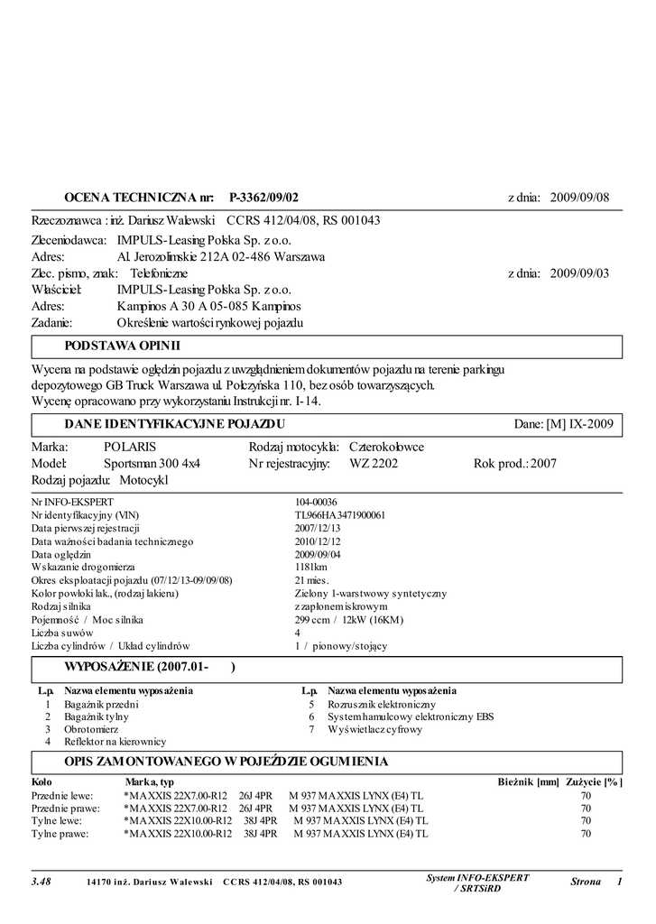 OCENA TECHNICZNA nr: P-3362/09/02 z dnia: 2009/09/08 Rzeczoznawca : inż. Dariusz Walewski CCRS 412/04/08, RS 001043 Zleceniodawca: IMPULS-Leasing Polska Sp. z o.o. Adres: Al. Jerozolimskie 212A 02-486 Warszawa Zlec. pismo, znak: Telefoniczne Właściciel: IMPULS-Leasing Polska Sp. z o.o. Adres: Kampinos A 30 A 05-085 Kampinos Zadanie: Określenie wartości rynkowej pojazdu z dnia: 2009/09/03 PODSTAWA OPINII Wycena na podstawie oględzin pojazdu z uwzglądnieniem dokumentów pojazdu na terenie parkingu depozytowego GB Truck Warszawa ul. Połczyńska 110, bez osób towarzyszących. Wycenę opracowano przy wykorzystaniu Instrukcji nr. I-14. DANE IDENTYFIKACYJNE POJAZDU Marka: POLARIS Model: Sportsman 300 4x4 Rodzaj pojazdu: Motocykl Rodzaj motocykla: Czterokołowce Nr rejestracyjny: WZ 2202 Nr INFO-EKSPERT Nr identyfikacyjny (VIN) Data pierwszej rejestracji Data ważności badania technicznego Data oględzin Wskazanie drogomierza Okres eksploatacji pojazdu (07/12/13-09/09/08) Kolor powłoki lak., (rodzaj lakieru) Rodzaj silnika Pojemność / Moc silnika Liczba suwów Liczba cylindrów / Układ cylindrów WYPOSAŻENIE (2007.01L.p. 1 2 3 4 Dane: [M] IX-2009 Rok prod.: 2007 104-00036 TL966HA3471900061 2007/12/13 2010/12/12 2009/09/04 1181km 21 mies. Zielony 1-warstwowy syntetyczny z zapłonem iskrowym 299 ccm / 12kW (16KM) 4 1 / pionowy/stojący ) Nazwa elementu wyposażenia Bagażnik przedni Bagażnik tylny Obrotomierz Reflektor na kierownicy L.p. 5 6 7 Nazwa elementu wyposażenia Rozrusznik elektroniczny System hamulcowy elektroniczny EBS Wyświetlacz cyfrowy OPIS ZAMONTOWANEGO W POJEŹDZIE OGUMIENIA Koło Przednie lewe: Przednie prawe: Tylne lewe: Tylne prawe: 3.48 Marka, typ *MAXXIS 22X7.00-R12 26J 4PR *MAXXIS 22X7.00-R12 26J 4PR *MAXXIS 22X10.00-R12 38J 4PR *MAXXIS 22X10.00-R12 38J 4PR 14170 inż . Dariusz Wale wski M 937 MAXXIS LYNX (E4) TL M 937 MAXXIS LYNX (E4) TL M 937 MAXXIS LYNX (E4) TL M 937 MAXXIS LYNX (E4) TL C C RS 412/04/08, RS 001043 Bieżnik [mm] Zużycie [% ] 70 70 70 70 System INFO-EKSPERT / SRTSiRD Strona 1 P-3362/09/02 STAN TECHNICZNY POJAZDU Do oceny przedstawiono pojazd przejęty przez leasing, kompletny. Oględziny pojazdu dokonano na terenie parkingu depozytowego GB Truck Warszawa ul. Połczyńska 110, bez osób towarzyszących. W czasie oględzin próbowano dokonać jazdy próbnej po terenie parkingu. W czasie oględzin stwierdzono: SILNIK Silnik wraz z osprzętem kompletny bez widocznych braków i uszkodzeń mechanicznych. Silnika nie uruchomiono z uwagi na brak paliwa. Układ wydechowy mocno skorodowany. PODWOZIE Podzespoły podwozia kpl. bez widocznych braków i uszkodzeń mechanicznych. NADWOZIE Nadwozie koloru zielonego, ze śladami niewielkich uszkodzeń mechanicznych. Części wyposażenia nadwozia uszkodzone kwalifikujące się do naprawy: - wzmocnienie czołowe - głęboko wgniecione, pogięte, - uchwyt tylny (rączka) - zgięta, WYPOSAŻENIE Wyposażenie fabryczne pojazdu - kompletne. Pojazd posiada 2 komplety kluczyków do włącznika zapłonu. Od niniejszej wyceny przysługuje odwołanie do Zarządu Spółki za pośrednictwem Dyrektora Oddziału. W przypadku konieczności wykonania wyceny komisyjnej wymagana jest wpłata zaliczki. WERYFIKATOR RZECZOZNAWCA 3.48 14170 inż . Dariusz Wale wski C C RS 412/04/08, RS 001043 System INFO-EKSPERT / SRTSiRD Strona 2