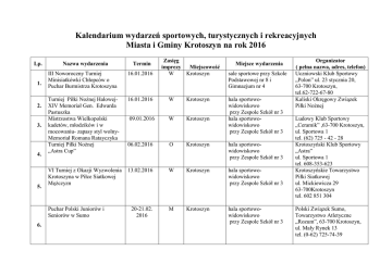 Kalendarium wydarzeń sportowych, turystycznych i rekreacyjnych Miasta i Gminy Krotoszyn na rok 2016 Lp. 1. 2. 3. 4. 5. Nazwa wydarzenia Zasięg imprezy Miejscowość W Krotoszyn Miejsce wydarzenia III Noworoczny Turniej Minisiatkówki Chłopców o Puchar Burmistrza Krotoszyna 16.01.2016 Turniej Piłki NoŜnej HalowejXIV Memoriał Gen. Edwarda Pastuszka Mistrzostwa Wielkopolski kadetów, młodzików i w mocowaniu- zapasy styl wolnyMemoriał Romana Ratayczyka Turniej Piłki NoŜnej „Astra Cup” 16.01.2016 W Krotoszyn 09.01.2016 W Krotoszyn 06.02.2016 O Krotoszyn hala sportowowidowiskowo przy Zespole Szkół nr 3 VI Turniej z Okazji Wyzwolenia Krotoszyna w Piłce Siatkowej MęŜczyzn 13.02.2016 W Krotoszyn hala sportowowidowiskowo przy Zespole Szkół nr 3 20-21.02. 2016 M Krotoszyn hala sportowowidowiskowo przy Zespole Szkół nr 3 Puchar Polski Juniorów i Seniorów w Sumo 6. Termin sale sportowe przy Szkole Podstawowej nr 8 i Gimnazjum nr 4 hala sportowowidowiskowo przy Zespole Szkół nr 3 hala sportowowidowiskowo przy Zespole Szkół nr 3 Organizator ( pełna nazwa, adres, telefon) Uczniowski Klub Sportowy „Polon” ul. 23 stycznia 20, 63-700 Krotoszyn, tel.62-722-67-80 Kaliski Okręgowy Związek Piłki NoŜnej Ludowy Klub Sportowy „Ceramik” ,63-700 Krotoszyn, ul. Sportowa 1 tel. (62) 725 - 42 - 28 Krotoszyński Klub Sportowy „Astra” ul. Sportowa 1 tel. 608-353-623 Krotoszyńskie Towarzystwo Piłki Siatkowej ul. Mickiewicza 29 63-700Krotoszyn tel. 602 851 304 Polski Związek Sumo, Towarzystwo Atletyczne „Rozum”, 63-700 Krotoszyn, ul. Mały Rynek 13 tel. (0-62) 725-74-39 III Igrzyska Przedszkolaków w Sumo 12.03.2016 P Krotoszyn hala sportowowidowiskowo przy Zespole Szkół nr 3 Finałowy Turniej Rekreacyjny Przedszkoli 25.03.2016 G Krotoszyn sala przy ul. Młyńskiej kwiecień 2016 O Krotoszyn 07.04.2016 W Krotoszyn 08-09.04. 2016 W Krotoszyn 08.04.2016 G Krotoszyn 21-24.04. 2016 M Krotoszyn 7. 8. 9. Ogólnopolski Wielkanocny Turniej Mini Piłki Siatkowej Chłopców Finał Wojewódzki w Minisiatkówce Chłopców 10. Finał Wojewódzki w Siatkówce Chłopców 11. 12. Podsumowanie konkursu „Fair play w Ŝyciu” Mistrzostwa Europy Juniorów i Seniorów w Sumo 13. Polski Związek Sumo, Towarzystwo Atletyczne „Rozum”, 63-700 Krotoszyn, ul. Mały Rynek 13 tel. (0-62) 725-74-39 Centrum Sportu i Rekreacji WODNIK w Krotoszynie ul. Mahle 4 tel.(62) 722- 67-60 Zespół Szkół nr 1 z UKS „Piast” Oddziałami Integracyjnymi Krotoszyn, ul. Jagiełły 4 63-700 Krotoszyn tel. (0-62) 725-27-85 hala sportowoSzkolny Związek Sportowy widowiskowo „Wielkopolska”, Uczniowski przy Zespole Szkół nr 3 Klub Sportowy „Polon” ul. 23 stycznia 20, 63-700 Krotoszyn, tel.62-722-67-80 hala sportowoSzkolny Związek Sportowy widowiskowo „Wielkopolska”, UKS „Piast” przy Zespole Szkół nr 3 Krotoszyn, ul. Jagiełły 4 63-700 Krotoszyn tel. (0-62) 725-27-85 Zespół Szkół Stowarzyszenie Absolwentów Ponadgimnazjalnych nr 2 i Przyjaciół Zespołu Szkół Ponadgimnazjalnych nr 2 tel.(62) 725- 22 -28 Rynek Polski Związek Sumo, Towarzystwo Atletyczne „Rozum”, 63-700 Krotoszyn, ul. Mały Rynek 13 tel. (0-62) 725-74-39 XLIV Krajoznawczy Zlot MłodzieŜy i Święto Roweru 23.04.2016 W Krotoszyn Ogólnopolski turniej kwalifikacyjny młodzików i w 15. mocowaniu w zapasach w stylu wolnym i zapasach kobiet Zawody Wędkarskie o Puchar 16. Burmistrza Krotoszyna 06-07.05. 2016 O Krotoszyn 22.05.2016 W Krotoszyn 29.05.2016 O Krotoszyn 05.06.2016 W Krotoszyn 18.06.2016 O Krotoszyn Wyścig Kolarski „Szukamy 20. Następców Olimpijczyków” 15.06.2016 W Biadki, gmina Krotoszyn Biadki, gmina Krotoszyn Mistrzostwa Polski w Stuntridingu- „Stunt Open Krotoszyn 2016” 17-19.06. 2016 O Krotoszyn Teren przy Krytej Pływalni Wodnik 14. 17. XXXVII Ogólnopolski Bieg „Krotosa” Zawody Wędkarskie o Okazji 18. Dnia Dziecka „Jordan Cup 2016”-Nocny Turniej Piłki Siatkowej PlaŜowej 19. 21. okolice Krotoszyna PTTK Oddział w Krotoszynie 63-700 Krotoszyn, ul. Mały Rynek 1, tel.( 0-62) 725 -26-15 hala sportowoLudowy Klub Sportowy widowiskowo „Ceramik” ,63-700 Krotoszyn, przy Zespole Szkół nr 3 ul. Sportowa 1 tel. (0-62) 725 - 42 - 28 Jezioro Odrzykowskie PZW Koło Krotoszyn Miasto, w Krotoszynie 63-700 Krotoszyn, tel. 664 459 176 Rynek Centrum Sportu i Rekreacji WODNIK w Krotoszynie ul. Mahle 4 tel.(0-62) 722- 67- 60 Jezioro Odrzykowskie PZW Koło Krotoszyn Miasto, w Krotoszynie 63-700 Krotoszyn, tel. 664 459 176 Zespół Szkół nr 1 z Zespół Szkół nr 1 z Oddziałami Integracyjnymi Oddziałami Integracyjnymi w Krotoszynie, ul. Jagiełły 4, 63-700 Krotoszyn tel. (0-62) 725-27-85 Międzyszkolny Uczniowski Klub Sportowy „AS” , Biadki ul. Szkolna3, tel. 62 721 13 22 Stowarzyszenie Klubu Motocyklowego Ignis Ardens 63-700 Krotoszyn, ul. Łukasiewicza 15a, tel. 502-562-639 IV Turniej Wsi w RóŜopolu 19.06. 2016 G RóŜopole, gmina Krotoszyn RóŜopole, gmina Krotoszyn czerwiec 2016 O Krotoszyn Stadion przy ul. Sportowej 09-10.07. 2016 M Krotoszyn Rynek 29-31. 07.2016 M Krotoszyn Krotoszyn „ Mikst Open Krotoszyn”Siatkówka PlaŜowa lipiec 2016 W Krotoszyn basen otwarty przy ul. Ogrodowskiego XI Otwarte Mistrzostwa Ziemi Krotoszyńskiej 27. w Siatkówce PlaŜowej sierpień 2016 O Krotoszyn basen otwarty przy ul. Ogrodowskiego 19-21.08. 2016 O Krotoszyn Tereny rekreacyjne przy ul. Stowarzyszenie Klub Sportowej Motocykli CięŜkich i Weteranów „Oldtimers” 63-760 Zduny ul. Konstytucji 3 Maja 10 , tel. 663-699-633 22. 23. Turniej Piłki NoŜnej „Astra Cup” Międzynarodowe Mistrzostwa Polski w Sumo 24. „Poland Open 2016” LOGinLAB 25. 26. XXIX Ogólnopolski Zlot 28. Motocykli CięŜkich i Weteranów Stowarzyszenie Rozwoju Wsi RóŜopole, RóŜopole 34, 63-714 Kobierno tel. 692-429-660 Krotoszyński Klub Sportowy „Astra” ul. Sportowa 1 tel. 608-353-623 Polski Związek Sumo, Towarzystwo Atletyczne „Rozum”, 63-700 Krotoszyn, ul. Mały Rynek 13 tel. (0-62) 725-74
