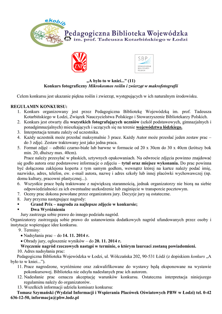 „A było to w kniei...” (11) Konkurs fotograficzny Mikrokosmos roślin i zwierząt w makrofotografii Celem konkursu jest ukazanie piękna roślin i zwierząt, występujących w ich naturalnym środowisku. REGULAMIN KONKURSU: 1. Konkurs organizowany jest przez Pedagogiczna Bibliotekę Wojewódzką im. prof. Tadeusza Kotarbińskiego w Łodzi, Związek Nauczycielstwa Polskiego i Stowarzyszenie Bibliotekarzy Polskich. 2. Konkurs jest otwarty dla wszystkich fotografujących uczniów (szkół podstawowych, gimnazjalnych i ponadgimnazjalnych) mieszkających i uczących się na terenie województwa łódzkiego. 3. Interpretacja tematu zależy od uczestnika. 4. Każdy uczestnik może przesłać maksymalnie 3 prace. Każdy Autor może przesłać jeden zestaw prac – do 3 zdjęć. Zestaw traktowany jest jako jedna praca. 5. Format zdjęć – odbitki czarno-białe lub barwne w formacie od 20 x 30cm do 30 x 40cm (krótszy bok min. 20, dłuższy max. 40cm). Prace należy przesyłać w płaskich, sztywnych opakowaniach. Na odwrocie zdjęcia powinno znajdować się godło autora oraz podstawowe informacje o zdjęciu – tytuł oraz miejsce wykonania. Do prac powinna być dołączona zaklejona koperta z tym samym godłem, wewnątrz której na kartce należy podać imię, nazwisko, adres, telefon, ew. e-mail autora, nazwę i adres szkoły lub innej placówki wychowawczej (np. domu kultury, pracowni plastycznej...). 6. Wszystkie prace będą traktowane z największą starannością, jednak organizatorzy nie biorą na siebie odpowiedzialności za ich ewentualne uszkodzenie lub zaginięcie w transporcie pocztowym. 7. Oceny prac dokona powołane przez organizatora jury. Decyzje jury są ostateczne. 8. Jury przyzna następujące nagrody: Grand Prix – nagroda za najlepsze zdjęcie w konkursie; Dwa Wyróżnienia Jury zastrzega sobie prawo do innego podziału nagród. Organizatorzy zastrzegają sobie prawo do ustanowienia dodatkowych nagród ufundowanych przez osoby i instytucje wspierające idee konkursu. 9 . Terminy: Nadsyłania prac – do 14. 11. 2014 r. Obrady jury, ogłoszenie wyników – do 20. 11. 2014 r. Wręczenie nagród rzeczowych nastąpi w terminie, o którym laureaci zostaną powiadomieni. 10. Adres nadsyłania prac: Pedagogiczna Biblioteka Wojewódzka w Łodzi, ul. Wólczańska 202, 90-531 Łódź (z dopiskiem konkurs „A było to w kniei...”). 11. Prace nagrodzone, wyróżnione oraz zakwalifikowane do wystawy będą eksponowane na wystawie pokonkursowej. Biblioteka nie odsyła nadesłanych prac ich autorom. 12. Nadesłanie prac oznacza akceptację warunków konkursu. Ostateczna interpretacja niniejszego regulaminu należy do organizatorów. 13. Wszelkich informacji udziela komisarz konkursu: Tomasz Szymański (Wydział Informacji i Wspierania Placówek Oświatowych PBW w Łodzi) tel. 0-42 636-12-50, [email protected]