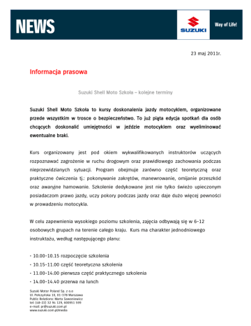 23 maj 2011r. Informacja prasowa Suzuki Shell Moto Szkoła – kolejne terminy Suzuki Shell Moto Szkoła to kursy doskonalenia jazdy motocyklem, organizowane przede wszystkim w trosce o bezpieczeństwo. To już piąta edycja spotkań dla osób chcących doskonalić umiejętności w jeździe motocyklem oraz wyeliminować ewentualne braki. Kurs organizowany jest pod okiem wykwalifikowanych instruktorów uczących rozpoznawać zagrożenie w ruchu drogowym oraz prawidłowego zachowania podczas nieprzewidzianych sytuacji. Program obejmuje zarówno część teoretyczną oraz praktyczne ćwiczenia tj.: pokonywanie zakrętów, manewrowanie, omijanie przeszkód oraz awaryjne hamowanie. Szkolenie dedykowane jest nie tylko świeżo upieczonym posiadaczom prawo jazdy, uczy pokory podczas jazdy oraz daje dużo więcej pewności w prowadzeniu motocykla. W celu zapewnienia wysokiego poziomu szkolenia, zajęcia odbywają się w 6-12 osobowych grupach na terenie całego kraju. Kurs ma charakter jednodniowego instruktażu, według następującego planu: • 10.00-10.15 rozpoczęcie szkolenia • 10.15-11.00 część teoretyczna szkolenia • 11.00-14.00 pierwsza część praktycznego szkolenia • 14.00-14.40 przerwa na lunch Suzuki Motor Poland Sp. z o.o Ul. Połczyńska 10, 01-378 Warszawa Public Relations: Marta Sawoniewicz tel: (48-22) 32 94 129, 600951 599 e-mail: [email protected] www.suzuki.com.pl/media • 14.40- 18.00 druga część praktycznego szkolenia • 18.00 zakończenie szkolenia i wręczenie certyfikatów Suzuki Shell Moto Szkoła Harmonogram czerwcowych szkoleń: Dealer Miejscowość Termin Osoba kontaktowa FreeFun Sękocin Warszawa 2011-06-04 Łukasz Wozniak Liberty Motors Warszawa 2011-06-04 Artur Iliński Liberty Motors Kielce 2011-06-05 Piotr Wiselka Pol Motors Wrocław 2011-06-11 Ania Skupińska C.M. Rider Krakow 2011-06-12 Rafał Obruśnik Suzi-Moto / Dos Toros Katowice 2011-06-18 Joanna Kucharczyk Liberty Motors Poznań 2011-06-19 Adam Chycinski Suzuki Piaseczno Piaseczno 2011-06-26 Marek Badziak Jaskłowski Warszawa 2011-06-26 Dorota Jaskłowska Zapisy według kolejności zgłoszeń prowadzą autoryzowani dealerzy Suzuki. Na zakończenie szkolenia każdy uczestnik otrzymuje certyfikat oraz będzie mógł skorzystać z promocyjnej oferty na ubezpieczenie komunikacyjne firmy UNIQA. Zapraszamy wszystkich, którzy pragną czerpać z jazdy swoim motocyklem Suzuki jeszcze więcej przyjemności! www.suzuki.pl/media Suzuki Motor Poland Sp. z o.o Ul. Połczyńska 10, 01-378 Warszawa Public Relations: Marta Sawoniewicz tel: (48-22) 32 94 129, 600951 599 e-mail: [email protected] www.suzuki.com.pl/media
