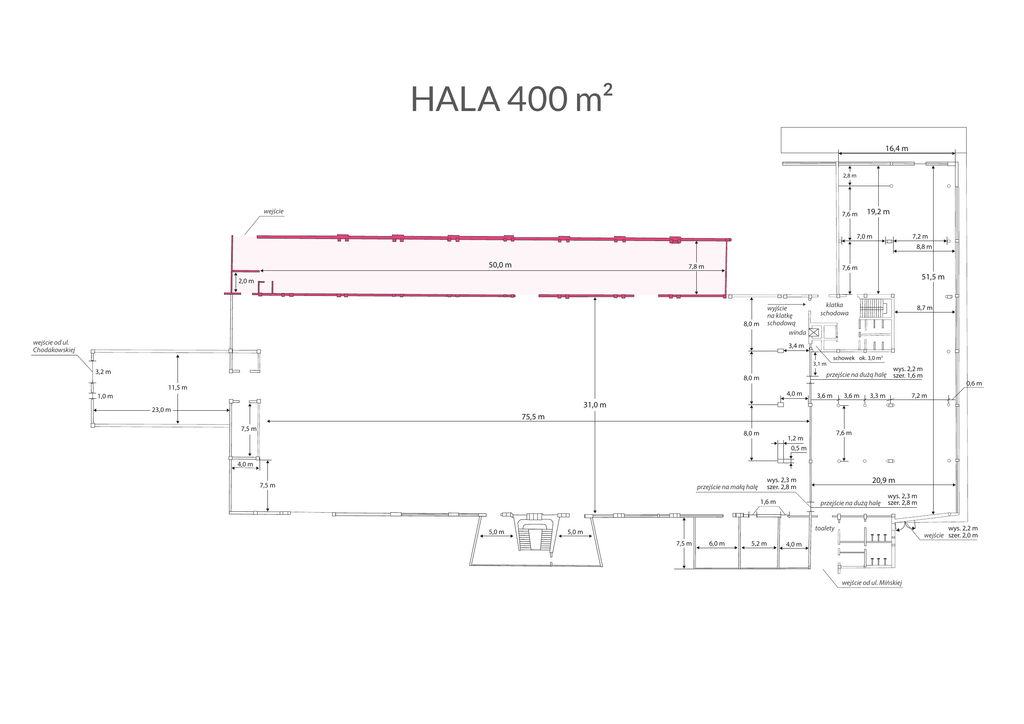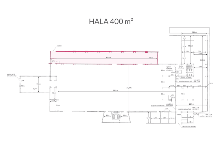 HALA 400 m² 16,4 m 2,8 m wejście 7,6 m 19,2 m 7,0 m 7,2 m 8,8 m 50,0 m 7,8 m 7,6 m 51,5 m 2,0 m wyjście na klatkę schodową winda 8,0 m wejście od ul. Chodakowskiej klatka schodowa 8,7 m 3,4 m 3,1 m 3,2 m wys. 2,2 m przejście na dużą halę szer. 1,6 m 8,0 m 11,5 m 4,0 m 1,0 m schowek ok. 3,0 m2 3,6 m 3,6 m 3,3 m 0,6 m 7,2 m 31,0 m 23,0 m 75,5 m 7,5 m 8,0 m 7,6 m 1,2 m 0,5 m 4,0 m 7,5 m przejście na małą halę 1,6 m 5,0 m 20,9 m wys. 2,3 m szer. 2,8 m przejście na dużą halę wys. 2,3 m szer. 2,8 m wys. 2,2 m wejście szer. 2,0 m toalety 5,0 m 7,5 m 6,0 m 5,2 m 4,0 m wejście od ul. Mińskiej