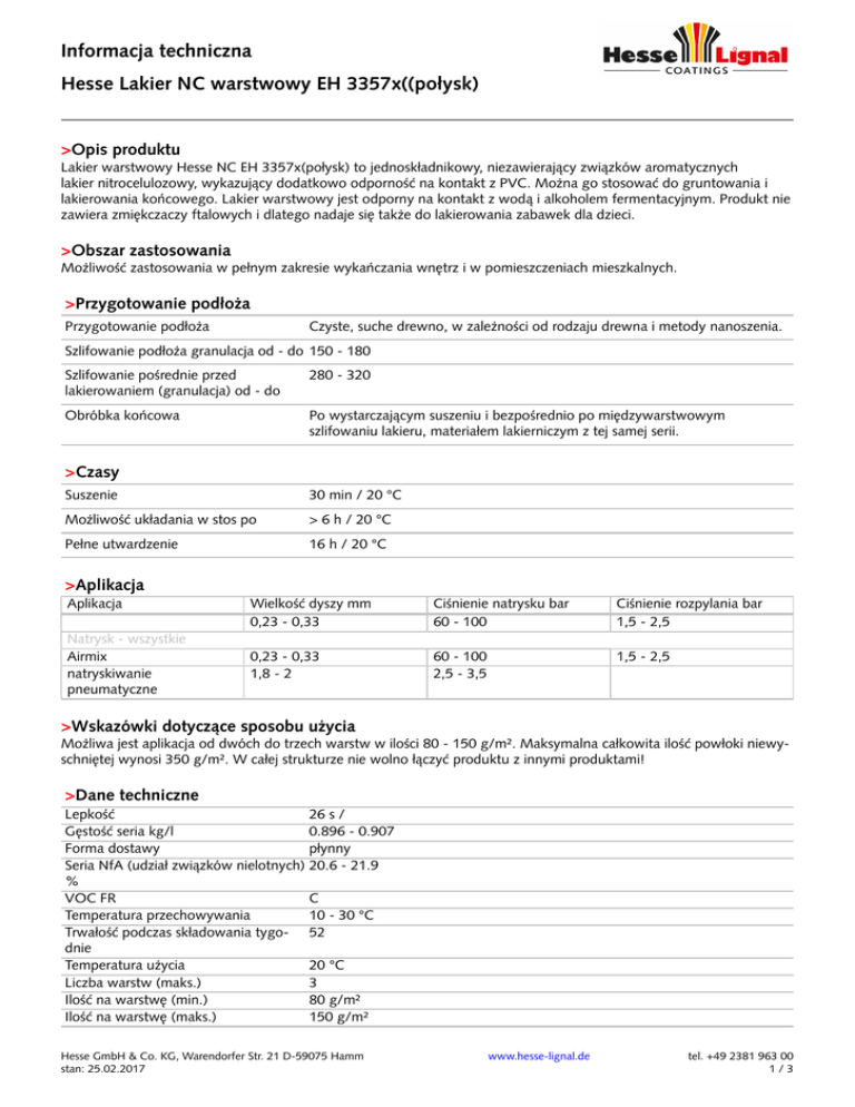 Informacja techniczna Hesse Lakier NC warstwowy EH 3357x((połysk) >Opis produktu Lakier warstwowy Hesse NC EH 3357x(połysk) to jednoskładnikowy, niezawierający związków aromatycznych lakier nitrocelulozowy, wykazujący dodatkowo odporność na kontakt z PVC. Można go stosować do gruntowania i lakierowania końcowego. Lakier warstwowy jest odporny na kontakt z wodą i alkoholem fermentacyjnym. Produkt nie zawiera zmiękczaczy ftalowych i dlatego nadaje się także do lakierowania zabawek dla dzieci. >Obszar zastosowania Możliwość zastosowania w pełnym zakresie wykańczania wnętrz i w pomieszczeniach mieszkalnych. >Przygotowanie podłoża Przygotowanie podłoża Czyste, suche drewno, w zależności od rodzaju drewna i metody nanoszenia. Szlifowanie podłoża granulacja od - do 150 - 180 Szlifowanie pośrednie przed lakierowaniem (granulacja) od - do 280 - 320 Obróbka końcowa Po wystarczającym suszeniu i bezpośrednio po międzywarstwowym szlifowaniu lakieru, materiałem lakierniczym z tej samej serii. >Czasy Suszenie 30 min / 20 °C Możliwość układania w stos po > 6 h / 20 °C Pełne utwardzenie 16 h / 20 °C >Aplikacja Aplikacja Natrysk - wszystkie Airmix natryskiwanie pneumatyczne Wielkość dyszy mm 0,23 - 0,33 Ciśnienie natrysku bar 60 - 100 Ciśnienie rozpylania bar 1,5 - 2,5 0,23 - 0,33 1,8 - 2 60 - 100 2,5 - 3,5 1,5 - 2,5 >Wskazówki dotyczące sposobu użycia Możliwa jest aplikacja od dwóch do trzech warstw w ilości 80 - 150 g/m². Maksymalna całkowita ilość powłoki niewyschniętej wynosi 350 g/m². W całej strukturze nie wolno łączyć produktu z innymi produktami! >Dane techniczne Lepkość 26 s / Gęstość seria kg/l 0.896 - 0.907 Forma dostawy płynny Seria NfA (udział związków nielotnych) 20.6 - 21.9 % VOC FR C Temperatura przechowywania 10 - 30 °C Trwałość podczas składowania tygo- 52 dnie Temperatura użycia 20 °C Liczba warstw (maks.) 3 Ilość na warstwę (min.) 80 g/m² Ilość na warstwę (maks.) 150 g/m² Hesse GmbH & Co. KG, Warendorfer Str. 21 D-59075 Hamm stan: 25.02.2017 www.hesse-lignal.de tel. +49 2381 963 00 1/3 Informacja techniczna Hesse Lakier NC warstwowy EH 3357x((połysk) >Wskazówki dotyczące zamawiania Numer zamówienia EH 33570 Połysk 60° (Gloss +/-5) 2 EH 33571 EH 33572 EH 33574 EH 33577 12 18 50 Stopień połysku Wielkość pojemnika 1 LTR, 5 LTR, 10 LTR, 25 LTR 25 LTR 5 LTR, 25 LTR 25 LTR 25 LTR tępy mat matowy jedwabisty mat jedwabisty połysk >Rozcieńczalnik Numer zamówienia NV 3939 NV 3924 Wielkość pojemnika 5 LTR, 25 LTR 1 LTR, 5 LTR, 10 LTR, 25 LTR Nazwa artykułu Rozcieńczalnik nitro Rozcieńczalnik nitro Wielkość pojemnika 1 LTR, 5 LTR, 10 LTR, 25 LTR 1 LTR, 5 LTR, 10 LTR, 25 LTR Nazwa artykułu PUR Spowalniacz Spowalniacz >Opóźniacz Numer zamówienia DV 4909 ZD 3936 >Środek do czyszczenia urządzenia Numer zamówienia RV 1 Wielkość pojemnika 5 LTR, 10 LTR, 25 LTR Nazwa artykułu Rozcieńczalnik czyszczący >Środki czyszczące i pielęgnacyjne Numer zamówienia GR 1900 Nazwa artykułu Rozcieńczalnik do oczyszczania Wielkość pojemnika 1 LTR, 25 LTR >Wskazówki specjalne Odporność w kontakcie z PVC uzyskuje się po 2 - 3 tygodniach. Po suszeniu i szlifowaniu międzywarstwowym prosimy lakierować tylko materiałem tej samej serii. >Przykład procedury Metoda powlekania i dokładne parametry obróbki są zawsze dostosowywane do warunków aplikacji i suszenia i można je znaleźć w odpowiednich dla danego klienta instrukcjach techniki obróbki powierzchni (TDO). >Wskazówki ogólne W razie potrzeby lakierowanie próbne należy przeprowadzić w warunkach odpowiadającym rzeczywistym! Hesse GmbH & Co. KG, Warendorfer Str. 21 D-59075 Hamm stan: 25.02.2017 www.hesse-lignal.de tel. +49 2381 963 00 2/3 Informacja techniczna Hesse Lakier NC warstwowy EH 3357x((połysk) >Szczególne właściwości i normy kontrolne Norma / podstawa Bezpieczeństwo zabawek DIN EN 71-3 (2002-11) Placówka kontro- Znak lna HESSE Odporny w kontakcie z PVC HESSE Nie zawiera substancji z obowiązkiem autoryzacji według załącznika XIV do rozporządzenia UE 1907/2006 (REACH). HESSE DIN 68861-część 1C (powierzchnie mebli; właściwości przy obciążeniu chemicznym) HESSE Sprawozdanie Nr odporność na działanie śliny i potu według nor- HESSE my DIN 53160 część 1 i 2: brak odbarwień (poziom 5) Nasze informacje techniczne są na bieżąco aktualizowane pod kątem stanu wiedzy technicznej i przepisów prawa. Podane wartości nie oznaczają specyfikacji, są to typowe dane produktów. Zawsze aktualną wersję można zobaczyć w Internecie na stronie www.hesse-lignal.de lub uzyskać od Państwa opiekuna klienta. Dane te mają charakter doradczy, opierają się na dobrej wierze i starannych badaniach zgodnie z aktualnym stanem techniki. Informacje te nie mają charakteru prawnie wiążącego. Oprócz tego odsyłamy Państwa do naszych warunków handlowych. Karta charakterystyki jest udostępniona zgodnie z rozporządzeniem (WE) nr 1907/2006. Hesse GmbH & Co. KG, Warendorfer Str. 21 D-59075 Hamm stan: 25.02.2017 www.hesse-lignal.de tel. +49 2381 963 00 3/3
