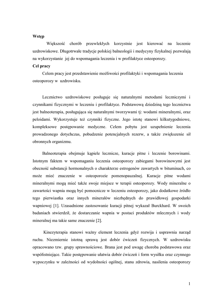 Wstęp Większość chorób przewlekłych korzystnie jest kierować na leczenie uzdrowiskowe. Długotrwałe tradycje polskiej balneologii i medycyny fizykalnej pozwalają na wykorzystanie jej do wspomagania leczenia i w profilaktyce osteoporozy. Cel pracy Celem pracy jest przedstawienie możliwości profilaktyki i wspomagania leczenia osteoporozy w uzdrowisku. Lecznictwo uzdrowiskowe posługuje się naturalnymi metodami leczniczymi i czynnikami fizycznymi w leczeniu i profilaktyce. Podstawową dziedziną tego lecznictwa jest balneoterapia, posługująca się naturalnymi tworzywami tj: wodami mineralnymi, oraz peloidami. Wykorzystuje też czynniki fizyczne. Jego istotę stanowi kilkutygodniowe, kompleksowe postępowanie medyczne. Celem pobytu jest uzupełnienie leczenia prowadzonego dotychczas, pobudzenie potencjalnych rezerw, a także zwiększenie sił obronnych organizmu. Balneoterapia obejmuje kąpiele lecznicze, kuracje pitne i leczenie borowinami. Istotnym faktem w wspomaganiu leczenia osteoporozy zabiegami borowinowymi jest obecność substancji hormonalnych o charakterze estrogenów zawartych w bituminach, co może mieć znaczenie w osteoporozie pomenopauzalnej. Kuracje pitne wodami mineralnymi mogą mieć także swoje miejsce w terapii osteoporozy. Wody mineralne o zawartości wapnia mogą być pomocnicze w leczeniu osteoporozy, jako dodatkowe źródło tego pierwiastka oraz innych minerałów niezbędnych do prawidłowej gospodarki wapniowej [1]. Uzasadnione zastosowanie kuracji pitnej wykazał Burckhard. W swoich badaniach stwierdził, że dostarczanie wapnia w postaci produktów mlecznych i wody mineralnej ma takie same znaczenie [2]. Kinezyterapia stanowi ważny element leczenia gdyż rozwija i usprawnia narząd ruchu. Niezmiernie istotną sprawą jest dobór ćwiczeń fizycznych. W uzdrowisku opracowano tzw. grupy sprawnościowe. Brana jest pod uwagę choroba podstawowa oraz współistniejące. Takie postępowanie ułatwia dobór ćwiczeń i form wysiłku oraz czynnego wypoczynku w zależności od wydolności ogólnej, stanu zdrowia, nasilenia osteoporozy 1 oraz wieku chorego [3]. Pozwala to na zastosowanie różnych form ruchu i wysiłku u każdego pacjenta zgłaszającego się na leczenie w uzdrowisku. Unikalną formą leczenia stosowaną głównie w uzdrowisku jest terenoterapia, czyli chodzenie wyznaczonymi ścieżkami wg wskazówek lekarskich [4]. Elementami działającymi na organizm jest wysiłek dynamiczny połączony z pokonywaniem dystansu w terenie i oddziaływanie czynników środowiska przyrodniczego. W szerszym znaczeniu do terenoterapii należy zaliczyć, oprócz spacerów, inne formy ćwiczeń wytrzymałościowych w terenie, szczególnie zalecane w osteoporozie marsze, marszobiegi, biegi, jak również biegi na nartach, jazda na rowerze i niektóre zajęcia na ścieżkach zdrowia . Metody fizykoterapii mają znaczenie uzupełniające w stosunku do zabiegów przyrodoleczniczych. Metodą, której bezpośredni wpływ na wzrost tkanki kostnej udowodniono bezspornie, jest magnetoterapia . Obecnie uważa się, że pola magnetyczne, zwłaszcza o niskiej częstotliwości ingerują w procesy osteogenezy. Zwiększając wykorzystanie tlenu przez komórki i tkanki pole magnetyczne nasila procesy oddychania tkankowego, co w konsekwencji pobudza działanie osteoblastów i poprawia unaczynienie tworzącej się tkanki kostnej [4]. Krioterapia to stosowanie na zewnętrzną powierzchnię ciała temperatury poniżej 100 0C. Może być zastosowana miejscowo lub ogólnie. W wyniku działania zimna dochodzi do rozluźnienia napiętych mięśni i zwiększenia ich siły. Wszystko to stwarza dobre warunki do ćwiczeń, które można trzykrotnie przedłużyć i zintensyfikować [5]. Innym efektem zastosowania krioterapii ogólnoustrojowej w osteoporozie jest wciąż pozostające w fazie badań wielokierunkowe oddziaływanie tej metody na układ kostny. W leczeniu osteoporozy zastosowanie może również znaleźć fototerapia z wykorzystaniem UV B i helioterapia, czyli leczenie słońcem. W obu przypadkach wykorzystuje się stymulujący wpływ promieniowania UV na zapoczątkowanie syntezy witaminy D w skórze. W uzdrowisku kojarzy się wpływ klimatu z racjonalnym dawkowaniem promieniowania słonecznego. Właściwa dieta jest jednym z podstawowych elementów zapobiegania osteoporozie i jej leczenia. Pacjenci przebywający w uzdrowisku korzystając ze zbiorowego żywienia, mają doskonałą okazję do zapoznania się z właściwą dietą zalecaną w osteoporozie. 2 Edukacja zdrowotna powinna być częścią składową każdego programu leczniczego. Podstawowym jej celem jest kształtowanie prawidłowych nawyków żywienia, stymulowanie do porzucenia nałogów i zwiększenia aktywności fizycznej. Powinien być opracowany program zawierający elementy informacyjne oraz aktywizujące chorego. W przypadku osteoporozy staje się konieczne przeprowadzenie masowych badań przesiewowych. Wczesna diagnostyka osteoporozy stosowana podczas pobytu w uzdrowisku może się znacznie przyczynić do ograniczenia następstw tej choroby. Przy kierowaniu do uzdrowiska obowiązuje reguła: „właściwy chory, we właściwym czasie, do właściwego uzdrowiska” [6]. Do leczenia szpitalnego kwalifikują się pacjenci z osteoporozą uogólnioną o średnim stopniu zaawansowania wg kryteriów WHO, z przebytymi złamaniami lub bez złamań, ale z istnieniem czynników ryzyka. Do leczenia sanatoryjnego i ambulatoryjnego kierowani są pacjenci z osteoporozą lub osteopenią. Przeciwwskazania dotyczą osteoporozy wtórnej, ze świeżym złamaniem i powikłaniami. Podsumowanie Uzdrowiska mogą przyczyniać się do propagowania ruchu jako czynnika wzmagającego mineralizację kości. Pobyt w uzdrowisku jest szczególnie dobrym okresem do prowadzenia edukacji zdrowotnej . Badania przesiewowe powinny być powszechnie stosowane w uzdrowiskach co może przyczynić się do wczesnego rozpoznawania i ograniczenia następs