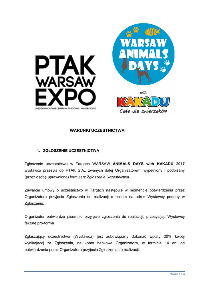 WARUNKI UCZESTNICTWA 1. ZGŁOSZENIE UCZESTNICTWA Zgłoszenie uczestnictwa w Targach WARSAW ANIMALS DAYS with KAKADU 2017 wystawca przesyła do PTAK S.A., zwanych dalej Organizatorem, wypełniony i podpisany (przez osobę uprawnioną) formularz Zgłoszenie Uczestnictwa. Zawarcie umowy o uczestnictwo w Targach następuje w momencie potwierdzenia przez Organizatora przyjęcia Zgłoszenia do realizacji e-mailem na adres Wystawcy podany w Zgłoszeniu. Organizator potwierdza pisemnie przyjęcie zgłoszenia do realizacji, przesyłając Wystawcy fakturę pro-forma. Zgłaszający uczestnictwo (Wystawca) jest zobowiązany dokonać wpłaty 20% kwoty wynikającej ze Zgłoszenia, na konto bankowe Organizatora, w terminie 14 dni od potwierdzenia przez Organizatora przyjęcia Zgłoszenia do realizacji. Strona 1 z 4 Pozostałą należność wynikającą z zamówień Wystawca zobowiązany jest uiścić najpóźniej na 14 dni przed objęciem stoiska targowego, tj. do 24 marca 2017 r. W przypadku dokonania zgłoszenia w terminie po dniu 24 marca 2017 roku zgłaszający uczestnictwo zobowiązany jest dokonać wpłaty 100% kwoty wynikającej ze Zgłoszenia, na konto bankowe Organizatora, w terminie 7 dni od potwierdzenia przez Organizatora przyjęcia Zgłoszenia do realizacji, nie później jednak niż do pierwszego dnia targów. Warunkiem objęcia stoiska jest udokumentowanie dokonania wszystkich wpłat lub uregulowanie całkowitej należności na miejscu. 2. ODSTĄPIENIE I REZYGNACJA Z UCZESTNCTWA W TARGACH Wystawca ma prawo zrezygnować z uczestnictwa w Targach pod warunkiem pisemnego zawiadomienia Organizatora nie później niż w ciągu 14 dni od daty otrzymania od Organizatora potwierdzenia przyjęcia Zgłoszenia do realizacji. Organizator pobiera wówczas tylko opłatę manipulacyjną w wysokości opłaty rejestracyjnej. Wycofanie przez Wystawcę jego zgłoszenia oraz brak zgłoszenia rezygnacji po okresie 14 dni od daty otrzymania od Organizatora potwierdzenia przyjęcia Zgłoszenia do realizacji nie zwalnia Wystawcy z obowiązku zapłaty całości wszystkich opłat wynikających ze Zgłoszenia Uczestnictwa. Dokumenty zgłoszeniowe są do pobrania na stronie: www.animalsdays.eu 3. UDOSTĘPNIENIE POWIERZCHNI Opłata za udostępnienie powierzchni wystawienniczej obejmuje: - korzystanie przez Wystawcę z powierzchni wystawienniczej w okresie Targów, - korzystanie ze wspólnie użytkowanej powierzchni, - utrzymanie czystości przejść i korytarzy w hali, - zabezpieczenie hali przez służby ochrony oraz zabezpieczenie p/poż., - reklamę i promocję Targów. W ramach zakupionej powierzchni Wystawcy przysługują następujące usługi ze strony Organizatora Targów: - wpis do katalogu na 1 stronie A5 w dwóch wersjach językowych: polskiej i angielskiej /Uwaga: Wystawca dostarcza Organizatorowi gotowy tekst w dwóch wersjach językowych: Strona 2 z 4 Informacja o firmie – nazwa, dane teleadresowe, logo oraz tekst informacyjny w języku polskim na 1/2 strony oraz bliźniacza wersja w języku angielskim na kolejne 1/2 strony A5/ - 1 miejsce parkingowe - karty wystawcy dla obsługi stoiska (uprawniające do wejścia na Targi) – w liczbie po 2 szt. - zaproszenia dla własnych gości targowych – 30 sztuk. 5. A. WARUNKI PŁATNOŚCI Dokonując zgłoszenia udziału w targach, Wystawca zobowiązany dokonać wpłaty 20% kwoty wynikającej ze Zgłoszenia, na konto bankowe Organizatora, w terminie 14 dni od potwierdzenia przez Organizatora przyjęcia Zgłoszenia do realizacji. Pozostałą należność wynikającą z zamówień Wystawca zobowiązany jest uiścić najpóźniej na 14 dni przed objęciem stoiska targowego, tj. do 24 marca 2017 r. W przypadku dokonania zgłoszenia w terminie po dniu 24 marca 2017 roku zgłaszający uczestnictwo zobowiązany jest dokonać wpłaty 100% kwoty wynikającej ze Zgłoszenia, na konto bankowe Organizatora, w terminie 7 dni od potwierdzenia przez Organizatora przyjęcia Zgłoszenia do realizacji, nie później jednak niż do pierwszego dnia targów. B. W razie zwłoki Wystawcy z zapłatą którejkolwiek części wynagrodzenia Organizatorowi przysługiwać będą dodatkowo odsetki za zwłokę w wysokości wynikającej z art. 359 § 2[1] Kodeksu Cywilnego (odsetki ustawowe). C. Brak wpłaty całości należności za udział w targach upoważnia Organizatora do odmówienia Wystawcy udziału w Targach i pozbawia Wystawcę prawa do dochodzenia roszczeń z tego tytułu. 6. BEZPIECZEŃSTWO Organizator nie ponosi odpowiedzialności za wypadki osób ani uszkodzenie eksponatów znajdujących się na terenach targowych przed, po i w trakcie trwania Targów. Wystawca zobowiązany jest do zabezpieczenia eksponatów własnych w godzinach trwania ekspozycji przed ewentualnymi szkodami, a przed zamknięciem ekspozycji zabezpieczenie ich w sposób uniemożliwiający uszkodzenie. Strona 3 z 4 Organizator nie odpowiada za przerwy w dostawie prądu lub wody oraz za szkody spowodowane siłą wyższą jak strajki, zamieszki, pożar, uderzenie pioruna, huragan, powódź, grad, deszcz. Dotyczy to również okresu po zakończeniu Targów gdy eksponaty, urządzenia pozostają na terenie targowym. 7. REKLAMACJE I ROSZCZENIA Wszelkie reklamacje i roszczenia wynikające z udziału w Targach winny być zgłaszane w formie pisemnej najpóźniej do ostatniego dnia Targów. Po upływie tego terminu żadne reklamacje i roszczenia nie będą uwzględniane. Wszelki porozumienia pomiędzy Wystawcą a Organizatorem a także wszelkie decyzje z nich wynikające wymagają formy pisemnej pod rygorem nieważności. 8. DANE KONTAKTOWE Wszystkie zapytania i Zgłoszenie Uczestnictwa prosimy przesyłać na adres e-mail: [email protected] , na adres WARSAW EXPO Al. Katowicka 62, 05-830 Nadarzyn z dopiskiem Targi Dni Alergii i Nietolerancji Pokarmowej i ECOORGANICAWARSAW ANIMALS DAYS 2017. Strona 4 z 4