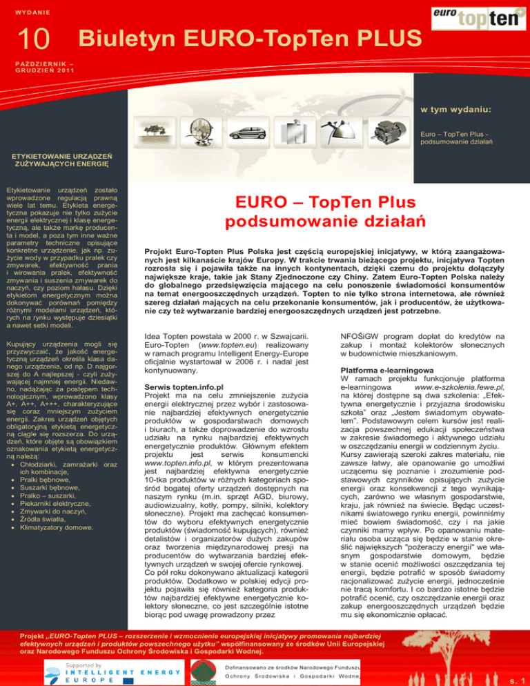 WY D AN I E 10 Biuletyn EURO-TopTen PLUS P AŹ D Z I ER N IK – GRUDZIEŃ 2011 w tym wydaniu: Euro – TopTen Plus podsumowanie działań ETYKIETOWANIE URZĄDZEŃ ZUŻYWAJĄCYCH ENERGIĘ Etykietowanie urządzeń zostało wprowadzone regulacją prawną wiele lat temu. Etykieta energetyczna pokazuje nie tylko zużycie energii elektrycznej i klasę energetyczną, ale także markę producenta i model, a poza tym inne ważne parametry techniczne opisujące konkretne urządzenie, jak np. zużycie wody w przypadku pralek czy zmywarek, efektywność prania i wirowania pralek, efektywność zmywania i suszenia zmywarek do naczyń, czy poziom hałasu. Dzięki etykietom energetycznym można dokonywać porównań pomiędzy różnymi modelami urządzeń, których na rynku występuje dziesiątki a nawet setki modeli. Kupujący urządzenia mogli się przyzwyczaić, że jakość energetyczną urządzeń określa klasa danego urządzenia, od np. D najgorszej do A najlepszej - czyli zużywającej najmniej energii. Niedawno, nadążając za postępem technologicznym, wprowadzono klasy A+, A++, A+++, charakteryzujące się coraz mniejszym zużyciem energii. Zakres urządzeń objętych obligatoryjną etykietą energetyczną ciągle się rozszerza. Do urządzeń, które objęte są obowiązkiem oznakowania etykietą energetyczną należą: Chłodziarki, zamrażarki oraz ich kombinacje, Pralki bębnowe, Suszarki bębnowe, Pralko – suszarki, Piekarniki elektryczne, Zmywarki do naczyń, Źródła światła, Klimatyzatory domowe. EURO – TopTen Plus podsumowanie działań Projekt Euro-Topten Plus Polska jest częścią europejskiej inicjatywy, w którą zaangażowanych jest kilkanaście krajów Europy. W trakcie trwania bieżącego projektu, inicjatywa Topten rozrosła się i pojawiła także na innych kontynentach, dzięki czemu do projektu dołączyły największe kraje, takie jak Stany Zjednoczone czy Chiny. Zatem Euro-Topten Polska należy do globalnego przedsięwzięcia mającego na celu ponoszenie świadomości konsumentów na temat energooszczędnych urządzeń. Topten to nie tylko strona internetowa, ale również szereg działań mających na celu przekonanie konsumentów, jak i producentów, że użytkowanie czy też wytwarzanie bardziej energooszczędnych urządzeń jest potrzebne. Idea Topten powstała w 2000 r. w Szwajcarii. Euro-Topten (www.topten.eu) realizowany w ramach programu Intelligent Energy-Europe oficjalnie wystartował w 2006 r. i nadal jest kontynuowany. Serwis topten.info.pl Projekt ma na celu zmniejszenie zużycia energii elektrycznej przez wybór i zastosowanie najbardziej efektywnych energetycznie produktów w gospodarstwach domowych i biurach, a także doprowadzenie do wzrostu udziału na rynku najbardziej efektywnych energetycznie produktów. Głównym efektem projektu jest serwis konsumencki www.topten.info.pl, w którym prezentowana jest najbardziej efektywna energetycznie 10-tka produktów w różnych kategoriach spośród bogatej oferty urządzeń dostępnych na naszym rynku (m.in. sprzęt AGD, biurowy, audiowizualny, kotły, pompy, silniki, kolektory słoneczne). Projekt ma zachęcać konsumentów do wyboru efektywnych energetycznie produktów (świadomość kupujących), również detalistów i organizatorów dużych zakupów oraz tworzenia międzynarodowej presji na producentów do wytwarzania bardziej efektywnych urządzeń w swojej ofercie rynkowej. Co pół roku dokonywano aktualizacji kategorii produktów. Dodatkowo w polskiej edycji projektu pojawiła się również kategoria produktów najbardziej efektywne energetycznie kolektory słoneczne, co jest szczególnie istotne biorąc pod uwagę prowadzony przez NFOŚiGW program dopłat do kredytów na zakup i montaż kolektorów słonecznych w budownictwie mieszkaniowym. Platforma e-learningowa W ramach projektu funkcjonuje platforma e-learningowa www.e-szkolenia.fewe.pl, na której dostępne są dwa szkolenia: „Efektywna energetycznie i przyjazna środowisku szkoła” oraz „Jestem świadomym obywatelem”. Podstawowym celem kursów jest realizacja powszechnej edukacji społeczeństwa w zakresie świadomego i aktywnego udziału w oszczędzaniu energii w codziennym życiu. Kursy zawierają szeroki zakres materiału, nie zawsze łatwy, ale opanowanie go umożliwi uczącemu się poznanie i zrozumienie podstawowych czynników opisujących zużycie energii oraz konsekwencji z tego wynikających, zarówno we własnym gospodarstwie, kraju, jak również na świecie. Będąc uczestnikami światowego rynku energii, powinniśmy mieć bowiem świadomość, czy i na jakie czynniki mamy wpływ. Po opanowaniu materiału osoba ucząca się będzie w stanie określić największych "pożeraczy energii" we własnym gospodarstwie domowym, będzie w stanie ocenić możliwości oszczędzania tej energii, będzie potrafić w sposób świadomy racjonalizować zużycie energii, jednocześnie nie tracą komfortu. I co bardzo istotne będzie potrafić ocenić, czy oszczędzanie energii oraz zakup energooszczędnych urządzeń będzie mu się ekonomicznie opłacać. Projekt „EURO-Topten PLUS – rozszerzenie i wzmocnienie europejskiej inicjatywy promowania najbardziej efektywnych urządzeń i produktów powszechnego użytku” współfinansowany ze środków Unii Europejskiej oraz Narodowego Funduszu Ochrony Środowiska i Gospodarki Wodnej. s. 1 NA CO ZWRÓCIĆ UWAGĘ PRZY KUPNIE I EKSPLOATACJI SPRZĘTU BIUROWEGO I ELEKTRONICZNEGO? Urządzenia elektroniki użytkowej należą do grupy najdynamiczniej rozwijających się. Na rynku dostępne są setki modeli telewizorów, wież stereofonicznych, wszelkiego rodzaju odtwarzaczy, itd. Bardzo podobna sytuacja występuje również w przypadku urządzeń biurowych, jak np. komputery, laptopy, drukarki, a także w grupie małych urządzeń, jak palmtopy, faksy itp. Oczywiście postęp ten wiąże się często ze zwiększaniem możliwości tych urządzeń, poprawianiem jakości obrazu, dźwięku, dr
