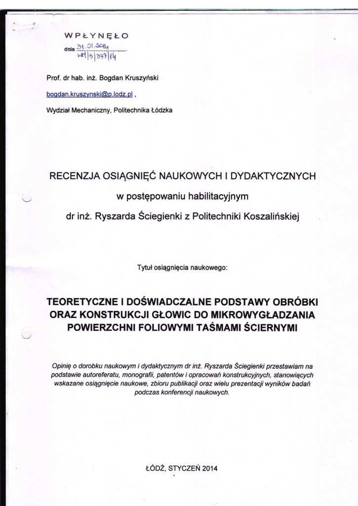 W P Ł Y N Ę Ł O dniaM:?.'.:^ Prof. dr hab. inż. Bogdan Kruszyński [email protected], Wydział Mechaniczny, Politechnika Łódzka RECENZJA OSIĄGNIĘĆ NAUKOWYCH I DYDAKTYCZNYCH w postępowaniu habilitacyjnym dr inż. Ryszarda Ściegienki z Politechniki Koszalińskiej Tytuł osiągnięcia naukowego: TEORETYCZNE I DOŚWIADCZALNE PODSTAWY OBRÓBKI ORAZ KONSTRUKCJI GŁOWIC DO MIKROWYGŁADZANIA POWIERZCHNI FOLIOWYMI TAŚMAMI ŚCIERNYMI Opinię o dorobku naukowym i dydaktycznym dr inż. Ryszarda Ściegienki przestawiam na podstawie autoreferatu, monografii, patentów i opracowań konstrukcyjnych, stanowiących wskazane osiągnięcie naukowe, zbioru publikacji oraz wielu prezentacji wyników badań podczas konferencji naukowych. ŁÓDŹ, STYCZEŃ 2014 Jako osiągnięcie naukowe Kandydat wskazał: 1. Monografię pod t y t u ł e m : Teoretyczne i doświadczalne podstawy mikrowygładzania powierzchni foliami ściernymi, 2. Podstawy b u d o w y urządzeń do mikrowygładzania u d o k u m e n t o w a n e w 3. patentach, 4. zgłoszeniach patentowych oraz w opracowaniach k o n s t r u k c y j n y c h , a mianowicie: PATENTY • Małogabarytowa głowica do mikrowygładzania foliami ściernymi. Ściegienka R., Kacalak W., Lewkowicz R., Plichta S. Patent nr PL 181922 B 1 - 31.10.2001. WSInż. Koszalin 1996. BUP 13/1997 s.19. • Głowica do mikrowygładzania otworów foliowymi taśmami ściernymi. Ściegienka R., Lewkowicz R., Kacalak W., Bokiej S. Politechnika Koszalińska 1999. Decyzja UP RP o udzieleniu patentu na wynalazek z 12.04.2005. Patent nr PL 190466 B 1 . BUP 05/2000 s.18. • Głowica do mikrowygładzania otworów foliowymi taśmami ściernymi. Ściegienka R. Lewkowicz R., Kacalak W., Bokiej S. Politechnika Koszalińska 1999. Decyzja UP RP o udzieleniu patentu na wynalazek z 12.04.2005. Patent nr PL 190467 B 1 . BUP 05/2000 s.19. ZGŁOSZENIA PATENTOWE • Głowica do mikrowygładzania otworów foliowymi taśmami ściernymi. Ściegienka R., Lewkowicz R., Kacalak W. Politechnika Koszalińska 27.10.2010. Zgł. P.-393071 z 2010-11-29. BUP 12/2012 s.8. • Obrabiarka do mikroskrawania albo wygładzania ściernego w komorze próżniowej. Ściegien-ka R., Lewkowicz R., Kacalak W., Bokiej S. Politechnika Koszalińska 3.11.2010. Zgł. P.-393211 z 2010-12-10. BUP 13/2012 s.6. • Głowica do mikrowygładzania foliowymi taśmami ściernymi zewnętrznych powierzchni walcowych. Ściegienka R., Lewkowicz R., Kacalak W., Charkiewicz L., Bokiej S. Politechnika Koszalińska 22.11.2010. Zgł. P.-393247 z 2010-12-13. BUP 13/2012 s.8. • Przyrząd do mikrowygładzania foliowymi taśmami ściernymi wałków umieszczonych w komorze próżniowej. Ściegienka R., Lewkowicz R., Kacalak W., Bokiej S., Markiewicz A. Politechnika Koszalińska 30.11.2010. Zgł. P.-393355 z 2010-12-20. BUP 14/2012 s.11. (wszystkim zgłoszeniom patentowym już po przesłaniu w n i o s k u udzielono patentu) OPRACOWANIA KONSTRUKCYJNE • Opracowanie konstrukcji głowicy do mikrowygładzania foliami ściernymi typu GM-1 (do ZM-1) WSInż. Koszalin 1995. Ściegienka R., Kacalak W., Lewkowicz R., Plichta S. • Opracowanie konstrukcji głowicy do nieoscylacyjnego mikrowygładzania otworów foliowymi taśmami ściernymi typu GO-1. Politechnika Koszalińska. Koszalin 1998. Ściegienka R. • Opracowanie dokumentacji konstrukcyjnej głowicy do mikrowygładzania otworów foliowymi taśmami ściernymi typu GO-1. Politechnika Koszalińska. Koszalin 4.06.2007 - do prototypu/ 2009 - po prototypie. Projekt badawczy rozwojowy R03 025 02. • Opracowanie dokumentacji konstrukcyjnej głowicy do mikrowygładzania oscylacyjnego otworów foliowymi taśmami ściernymi typu GO-2. Politechnika Koszalińska. Koszalin 2.07.2007 - do prototypu/ 2009 - po prototypie. Projekt badawczy rozwojowy R03 025 02. • Opracowanie dokumentacji konstrukcyjnej głowicy do mikrowygładzania otworów foliowymi taśmami ściernymi typu GO-3. Politechnika Koszalińska. Koszalin 5.09.2007 - do prototypu/ 2009 - po prototypie. Projekt badawczy rozwojowy R03 025 02. • Opracowanie dokumentacji konstrukcyjnej głowicy do mikrowygładzania oscylacyjnego otworów foliowymi taśmami ściernymi typu GO-4. Politechnika Koszalińska. Koszalin 17.09.2007 - do prototypu/ 2009 - po prototypie. Projekt badawczy rozwojowy R03 025 02. • Opracowanie dokumentacji konstrukcyjnej głowicy do mikrowygładzania wałków foliowymi taśmami ściernymi typu GW-1. Politechnika Koszalińska. Koszalin 29.02.2008 - do prototypu/ 2009 - po prototypie. Projekt badawczy rozwojowy R03 025 02. • Opracowanie konstrukcji zestawu laboratoryjnego do badań podstawowych procesów mikroskrawania w próżni. WSInż. Koszalin 1995. Ściegienka R., Kacalak W., Lewkowicz R., Czyżniewski A. 1. PRZEBIEG DZIAŁALNOŚCI ZAWODOWEJ Dr inż. R. Ściegienka rozpoczął swoją działalność z a w o d o w ą w 1971 roku w Dziale Konstrukcyjnym w Koszalińskiej W y t w ó r n i Części S a m o c h o d o w y c h , (późniejsza nazwa Koszalińskie Z a k ł a d y Naprawy S a m o c h o d ó w ) . Z a j m o w a ł się t a m projektowaniem obrabiarek specjalizowanych. R ó w n o c z e ś n i e studiował s y s t e m e m w i e c z o r o w y m . Studia inżynierskie ukończył w 1975 roku, a studia magisterskie w 1980 roku. O d 1976 roku kierował pracą 5-cio osobowej Sekcji Obrabiarek. W tym okresie uczestniczył w 5 konferencjach n a u k o w y c h , także j a k o autor referatu n a u k o w e g o . W 1980 roku przeniósł się do Z a k ł a d ó w Maszyn i Urządzeń Technologicznych „ U N I T R A - U N I M A " w Koszalinie przemianowanych następnie na Zakład Techniki Próżniowej „ T E P R O " . Kierował pracami kilkunastoosobowej konstrukcyjnej Pracowni Mechanicznej, w której projektowano specjalizowane obrabiarki oraz urządzenia technologiczne dla przemysłu elektronicznego. W 1983 a w a n s o w a ł na stanowisko G ł ó w n e g o Konstruktora i kierował pracami czterech pracowni konstrukcyjnych oraz prototypo