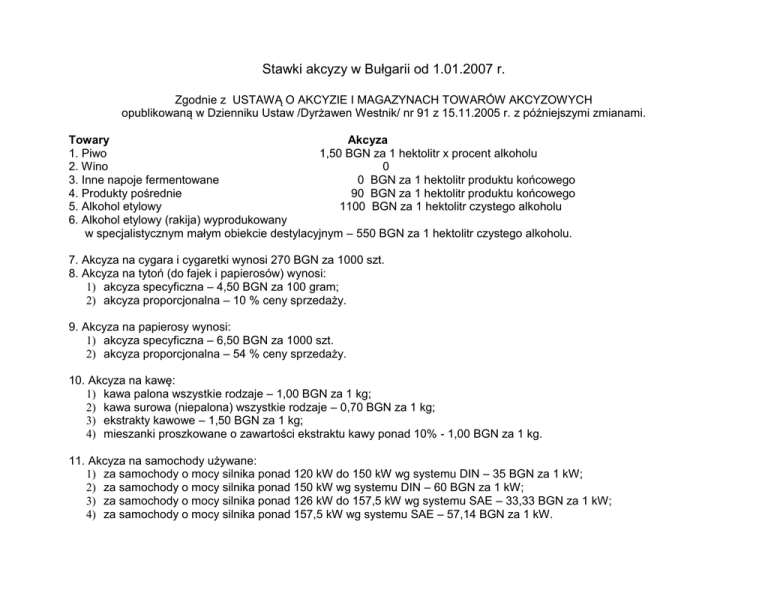 Stawki akcyzy w Bułgarii od 1.01.2007 r. Zgodnie z USTAWĄ O AKCYZIE I MAGAZYNACH TOWARÓW AKCYZOWYCH opublikowaną w Dzienniku Ustaw /Dyrżawen Westnik/ nr 91 z 15.11.2005 r. z późniejszymi zmianami. Towary Akcyza 1. Piwo 1,50 BGN za 1 hektolitr x procent alkoholu 2. Wino 0 3. Inne napoje fermentowane 0 BGN za 1 hektolitr produktu końcowego 4. Produkty pośrednie 90 BGN za 1 hektolitr produktu końcowego 5. Alkohol etylowy 1100 BGN za 1 hektolitr czystego alkoholu 6. Alkohol etylowy (rakija) wyprodukowany w specjalistycznym małym obiekcie destylacyjnym – 550 BGN za 1 hektolitr czystego alkoholu. 7. Akcyza na cygara i cygaretki wynosi 270 BGN za 1000 szt. 8. Akcyza na tytoń (do fajek i papierosów) wynosi: 1) akcyza specyficzna – 4,50 BGN za 100 gram; 2) akcyza proporcjonalna – 10 % ceny sprzedaży. 9. Akcyza na papierosy wynosi: 1) akcyza specyficzna – 6,50 BGN za 1000 szt. 2) akcyza proporcjonalna – 54 % ceny sprzedaży. 10. Akcyza na kawę: 1) kawa palona wszystkie rodzaje – 1,00 BGN za 1 kg; 2) kawa surowa (niepalona) wszystkie rodzaje – 0,70 BGN za 1 kg; 3) ekstrakty kawowe – 1,50 BGN za 1 kg; 4) mieszanki proszkowane o zawartości ekstraktu kawy ponad 10% - 1,00 BGN za 1 kg. 11. Akcyza na samochody używane: 1) za samochody o mocy silnika ponad 120 kW do 150 kW wg systemu DIN – 35 BGN za 1 kW; 2) za samochody o mocy silnika ponad 150 kW wg systemu DIN – 60 BGN za 1 kW; 3) za samochody o mocy silnika ponad 126 kW do 157,5 kW wg systemu SAE – 33,33 BGN za 1 kW; 4) za samochody o mocy silnika ponad 157,5 kW wg systemu SAE – 57,14 BGN za 1 kW. 12. Stawka akcyzy na samochody nowe: 1) Siedemset BGN + 90 BGN za 1 kW od różnicy ponad 120 kW wg systemu DIN; 2) Siedemset BGN + 85,71 BGN za 1 kW od różnicy ponad 126 kW wg systemu SAE. 13. Akcyza na paliwa silnikowe: 1) Benzyna ołowiowa o kodach celnych wg Taryfy Celnej /Nomenklatury Scalonej) 2710 11 31 0, 2710 11 51 i 2710 11 59 – 830 BGN za 1000 litrów; 2) Benzyna bezołowiowa o kodach celnych 2710 11 31, 2710 11 41, 2710 11 45 i 2710 11 49 – 635 BGN za 1000 litrów; 3) Oleje napędowe o kodach od 2710 19 41 do 2710 19 49 – 535 BGN za 1000 litrów; 4) Paliwo do silników odrzutowych o kodach 2710 19 21 i 2710 19 25 – 485 BGN za 1000 litrów; 5) Gaz Propan (LPG) o kodach od 2711 12 11 do 2711 19 00 włącznie z kodami 2901, 2711 29, od 2902 11 do 2902 44 – 340 BGN za 1000 kg; 6) Gaz ziemny o kodach 2711 11 00 i 2711 21 00 – 0 za 1 gigadżul; 7) za biodisel kod 3824 9099 i bioetanol kod 2207 20 00 - 0 BGN za 1000 litrów. 14. Akcyza na paliwa silnikowe wykorzystywane w gospodarstwach rolnych przez producentów rolnych, posiadających zgodę na pomoc finansową zgodnie z Ustawą o wspieraniu producentów rolnych, jak niżej: 1) Oleje napędowe o kodach celnych od 2710 19 41 do 2710 19 49 – 50 BGN za 1000 litrów; 2) Paliwo do silników odrzutowych o kodach celnych 2710 19 21 i 2710 19 25 – 50 BGN za 1000 litrów; 3) Gaz ziemny o kodach 2711 11 00 i 2711 21 00 – 0 BGN za gigadżul; 4) za biodisel kod 3824 90 99 i bioetanol kod 2207 20 00 – 0 BGN za 1000 litrów. 15. Akcyza na produkty paliwowe wynosi jak niżej: 1) Kod 2710 11 (inne niż paliwa wymienione w poz.13 i 14), jak również o kodach 2707 10, 270 20, 2707 30, 2707 50, 2709 - 635 BGN za 1000 litrów, 2) Produkty paliwowe o kodach od 2710 19, inne niż wymienione w poz. 13 i 14 – 535 BGN za 1000 litrów; 3) Na produkty paliwowe przeznaczone do dolewania lub rozcieńczania paliw silnikowych – stawka jak w poz. 13 pkt. 1-5, w zależności od tego do jakiego rodzaju paliwa są przeznaczone. Jeżeli nie można określić do jakiego rodzaju paliwa są przeznaczone, stawka wynosi 635 BGN za 1000 litrów. 16. Akcyza na produkty paliwowe do ogrzewania. 1) Oleje opałowe o kodach od 2710 19 41 do 2710 19 49 – 50 BGN za 1000 litrów; 2) Oleje opałowe ciężkie o kodach od 2710 19 61 do 2710 19 69 i produkty paliwowe o kodach 2706, 2707 91, 2707 99 11, 2707 99 19, 2710 91 i 271099 – 30 BGN za 1000 kg; 3) Paliwo do silników odrzutowych o kodach 2710 19 21 i 2710 19 25 – 50 BGN za 1000 litrów; 4) Gaz Propan (LPG) o kodach od 2711 12 11 do 2711 19 00 – 0 BGN za 1000 kg; 5) Gaz ziemny o kodach 2711 11 00 i 2711 21 00 – 0 BGN za gigadżul; 6) za biodisel kod 38249099 – 0 BGN za 1000 litrów. 7) węgiel i koks o kodach 2701, 2702 i 2704 – 0,30 BGN za gigadżul. 16. Akcyza na energię elektryczną kod 2716 - 1 BGN za Mwh, z wyjątkiem energii dla potrzeb bytowych ludności, na którą stawka wynosi 0 BGN za Mwh. Szczegóły dotyczące akcyzy podane są w Ustawie wymienionej na wstępie oraz w Regulaminie stosowania ustawy opublikowanym w Dzienniku Ustaw /Dyrżawen Westnik/ Nr 42 z 23 maja 2006 r. z późniejszymi zmianami. WPHI Sofia, 2007 r.