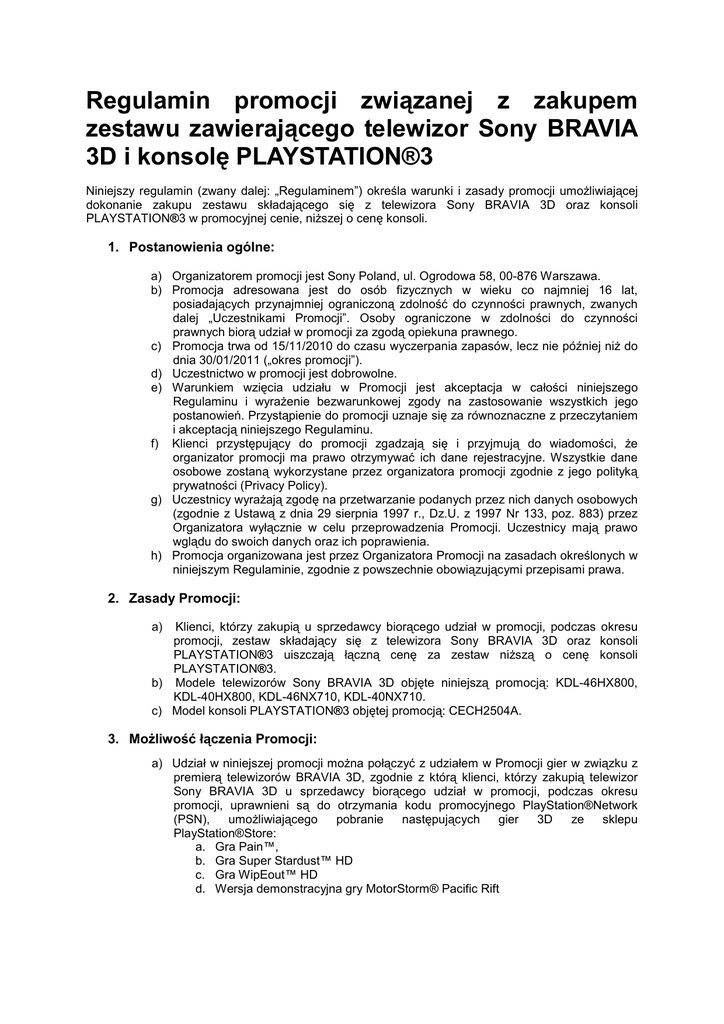 Regulamin promocji związanej z zakupem zestawu zawierającego telewizor Sony BRAVIA 3D i konsolę PLAYSTATION®3 Niniejszy regulamin (zwany dalej: „Regulaminem”) określa warunki i zasady promocji umoŜliwiającej dokonanie zakupu zestawu składającego się z telewizora Sony BRAVIA 3D oraz konsoli PLAYSTATION®3 w promocyjnej cenie, niŜszej o cenę konsoli. 1. Postanowienia ogólne: a) Organizatorem promocji jest Sony Poland, ul. Ogrodowa 58, 00-876 Warszawa. b) Promocja adresowana jest do osób fizycznych w wieku co najmniej 16 lat, posiadających przynajmniej ograniczoną zdolność do czynności prawnych, zwanych dalej „Uczestnikami Promocji”. Osoby ograniczone w zdolności do czynności prawnych biorą udział w promocji za zgodą opiekuna prawnego. c) Promocja trwa od 15/11/2010 do czasu wyczerpania zapasów, lecz nie później niŜ do dnia 30/01/2011 („okres promocji”). d) Uczestnictwo w promocji jest dobrowolne. e) Warunkiem wzięcia udziału w Promocji jest akceptacja w całości niniejszego Regulaminu i wyraŜenie bezwarunkowej zgody na zastosowanie wszystkich jego postanowień. Przystąpienie do promocji uznaje się za równoznaczne z przeczytaniem i akceptacją niniejszego Regulaminu. f) Klienci przystępujący do promocji zgadzają się i przyjmują do wiadomości, Ŝe organizator promocji ma prawo otrzymywać ich dane rejestracyjne. Wszystkie dane osobowe zostaną wykorzystane przez organizatora promocji zgodnie z jego polityką prywatności (Privacy Policy). g) Uczestnicy wyraŜają zgodę na przetwarzanie podanych przez nich danych osobowych (zgodnie z Ustawą z dnia 29 sierpnia 1997 r., Dz.U. z 1997 Nr 133, poz. 883) przez Organizatora wyłącznie w celu przeprowadzenia Promocji. Uczestnicy mają prawo wglądu do swoich danych oraz ich poprawienia. h) Promocja organizowana jest przez Organizatora Promocji na zasadach określonych w niniejszym Regulaminie, zgodnie z powszechnie obowiązującymi przepisami prawa. 2. Zasady Promocji: a) Klienci, którzy zakupią u sprzedawcy biorącego udział w promocji, podczas okresu promocji, zestaw składający się z telewizora Sony BRAVIA 3D oraz konsoli PLAYSTATION®3 uiszczają łączną cenę za zestaw niŜszą o cenę konsoli PLAYSTATION®3. b) Modele telewizorów Sony BRAVIA 3D objęte niniejszą promocją: KDL-46HX800, KDL-40HX800, KDL-46NX710, KDL-40NX710. c) Model konsoli PLAYSTATION®3 objętej promocją: CECH2504A. 3. MoŜliwość łączenia Promocji: a) Udział w niniejszej promocji moŜna połączyć z udziałem w Promocji gier w związku z premierą telewizorów BRAVIA 3D, zgodnie z którą klienci, którzy zakupią telewizor Sony BRAVIA 3D u sprzedawcy biorącego udział w promocji, podczas okresu promocji, uprawnieni są do otrzymania kodu promocyjnego PlayStation®Network (PSN), umoŜliwiającego pobranie następujących gier 3D ze sklepu PlayStation®Store: a. Gra Pain™, b. Gra Super Stardust™ HD c. Gra WipEout™ HD d. Wersja demonstracyjna gry MotorStorm® Pacific Rift b) Warunkiem wzięcia udziału w Promocji gier w związku z premierą telewizorów BRAVIA 3D jest akceptacja w całości Regulaminu Promocji zamieszczonego na stronie internetowej: https://giveaway.sony.eu/bravia3dps3/pl/pl/Competition/TermsAndConditions i wyraŜenie bezwarunkowej zgody na zastosowanie wszystkich jego postanowień. Przystąpienie do promocji i zakończenie rejestracji w celu otrzymania i realizacji kodu promocyjnego PSN uznaje się za równoznaczne z przeczytaniem i akceptacją przedmiotowego Regulaminu Promocji. Uprawnienie do pobrania gier niewykorzystane zgodnie z Regulaminem Promocji uznaje się za niewaŜne. 4. Postanowienia końcowe: a) Organizator promocji zastrzega sobie prawo do modyfikacji postanowień niniejszego Regulaminu w kaŜdym czasie, a takŜe do zawieszenia, przerwania, przedłuŜenia lub odwołania Promocji bez podania przyczyn z poszanowaniem praw uprzednio nabytych przez Uczestników. b) Wszystkie treści zawarte w materiałach reklamowo-promocyjnych mają charakter jedynie informacyjny. Moc prawną mają jedynie postanowienia niniejszego Regulaminu i obowiązujące przepisy prawa. c) Niniejszy Regulamin wchodzi w Ŝycie z dniem rozpoczęcia Promocji i obowiązuje do czasu jej zakończenia. d) W sprawach nieuregulowanym niniejszym Regulaminem zastosowanie znajdują powszechnie obowiązujące przepisy prawa. e) Treść niniejszego Regulaminu będzie udostępniana wszystkim zainteresowanym w serwisie internetowym www.sony.pl oraz w salonach Sony Centre.