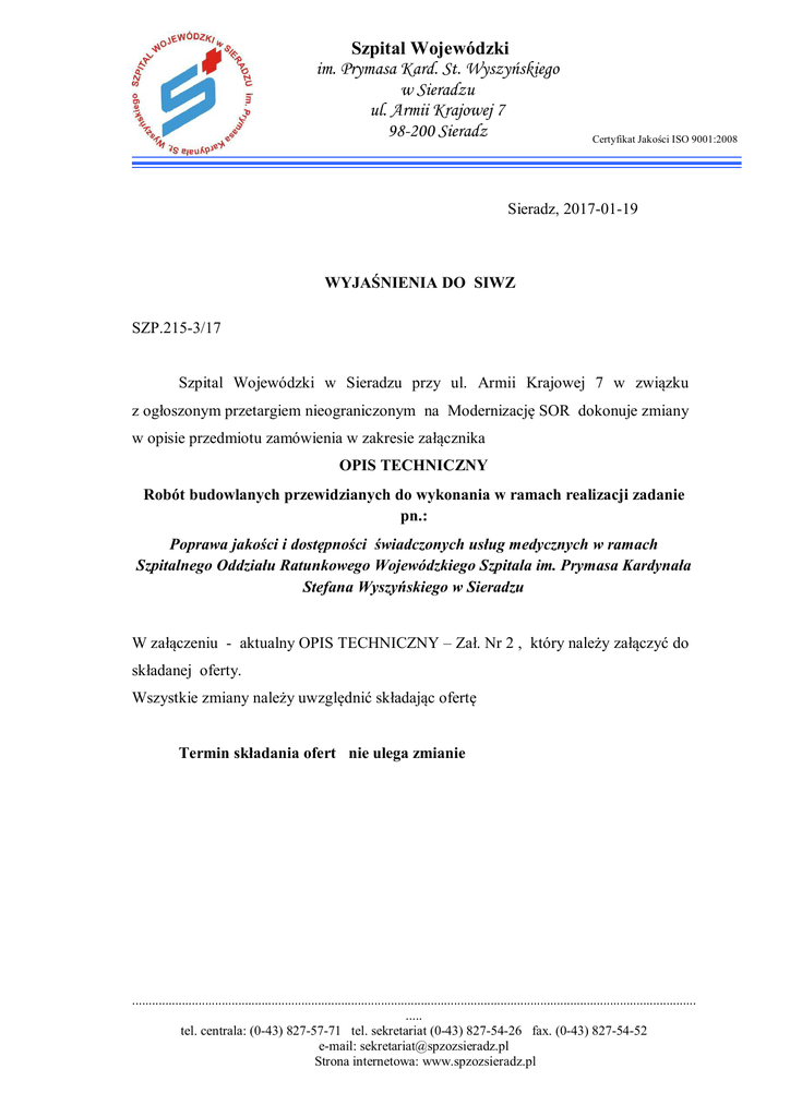 Szpital Wojewódzki im. Prymasa Kard. St. Wyszyńskiego w Sieradzu ul. Armii Krajowej 7 98-200 Sieradz Certyfikat Jakości ISO 9001:2008 Sieradz, 2017-01-19 WYJAŚNIENIA DO SIWZ SZP.215-3/17 Szpital Wojewódzki w Sieradzu przy ul. Armii Krajowej 7 w związku z ogłoszonym przetargiem nieograniczonym na Modernizację SOR dokonuje zmiany w opisie przedmiotu zamówienia w zakresie załącznika OPIS TECHNICZNY Robót budowlanych przewidzianych do wykonania w ramach realizacji zadanie pn.: Poprawa jakości i dostępności świadczonych usług medycznych w ramach Szpitalnego Oddziału Ratunkowego Wojewódzkiego Szpitala im. Prymasa Kardynała Stefana Wyszyńskiego w Sieradzu W załączeniu - aktualny OPIS TECHNICZNY – Zał. Nr 2 , który należy załączyć do składanej oferty. Wszystkie zmiany należy uwzględnić składając ofertę Termin składania ofert nie ulega zmianie .......................................................................................................................................................................... ..... tel. centrala: (0-43) 827-57-71 tel. sekretariat (0-43) 827-54-26 fax. (0-43) 827-54-52 e-mail: [email protected] Strona internetowa: www.spzozsieradz.pl Załącznik Nr 2 OPIS TECHNICZNY Robót budowlanych przewidzianych do wykonania w ramach realizacji zadanie pn.: Poprawa jakości i dostępności świadczonych usług medycznych w ramach Szpitalnego Oddziału Ratunkowego Wojewódzkiego Szpitala im. Prymasa Kardynała Stefana Wyszyńskiego w Sieradzu Miejsce realizacji: Sieradz ul. Armii Krajowej 7 I. Branża budowlana: 1. Wymiana posadzek z PCV i płytek ceramicznych. 1.1. Wykładzinę tarkett należy wymienić na kauczukową typu „nora” w niżej podanych pomieszczeniach: 2/1, 2/1b, 2/2a, 2/2b, 2/13, 2/15, 2/16 i pokój lekarza dyżurnego. Należy zerwać i usunąć całą posadzkę z rulonu pcv, uzupełnić ewentualne ubytki w podłożu oraz przykleić nową wykładzinę z zaokrąglonym wywinięciem na ścianę około 10 cm. Użyć wykładziny firmy NORA w trzech kolorach lub innej o podobnych parametrach. Wykładzinę układać wzdłuż pomieszczeń. 1.2. Pozostałą część Wykonawca zobowiązany jest zabezpieczyć przed zniszczeniem, a w przypadku uszkodzenia wymieni ją na własny koszt. 1.3. Przed oddaniem do użytku Wykonawca jest zobowiązany dokładnie oczyścić wykładzinę i zakonserwować. 2. Wymiana drzwi – ze względu na uszkodzenie, zużycie lub nie spełnienie wymogów użytkownika zdecydowano na wymianę następujących drzwi wg oznaczenia na planie: 2.1. Drzwi o symbolu D1 należy wymienić na drzwi rozwierane dwuskrzydłowe o konstrukcji aluminiowej z profilem ocieplanym, w górnej części przeszklone; skrzydła otwierane automatycznie trwałym profesjonalnym napędem elektrycznym sterowanym czujnikami ruchu. Drzwi powinny posiadać system umożliwiający bezpieczną ewakuację akceptowany przez Państwową Straż Pożarną. Skrzydła 85 + 85 (170/200)cm. Pozostałą część otworu zabudować w konstrukcji stalowej z blachą trapezową jak istniejąca. 2.2. Drzwi o symbolu D2 należy wymienić na drzwi rozwierane dwuskrzydłowe o konstrukcji aluminiowej z profilem ocieplanym, w górnej części przeszklone; skrzydła otwierane automatycznie trwałym profesjonalnym napędem elektrycznym sterowanym czujnikami ruchu. Drzwi powinny posiadać system umożliwiający bezpieczną ewakuację akceptowany przez Państwową Straż Pożarną. Skrzydła 85 + 85 .......................................................................................................................................................................... ..... tel. centrala: (0-43) 827-57-71 tel. sekretariat (0-43) 827-54-26 fax. (0-43) 827-54-52 e-mail: [email protected] Strona internetowa: www.spzozsieradz.pl (170/200)cm. Od strony wewnętrznej należy zamontować kurtynę powietrzną z nagrzewnicą elektryczną, nawiew powietrza i jego temperatura sterowana automatycznie. 2.3. Drzwi o symbolu D3 należy wymienić na drzwi rozwierane, ze stali kwasoodpornej, w górnej części z bulajem. Skrzydło większe otwierane i zamykane siłownikiem elektrycznym sterowanym ręcznie za pomocą przycisków umieszczonych po obu stronach drzwi, zabezpieczenie przed przypadkowym uderzeniem osób będących w polu otwierania drzwi; klamka/pochwyt, 1 zamek. Skrzydła 120 + 30 (150/200) cm. 2.4. Drzwi o symbolu D4 należy wymienić na drzwi przesuwne, ze stali kwasoodpornej, w górnej części z bulajem, otwieranie elektryczne sterowane ręcznie za pomocą przycisków umieszczonych po obu stronach drzwi. Skrzydło 110/200 cm. 2.5. Drzwi o symbolu D5 – jw. 2.6. Drzwi o symbolu D6 – jw. 2.7. Drzwi o symbolu D7 – jw. 2.8. Drzwi o symbolu D8 wymienić na drzwi jednoskrzydłowe rozwierane, aluminiowe przeszklone, otwierane ręcznie. 2.9. Drzwi o symbolu D9 rozwierane, stalowe o odporności ogniowej EIS60, dwuskrzydłowe 180x200 (90 + 90) cm. Drzwi wyposażyć w elektrotrzymacze typu 13050 firmy „D + H” i samozamykacze typu GEZE TS 4000, klamka/klamka, zamek z wkładką systemowa. 2.10. Drzwi o symbolu D10 rozwierane, aluminiowe, przeszklone, dymoszczelne, dwuskrzydłowe 120 + 40 (160/200) cm. 2.11. Drzwi o symbolu D11 poza realizacją. 2.12. Drzwi o symbolu D12 rozwierane, metalowe. Skrzydło 90/200 z bulajem. Ościeżnica stalowa, regulowana, malowana farbą poliestrową. 2.13. Drzwi o symbolu D13 rozwierane, metalowe. Skrzydło 90/200 z bulajem Ościeżnica regulowana, stalowa, malowana farbą poliestrową. 2.14. Pozostałą część obudować ścianką murowaną o klasie odporności ogniowej EI60. Uwagi: kierunki otwierania pokazano na rysunku, samozamykacze i elektrotrzymacze firm podanych powyżej lub inne o parametrach niegorszych, elektrotrzymacze należy przymocować do indywidualnie wykonanej konstrukcji wsporczej uzgodnionej z Inwestorem, .......................................................................................................................