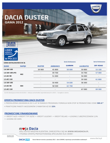 GAMA 2012 Seria limitowana Seria limitowana CENA KATALOGOWA W ZŁ DUSTER AMBIANCE GARMIN LAUREATE2 OFF-ROAD 39 900 45 800 50 000 50 800 53 100 - 49 700 - 54 700 57 000 1.5 dCi 90 - 51 000 - 56 000 - 1.5 dCi 110 - - - 59 500 61 800 1.6 16V 105 - 50 400 54 600 58 300 - - 58 500 62 700 - - - - - 67 000 69 300 SILNIK NAPĘD 1.6 16V 105 1.6 16V 105 LPG 1.5 dCi 90 4X2 4X4 1.5 dCi 110 Cennik obowiązuje od dnia 01.03.2013 r. i dotyczy samochodów wyprodukowanych w 2013 r. Szczegóły w salonie. OFERTA PROMOCYJNA DACII DUSTER • PRZEDŁUŻONA GWARANCJA DO 5 LAT W RAMACH PROGRAMU FORMUŁA NON STOP W PROMOCYJNEJ CENIE 500 zł!* • PRAKTYCZNE PAKIETY AKCESORIÓW Z RABATEM AŻ DO 22% PROMOCYJNE FINANSOWANIE • KREDYT 4x25 • KREDYT TYP 50/50 • KREDYT ULGOWY • KREDYT RELAKS • LEASING Z UBEZPIECZENIEM 2,9% • LEASING OD 104% JEŚLI JESTEŚ NASZYM KLIENTEM, ZAREJESTRUJ SIĘ NA WWW.MOJADACIA.PL I POZNAJ OFERTĘ PRZYGOTOWANĄ SPECJALNIE DLA CIEBIE! Dacia liderem wzrostu sprzedaży 2012 - dane SAMAR, rejestracje samochodów osobowych DACIA DUSTER GARMIN ELEMENTY WYPOSAŻENIA SERYJNEGO SL GARMIN = AMBIANCE + • Lakier metalizowany (dostępne 2 kolory nadwozia do wyboru: Szary Platynowy lub Czarna Perła) • Przednia i tylna osłona podwozia lakierowane w kolorze matowego chromu • Chromowana końcówka rury wydechowej • Klimatyzacja manualna • GPS GARMIN nüvi® 2595 LMT z uchwytem (wyposażenie z gamy akcesoriów, posiada 2 lata gwarancji producenta firmy Garmin) • Dywaniki podłogowe z logo Garmin • Logo Garmin z tyłu samochodu – lewe nadkole 4x2 4x4 1.6 16V 105 50 000 zł 1.6 16V 105 54 600 zł 1.5 dCi 90 62 700 zł DACIA DUSTER OFF-ROAD ELEMENTY WYPOSAŻENIA SERYJNEGO SL OFF-ROAD = LAURÉATE2 + • Radioodtwarzacz CD MP3, Bluetooth®, złącza USB i jack w panelu radia i pilot do sterowania przy kierownicy • Komplet nadkoli i listwy ochronne na drzwi w kolorze czarnym 4x2 4x4 1.6 16V 105 1.6 16V 105 LPG 53 100 zł 57 000 zł 1.5 dCi 110 61 800 zł 1.5 dCi 110 69 300 zł WYPOSAŻENIE Duster Ambiance SL Garmin Lauréate2 SL Off-road Zderza ki cza rne cza rne cza rne w kol orze na dwozi a / cza rne w kol orze na dwozi a / cza rne Zewnętrzne kl a mki drzwi cza rne cza rne cza rne ● ● ● w kol orze na dwozi a ● w kol orze na dwozi a ● -/- -/- -/- P(2) / P(3) P(2) / P(3) ● ● - ● ● 1 010 ● ● 1 800 ● ● ● ● ● ● ● ● (2) (3) P iP (2) P i P(3) (2) (3) P iP (2) (3) P iP ● 1010/P(2) (3) P ● ● P(2) i P(3) 1 800 ● (2) (3) P iP (2) P i P(3) (2) (3) P iP ● (2) (3) P iP ● 1010/P(2) (3) P ● ● P(2) i P(3) 1 800 ci emny gra fi t ci emny gra fi t ci emny gra fi t ci emny gra fi t ● ● ● - s za ry etoi l e s za ry etoi l e s za ry etoi l e s za ry etoi l e ● ● P(1) P(1) ● - s za ry etoi l e s za ry etoi l e s za ry etoi l e s za ry etoi l e ● ● P(1) P(1) ● - ci emnos za ry ci emnos za ry ci emnos za ry ci emnos za ry ci emnos za ry ● (4) P ● ● ● ● ci emnos za ry ci emnos za ry ci emnos za ry ci emnos za ry ci emnos za ry ● (4) P ● ● ● ● ● ● ● 1 210 ● ● 1 210 ● ● 1210 ● ● 1210 ● ● ● ● ● ● P ● P(5) ● ● ● (1) P ● ● ● ● (1) P ● ● ● ● ● ● ● ● ● ● ● ● ● ● ● ● ● ● ● ● WYGLĄD ZEWNĘTRZNY Lus terka boczne cza rne Lus terka boczne w kol orze ma towego chromu / ci emnos za rego meta l u Rel i ngi da chowe cza rne Rel i ngi da chowe w kol orze ma towego chromu Os łony podwozi a w kol orze ma towego chromu przód / tył Li s twy progowe w kol orze ma towego chromu Kompl et na dkol i i l i s twy ochronne na drzwi w kol orze cza rnym Szyby tyl ne przyci emni a ne Sta l owe obręcze kół 16’’ Styl i zowa ne s ta l owe obręcze kół 16’’ Fel gi a l umi ni owe 16’’ Fel gi a l umi ni owe 16’’ w kol orze ci emnos za rego meta l u Koło za pa s owe Zes ta w do na pra wy opon (wers je z fa bryczną i ns ta l a cją LPG) Chromowa na końcówka rury wydechowej Logo Ga rmi n z tyłu s a mochodu - l ewe na dkol e La ki er meta l i zowa ny FOTELE I WYSTRÓJ WNĘTRZA Kons ol a centra l na Obra mowa ni e na wi ewów Ozdobne el ementy w ki erowni cy Uchwyty drzwi przedni ch Li s twy ozdobne w pa nel a ch drzwi Ta pi cerka Tra ck Ta pi cerka Del s ey Ta pi cerka s kórza na łączona ze s kórą ekol ogi czną Jednoczęś ci owa ka na pa tyl na s kła da na Ka na pa tyl na ze s kła da nym opa rci em w ukła dzi e 1/3 – 2/3 Fotel ki erowcy z regul a cją wys okoś ci Ki es zeni e w drzwi a ch przedni ch Ki es zeni e w opa rci u przedni ch fotel i BEZPIECZEŃSTWO CZYNNE I BIERNE ABS + ukła d ws poma ga ni a na głego ha mowa ni a AFU Sys tem kontrol i toru ja zdy ESP® z ASR Czołowa podus zka powi etrzna ki erowcy Czołowa podus zka powi etrzna pa s a żera z możl i woś ci ą deza ktywa cji Boczne podus zki powi etrzne z przodu Przedni e pa s y bezpi eczeńs twa z regul a cją wys okoś ci Przedni e pa s y bezpi eczeńs twa z na pi na cza mi pi rotechni cznymi Za główki przedni e z regul a cją wys okoś ci Za główki przedni e s ta łe nowej genera cji 3 tyl ne pa s y bezpi eczeńs twa 3-punktowe (z na wi ja czem) 3 za główki tyl ne (za główek centra l ny ws uwa ny w opa rci e) Sys tem mocowa ni a fotel i ka dl a dzi ecka Is ofi x na bocznych mi ejs ca ch z tyłu (5) Duster Ambiance SL Garmin Lauréate2 SL Off-road ● ● ● ● ● ● ● ● ● ● ● ● ● ● ● ● ● ● ● ● ● ● ● ● P(5) ● ● ● ● ● ● - 310 ● ● - 310 ● ● - ● ● ● ● ● ● (5) ● ● ● ● (5) P ● ● ● - ● ● ● ● (1) P ● ● ● ● (1) P ● 310 ● ● ● ● 310 ● ● 310 ● ● ● ● 310 ● ● ● ● - - - 2 550 ● ● ● - 1 600 1 600 1 600 ● - - - - 4 050 1 010 ● ● 2 450 2 650 2 550 ● ● 2 450 2 650 2 550 ● ZABEZPIECZENIE SAMOCHODU Kodowa ny s ys tem bl oka dy za płonu PROWADZENIE I SYSTEMY KONTROLNE Obrotomi erz Ws poma ga ni e ukła du ki erowni czego Kompute