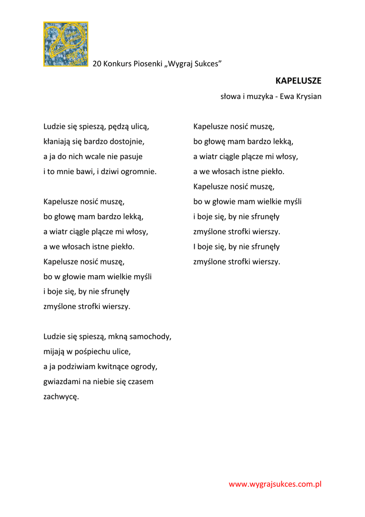 20 Konkurs Piosenki „Wygraj Sukces” KAPELUSZE słowa i muzyka - Ewa Krysian Ludzie się spieszą, pędzą ulicą, Kapelusze nosić muszę, kłaniają się bardzo dostojnie, bo głowę mam bardzo lekką, a ja do nich wcale nie pasuje a wiatr ciągle plącze mi włosy, i to mnie bawi, i dziwi ogromnie. a we włosach istne piekło. Kapelusze nosić muszę, Kapelusze nosić muszę, bo w głowie mam wielkie myśli bo głowę mam bardzo lekką, i boje się, by nie sfrunęły a wiatr ciągle plącze mi włosy, zmyślone strofki wierszy. a we włosach istne piekło. I boje się, by nie sfrunęły Kapelusze nosić muszę, zmyślone strofki wierszy. bo w głowie mam wielkie myśli i boje się, by nie sfrunęły zmyślone strofki wierszy. Ludzie się spieszą, mkną samochody, mijają w pośpiechu ulice, a ja podziwiam kwitnące ogrody, gwiazdami na niebie się czasem zachwycę. www.wygrajsukces.com.pl