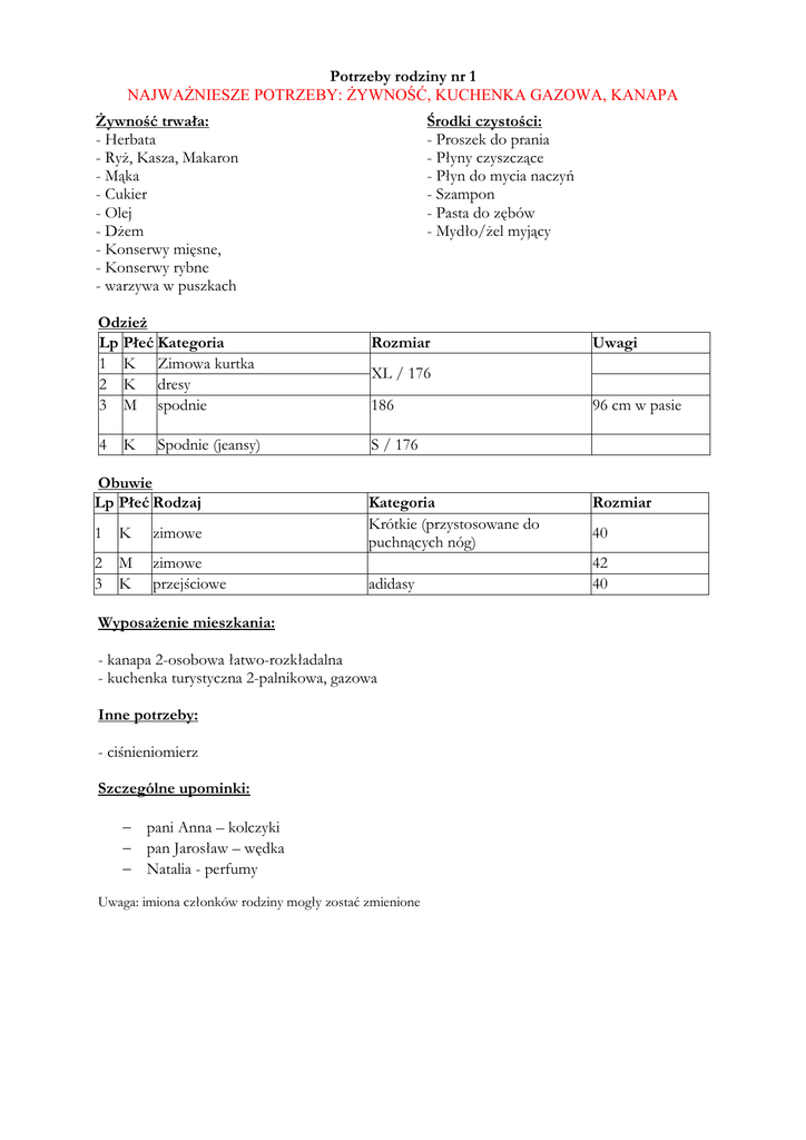 Potrzeby rodziny nr 1 NAJWAŻNIESZE POTRZEBY: ŻYWNOŚĆ, KUCHENKA GAZOWA, KANAPA Żywność trwała: - Herbata - Ryż, Kasza, Makaron - Mąka - Cukier - Olej - Dżem - Konserwy mięsne, - Konserwy rybne - warzywa w puszkach Środki czystości: - Proszek do prania - Płyny czyszczące - Płyn do mycia naczyń - Szampon - Pasta do zębów - Mydło/żel myjący Odzież Lp Płeć Kategoria 1 K Zimowa kurtka 2 K dresy 3 M spodnie 186 4 S / 176 K Spodnie (jeansy) Obuwie Lp Płeć Rodzaj 1 K zimowe 2 3 M K zimowe przejściowe Rozmiar Uwagi XL / 176 Kategoria Krótkie (przystosowane do puchnących nóg) adidasy Wyposażenie mieszkania: - kanapa 2-osobowa łatwo-rozkładalna - kuchenka turystyczna 2-palnikowa, gazowa Inne potrzeby: - ciśnieniomierz Szczególne upominki: − pani Anna – kolczyki − pan Jarosław – wędka − Natalia - perfumy Uwaga: imiona członków rodziny mogły zostać zmienione 96 cm w pasie Rozmiar 40 42 40 Potrzeby rodziny nr 2 NAJWAŻNIEJSZE POTRZEBY: ŚRODKI CZYSTOŚCI, POŚCIEL. ODZIEŻ Środki czystości: - Proszek do prania - Płyny czyszczące - Płyn do mycia naczyń - Szampon - Pasta do zębów - Szczoteczka do zębów - Mydło/żel myjący Żywność trwała: - Herbata, Kawa - Ryż, Kasza, Makaron - Mąka - Cukier - Olej - Dżem - Konserwy mięsne, - Konserwy rybne - mleko w kartonach - płatki dla dzieci - „nutella” Lp Płeć Kategoria 1 K Spodnie 2 K bluzki 3 M Spodnie 4 M bluzy 5 K Spodnie 6 K spódnice 7 8 9 10 11 K M M K K bluzki z długim rękawem Spodnie bluzki Spodnie bluzki Obuwie Lp Płeć Rodzaj 1 K wiosenne 2 M sportowe 3 K wiosenne 4 M zimowe 5 K wiosenne Wyposażenie mieszkania: - kołdra, poduszka, koc - pościel, ręczniki - firanki - mikser Szczególne upominki: - Monika – kosmetyk (np. balsam) - Daniel – perfumy - Bartosz – gry planszowe Odzież Rozmiar Uwagi 36 / XS Nie sportowe 180 cm wzrostu, 100 cm w pasie 146 cm wzrostu 134 cm wzrostu czarne 110 cm wzrostu Kategoria półbuty adidasy kozaki Rozmiar 36 43/44 35/36 33/34 24/25 Pomoce szkolne: - zeszyty, bloki, kredki, farbki, plastelina, papier kolorowy, nożyczki, klej, piórnik, przybory do pisania, plecak ze Spidermanem dla Bartosza, różowy plecak dla Oliwii. - Oliwia – zestaw do malowania (plastyczny) - Julia – lalka Barbie Uwaga: imiona członków rodziny mogły zostać zmienione