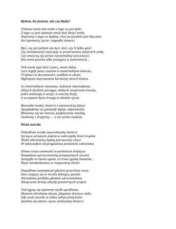 Byłem, bo Jestem, ale czy Będę? Ciekawi mnie tak wiele z tego co już było; Z tego co jest zajmuje mnie dziś dosyć mało, Najmniej z tego co będzie, choć przyszłość jest kluczem Do tajemnicy życia i zagadki śmierci. Być, czy już jednak nie być; śnić, czy li tylko gnić. Czy świadomość zwycięży w przetrwaniu zmierzch ciała, Czy otworzą się wrota nieziemskiej wieczności, Kto mnie powita albo pożegna w zaświatach,… Tak wielu żyje dziś i jutro, może dalej, Lecz nigdy poza czasem w materialnym świecie; Przykuci w doczesności, usidleni w ziemi, Mglistymi marzeniami karmimy strach końca. Co śmiertelnym nieznane, ludziom niewiadome, Silnych duchem pociąga, słabych wnętrzem trwoży, Jedni wzlatują w wizje, w otuchę iluzji, A uczepieni bytu trwają w złudzie życia. Bezradni wobec śmierci z naiwnością dzieci Spoglądamy na gwiazdy dążąc odpowiedzi; Miotamy się we wierze, podpieramy wiedzą, Szukamy i drążymy, … a nic prócz nadziei. Wola mordu Pokuśliwa uroda zwyrodniałej śmierci Sycząca wrzącym jadem w zakrzepłej krwi trupów Wabi nikczemną żądzą pierwociny chuci W zdziczałym od pragnienia jestestwie człowieka. Zimna cisza ciemności w poświacie księżyca Rozpalana sprzecznością przepastnych nicości Zastygła w cieniu ognia, co trwa zgubą światów, Wyje nieokiełznana w rozpasanej złości. Popędliwa namiętność głosem grzechów nocy, Zew czający się w mroku łaknący posoki, Wyuzdana perfidia głodem okrucieństwa, Nasączone krwią zmysły potwornych urojeń. Tak lęgną się tajemnie myśli upodlenia, Słowem zbrukana dusza, plugawy dreszcz ciała, Gdy wola mordu w uldze udręczonej jaźni Spełnia się aktem czynu wiekuistej śmierci.