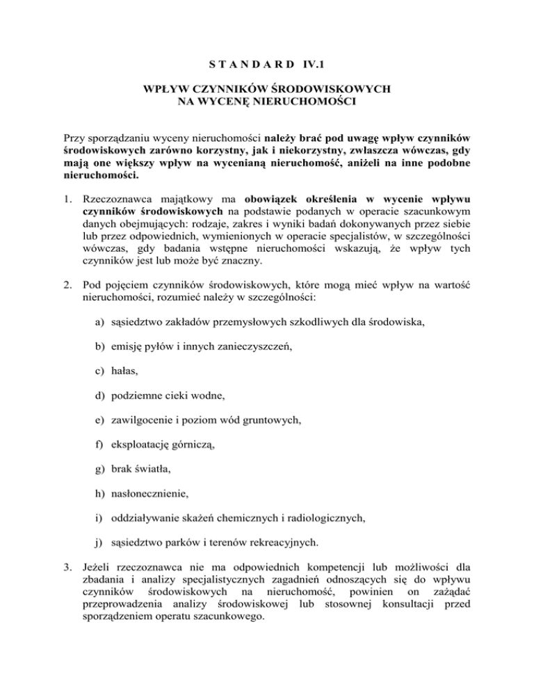S T A N D A R D IV.1 WPŁYW CZYNNIKÓW ŚRODOWISKOWYCH NA WYCENĘ NIERUCHOMOŚCI Przy sporządzaniu wyceny nieruchomości naleŜy brać pod uwagę wpływ czynników środowiskowych zarówno korzystny, jak i niekorzystny, zwłaszcza wówczas, gdy mają one większy wpływ na wycenianą nieruchomość, aniŜeli na inne podobne nieruchomości. 1. Rzeczoznawca majątkowy ma obowiązek określenia w wycenie wpływu czynników środowiskowych na podstawie podanych w operacie szacunkowym danych obejmujących: rodzaje, zakres i wyniki badań dokonywanych przez siebie lub przez odpowiednich, wymienionych w operacie specjalistów, w szczególności wówczas, gdy badania wstępne nieruchomości wskazują, Ŝe wpływ tych czynników jest lub moŜe być znaczny. 2. Pod pojęciem czynników środowiskowych, które mogą mieć wpływ na wartość nieruchomości, rozumieć naleŜy w szczególności: a) sąsiedztwo zakładów przemysłowych szkodliwych dla środowiska, b) emisję pyłów i innych zanieczyszczeń, c) hałas, d) podziemne cieki wodne, e) zawilgocenie i poziom wód gruntowych, f) eksploatację górniczą, g) brak światła, h) nasłonecznienie, i) oddziaływanie skaŜeń chemicznych i radiologicznych, j) sąsiedztwo parków i terenów rekreacyjnych. 3. JeŜeli rzeczoznawca nie ma odpowiednich kompetencji lub moŜliwości dla zbadania i analizy specjalistycznych zagadnień odnoszących się do wpływu czynników środowiskowych na nieruchomość, powinien on zaŜądać przeprowadzenia analizy środowiskowej lub stosownej konsultacji przed sporządzeniem operatu szacunkowego. 4. Zmniejszenie wartości wskutek oddziaływania czynników środowiskowych określa się przy uŜyciu tych samych metod i technik, jak przy mierzeniu utraty wartości na podstawie określania stopnia zuŜycia spowodowanego innymi czynnikami. W szczególności koszt oczyszczenia nieruchomości z odpadów toksycznych lub naprawienia szkód wynikających z eksploatacji górniczej moŜe być porównywany do kosztów doprowadzenia do stanu poprzedniego nieruchomości zuŜytych wskutek upływu czasu. Powinno się jednakŜe wziąć pod uwagę, Ŝe wartość rynkowa nieruchomości, po potrąceniu kosztów jej oczyszczenia, moŜe być większa lub mniejsza, niŜ wynikałoby to z dokonanych obliczeń. 5. Koszty przywrócenia nieruchomości do stanu sprzed skaŜenia obejmują przewidywane nakłady na: a) usunięcie skaŜenia gruntu, b) instalację skuteczniejszych środków kontroli skaŜenia, c) przeprojektowanie obiektów produkcyjnych, d) zapłatę kar i odszkodowań za nie zastosowanie się do przepisów z zakresu ochrony środowiska, e) ubezpieczenie od szkód w przyszłości. 6. Rzeczoznawca majątkowy winien określić, czy: a) źródło skaŜenia lub zagroŜenia skaŜeniem moŜe być skutecznie usunięte, biorąc takŜe pod uwagę warunki ekonomiczne i prawne, b) skaŜenie lub zagroŜenie skaŜeniem moŜe być ograniczone przynajmniej o tyle, aby nieruchomość była moŜliwa do określonego uŜytkowania, chociaŜby na czas ograniczony, c) moŜliwe jest zmniejszenie skaŜenia w jakikolwiek sposób, d) uzasadnione jest poniesienie kosztów zabezpieczenia przed przyszłymi szkodami. W celu ustalenia tych okoliczności rzeczoznawca moŜe zwrócić się o konsultację do właściwego specjalisty lub jednostki zajmującej się ochroną środowiska. Osoby te powinny być wymienione w operacie szacunkowym, a ich opinia dołączona do wyceny. 7. JeŜeli istnieje moŜliwość usunięcia źródła skaŜenia lub jego skutków, naleŜy w wycenie ująć koszty tego usunięcia, oraz inne czynniki wpływające na wartość nieruchomości, a w szczególności: a) niemoŜliwość doprowadzenia do całkowitej sanacji nieruchomości, b) złą opinię o nieruchomości na rynku, c) ryzyko ponownego skaŜenia, d) odszkodowanie za zakłócenie w korzystaniu z nieruchomości, e) ryzyko zmiany przepisów ochronnych.