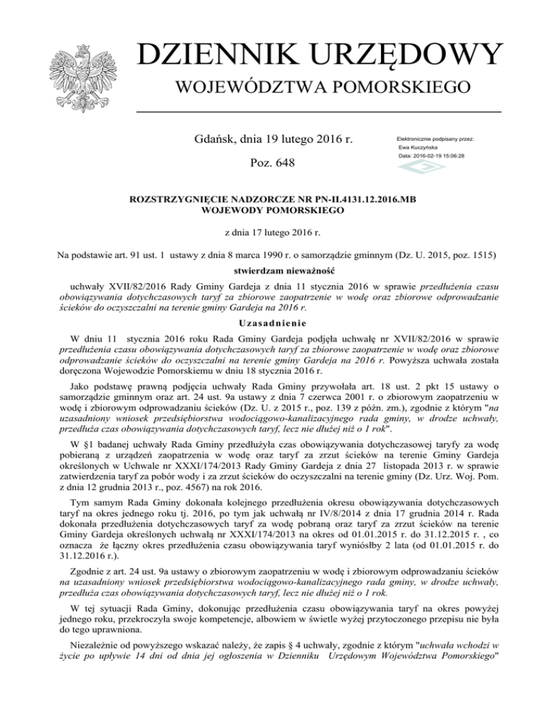 DZIENNIK URZĘDOWY WOJEWÓDZTWA POMORSKIEGO Gdańsk, dnia 19 lutego 2016 r. Elektronicznie podpisany przez: Ewa Kuczyńska Poz. 648 Data: 2016-02-19 15:06:28 ROZSTRZYGNIĘCIE NADZORCZE NR PN-II.4131.12.2016.MB WOJEWODY POMORSKIEGO z dnia 17 lutego 2016 r. Na podstawie art. 91 ust. 1 ustawy z dnia 8 marca 1990 r. o samorządzie gminnym (Dz. U. 2015, poz. 1515) stwierdzam nieważność uchwały XVII/82/2016 Rady Gminy Gardeja z dnia 11 stycznia 2016 w sprawie przedłużenia czasu obowiązywania dotychczasowych taryf za zbiorowe zaopatrzenie w wodę oraz zbiorowe odprowadzanie ścieków do oczyszczalni na terenie gminy Gardeja na 2016 r. Uzasadnienie W dniu 11 stycznia 2016 roku Rada Gminy Gardeja podjęła uchwałę nr XVII/82/2016 w sprawie przedłużenia czasu obowiązywania dotychczasowych taryf za zbiorowe zaopatrzenie w wodę oraz zbiorowe odprowadzanie ścieków do oczyszczalni na terenie gminy Gardeja na 2016 r. Powyższa uchwała została doręczona Wojewodzie Pomorskiemu w dniu 18 stycznia 2016 r. Jako podstawę prawną podjęcia uchwały Rada Gminy przywołała art. 18 ust. 2 pkt 15 ustawy o samorządzie gminnym oraz art. 24 ust. 9a ustawy z dnia 7 czerwca 2001 r. o zbiorowym zaopatrzeniu w wodę i zbiorowym odprowadzaniu ścieków (Dz. U. z 2015 r., poz. 139 z późn. zm.), zgodnie z którym "na uzasadniony wniosek przedsiębiorstwa wodociągowo-kanalizacyjnego rada gminy, w drodze uchwały, przedłuża czas obowiązywania dotychczasowych taryf, lecz nie dłużej niż o 1 rok". W §1 badanej uchwały Rada Gminy przedłużyła czas obowiązywania dotychczasowej taryfy za wodę pobieraną z urządzeń zaopatrzenia w wodę oraz taryf za zrzut ścieków na terenie Gminy Gardeja określonych w Uchwale nr XXXI/174/2013 Rady Gminy Gardeja z dnia 27 listopada 2013 r. w sprawie zatwierdzenia taryf za pobór wody i za zrzut ścieków do oczyszczalni na terenie gminy (Dz. Urz. Woj. Pom. z dnia 12 grudnia 2013 r., poz. 4567) na rok 2016. Tym samym Rada Gminy dokonała kolejnego przedłużenia okresu obowiązywania dotychczasowych taryf na okres jednego roku tj. 2016, po tym jak uchwałą nr IV/8/2014 z dnia 17 grudnia 2014 r. Rada dokonała przedłużenia dotychczasowych taryf za wodę pobraną oraz taryf za zrzut ścieków na terenie Gminy Gardeja określonych uchwałą nr XXXI/174/2013 na okres od 01.01.2015 r. do 31.12.2015 r. , co oznacza że łączny okres przedłużenia czasu obowiązywania taryf wyniósłby 2 lata (od 01.01.2015 r. do 31.12.2016 r.). Zgodnie z art. 24 ust. 9a ustawy o zbiorowym zaopatrzeniu w wodę i zbiorowym odprowadzaniu ścieków na uzasadniony wniosek przedsiębiorstwa wodociągowo-kanalizacyjnego rada gminy, w drodze uchwały, przedłuża czas obowiązywania dotychczasowych taryf, lecz nie dłużej niż o 1 rok. W tej sytuacji Rada Gminy, dokonując przedłużenia czasu obowiązywania taryf na okres powyżej jednego roku, przekroczyła swoje kompetencje, albowiem w świetle wyżej przytoczonego przepisu nie była do tego uprawniona. Niezależnie od powyższego wskazać należy, że zapis § 4 uchwały, zgodnie z którym "uchwała wchodzi w życie po upływie 14 dni od dnia jej ogłoszenia w Dzienniku Urzędowym Województwa Pomorskiego" –2– Poz. 648 Dziennik Urzędowy Województwa Pomorskiego _______________________________________________________________________________________________________________ istotnie narusza art. 4 ust. 1 w zw. art. 13 ustawy z dnia 20 lipca 2000 r. o ogłaszaniu aktów normatywnych i niektórych innych aktów prawnych (Dz. U. z 2015 r., poz. 1484 z późn. zm.). Zgodnie z treścią art. 13 w/w ustawy "w wojewódzkim dzienniku urzędowym ogłasza się: 1. akty prawa miejscowego stanowione przez wojewodę i organy administracji niezespolonej 2. akty prawa miejscowego stanowione przez sejmik województwa, organ powiatu oraz organ gminy, w tym statuty województwa, powiatu i gminy; 3. statuty związków międzygminnych , statuty związków powiatów oraz statuty związków powiatowogminnych; 3a. statuty związków metropolitalnych; 4. akty Prezesa Rady Ministrów uchylające akty prawa miejscowego stanowionego przez wojewodę i organy administracji niezespolonej; 5. wyroki sądu administracyjnego uwzględniające skargi na akty prawa miejscowego stanowionego przez: wojewodę i organy administracji niezespolonej, organ samorządu województwa, organ powiatu i organ gminy; 6. porozumienia w sprawie wykonywania zadań publicznych zawarte: a. między jednostkami samorządu terytorialnego, b. między jednostkami samorządu terytorialnego i organami administracji rządowej; 7. uchwały budżetowe gminy, powiatu i województwa oraz sprawozdanie z wykonania budżetu gminy, powiatu i województwa; 8. obwieszczenia o wygaśnięciu mandatu wójta (burmistrza, prezydenta miasta) oraz o rozwiązaniu sejmiku województwa, rady powiatu lub rady gminy; 8a) rozstrzygnięcia nadzorcze dotyczące aktów prawa miejscowego stanowionych przez jednostki samorządu terytorialnego; 9. statut urzędu wojewódzkiego; 10. inne akty prawne, informacje, komunikaty, obwieszczenia i ogłoszenia, jeżeli tak stanowią przepisy szczególne.". Zacytowany przepis zawiera w punktach 1-9 zamknięty katalog aktów prawnych podlegających publikacji w wojewódzkim dzienniku urzędowym. Przedmiotowa uchwała nie należy do żadnej z kategorii aktów prawnych wymienionych w tym katalogu. Obowiązek jej publikacji nie wynika również z przepisów szczególnych, do których odsyła art. 13 pkt 10 ustawy o ogłaszaniu aktów normatywnych i niektórych innych aktów prawnych. Szczególną uwagę zwrócić należy na fakt, że przedmiotowa uchwała nie mieści się w pojęciu aktu prawa miejscowego, o którym mowa w art. 13 pkt 2 ustawy o ogłaszaniu aktów normatywnych i niektórych innych aktów prawnych. Nie ulega bowiem wątpliwości, że organ wydający uchwałę objętą rozstrzygnięciem nadzorczym błędnie zakwalifikował ją do tej właśnie kategorii aktów prawnych.