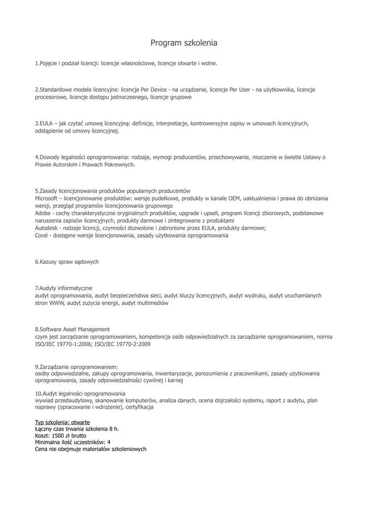 Program szkolenia 1.Pojęcie i podział licencji: licencje własnościowe, licencje otwarte i wolne. 2.Standardowe modele licencyjne: licencje Per Device - na urządzenie, licencje Per User - na użytkownika, licencje procesorowe, licencje dostępu jednoczesnego, licencje grupowe 3.EULA – jak czytać umowę licencyjną: definicje, interpretacje, kontrowersyjne zapisy w umowach licencyjnych, odstąpienie od umowy licencyjnej. 4.Dowody legalności oprogramowania: rodzaje, wymogi producentów, przechowywanie, niszczenie w świetle Ustawy o Prawie Autorskim i Prawach Pokrewnych. 5.Zasady licencjonowania produktów popularnych producentów Microsoft – licencjonowanie produktów: wersje pudełkowe, produkty w kanale OEM, uaktualnienia i prawa do obniżania wersji, przegląd programów licencjonowania grupowego Adobe - cechy charakterystyczne oryginalnych produktów, upgrade i upsell, program licencji zbiorowych, podstawowe naruszenia zapisów licencyjnych, produkty darmowe i zintegrowane z produktami Autodesk - rodzaje licencji, czynności dozwolone i zabronione przez EULA, produkty darmowe; Corel - dostępne wersje licencjonowania, zasady użytkowania oprogramowania 6.Kazusy spraw sądowych 7.Audyty informatyczne audyt oprogramowania, audyt bezpieczeństwa sieci, audyt kluczy licencyjnych, audyt wydruku, audyt uruchamianych stron WWW, audyt zużycia energii, audyt multimediów 8.Software Asset Management czym jest zarządzanie oprogramowaniem, kompetencja osób odpowiedzialnych za zarządzanie oprogramowaniem, norma ISO/IEC 19770-1:2006; ISO/IEC 19770-2:2009 9.Zarządzanie oprogramowaniem: osoby odpowiedzialne, zakupy oprogramowania, inwentaryzacje, porozumienia z pracownikami, zasady użytkowania oprogramowania, zasady odpowiedzialności cywilnej i karnej 10.Audyt legalności oprogramowania wywiad przedaudytowy, skanowanie komputerów, analiza danych, ocena dojrzałości systemu, raport z audytu, plan naprawy (opracowanie i wdrożenie), certyfikacja Typ szkolenia: otwarte Łączny czas trwania szkolenia 8 h. Koszt: 1500 zł brutto Minimalna ilość uczestników: 4 Cena nie obejmuje materiałów szkoleniowych