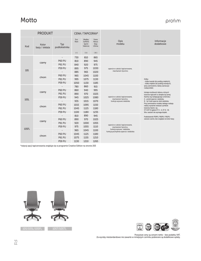 Motto PRODUKT CENA / TAPICERKA* Evo Next Kod Kolor bazy / stelaża czarny 10S chrom czarny 10SL chrom czarny 10SFL chrom Typ podłokietnika P60 PU P61 PU P59 PU P60 PU P61 PU P59 PU P60 PU P61 PU P59 PU P60 PU P61 PU P59 PU P60 PU P61 PU P59 PU P60 PU P61 PU P59 PU Medley Softline Sprint Valencia Fame Nexus Step Ultima (I) ( II ) ( III ) 730 810 840 895 885 965 995 1050 780 860 890 945 935 1015 1045 1100 810 890 920 975 965 1045 1075 1130 810 890 920 975 965 1045 1075 1130 860 940 970 1025 1015 1095 1125 1180 890 970 1000 1055 1045 1125 1155 1210 865 945 975 1030 1020 1100 1130 1185 915 995 1025 1080 1070 1150 1180 1235 945 1025 1055 1110 1100 1180 1210 1265 Opis modelu Informacje dodatkowe oparcie w całości tapicerowane, mechanizm Synchro Kółka: - kółka twarde (do podłóg miękkich), - kółka miękkie (do podłóg twardych), (przy zamówieniu należy zaznaczyć rodzaj kółek). oparcie w całości tapicerowane, mechanizm Synchro, funkcja wysuwu siedziska Istnieje możliwość doboru różnych kolorów tapicerki w obrębie tej samej tkaniny wg następującego schematu: A - przód oparcia i siedziska, B - tył i boki oparcia, boki siedziska. Przy zamówieniu modelu takiego rodzaju należy wyraźnie wskazać symbole kolorów tkanin, np.: ST-5/ST-6 (gdzie ST-5 - A, ST-6 - B). Ww. wariant nie wymaga dopłat. Podłokietniki P59PU, P60PU i P61PU zawsze czarne, bez względu na kolor bazy. oparcie w całości tapicerowane, mechanizm Synchro, funkcja wysuwu siedziska, funkcja pochylenia oparcia i siedziska *więcej opcji tapicerowania znajduje się w programie Creative Edition na stronie 203 10S/10SL/10SFL 10ST/10STL Powyższe ceny są cenami netto - bez podatku VAT. Za wyroby niestandardowe nie zawarte w niniejszym cenniku pobierane są dodatkowe opłaty. 22 Motto PRODUKT CENA / TAPICERKA* Evo Next Kod Kolor bazy / stelaża Typ podłokietnika czarny 10ST chrom czarny 10STL chrom P60 PU P61 PU P59 PU P60 PU P61 PU P59 PU P60 PU P61 PU P59 PU P60 PU P61 PU P59 PU Medley Softline Sprint Valencia Fame Nexus Step Ultima (I) ( II ) ( III ) 730 810 840 895 885 965 995 1050 780 860 890 945 935 1015 1045 1100 810 890 920 975 965 1045 1075 1130 860 940 970 1025 1015 1095 1125 1180 865 945 975 1030 1020 1100 1130 1185 915 995 1025 1080 1070 1150 1180 1235 Opis modelu Informacje dodatkowe oparcie w całości tapicerowane, mechanizm Synchro Self oparcie w całości tapicerowane, mechanizm Synchro Self, funkcja wysuwu siedziska Kółka: - kółka twarde (do podłóg miękkich), - kółka miękkie (do podłóg twardych), (przy zamówieniu należy zaznaczyć rodzaj kółek). Istnieje możliwość doboru różnych kolorów tapicerki w obrębie tej samej tkaniny wg następującego schematu: A - przód oparcia i siedziska, B - tył i boki oparcia, boki siedziska. Przy zamówieniu modelu takiego rodzaju należy wyraźnie wskazać symbole kolorów tkanin, np.: ST-5/ST-6 (gdzie ST-5 - A, ST-6 - B). Ww. wariant nie wymaga dopłat. Podłokietniki P59PU, P60PU i P61PU zawsze czarne, bez względu na kolor bazy. *więcej opcji tapicerowania znajduje się w programie Creative Edition na stronie 203 PODŁOKIETNIKI CENA za komplet Opis modelu czarny 80 Podłokietnik stały, nakładka poliuretanowa. PU czarny 110 Podłokietnik regulowany góra-dół (zakres regulacji 80 mm), nakładka poliuretanowa. PU czarny 165 Podłokietnik regulowany góra-dół (zakres regulacji 80 mm), nakładka przód-tył (+/- 50 mm), nakładka na boki (+/- 30 mm), nakładka poliuretanowa. Kod Typ nakładki Kolor stelaża P60 PU P61 P59 Zobacz instrukcję użytkowania: zeskanuj kod QR lub wejdź na www.profim.pl/motto/motto Powyższe ceny są cenami netto - bez podatku VAT. Za wyroby niestandardowe nie zawarte w niniejszym cenniku pobierane są dodatkowe opłaty. 23 Motto Dane techniczne 710 470 S 410 (450) SL/ SFL 410-470 (450) 690 (ø 720) P61 150-230 P59 150-230 P60 180 540-630 950-1170 660 690 (ø 720) 10S / 10SL / 10SFL 660 10ST / 10STL 710 22,5 ST 420 (450) STL 400-460 (450) 490 430-560 (380-510) 580 P61 150-230 P59 150-230 P60 180 540-630 450-580 (400-530) 960-1180 490 710 22,0 780 18,5 780 18,0 610 610 0,33 m3 24 580 710 470 0,33 m3