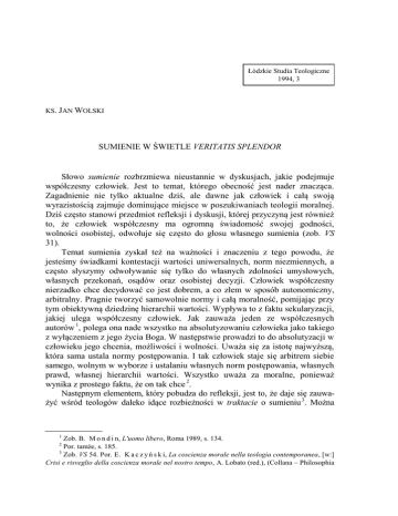 Łódzkie Studia Teologiczne 1994, 3 KS. JAN WOLSKI SUMIENIE W ŚWIETLE VERITATIS SPLENDOR Słowo sumienie rozbrzmiewa nieustannie w dyskusjach, jakie podejmuje współczesny człowiek. Jest to temat, którego obecność jest nader znacząca. Zagadnienie nie tylko aktualne dziś, ale dawne jak człowiek i całą swoją wyrazistością zajmuje dominujące miejsce w poszukiwaniach teologii moralnej. Dziś często stanowi przedmiot refleksji i dyskusji, której przyczyną jest również to, że człowiek współczesny ma ogromną świadomość swojej godności, wolności osobistej, odwołuje się często do głosu własnego sumienia (zob. VS 31). Temat sumienia zyskał też na ważności i znaczeniu z tego powodu, że jesteśmy świadkami kontestacji wartości uniwersalnych, norm niezmiennych, a często słyszymy odwoływanie się tylko do własnych zdolności umysłowych, własnych przekonań, osądów oraz osobistej decyzji. Człowiek współczesny nierzadko chce decydować co jest dobrem, a co złem w sposób autonomiczny, arbitralny. Pragnie tworzyć samowolnie normy i całą moralność, pomijając przy tym obiektywną dziedzinę hierarchii wartości. Wypływa to z faktu sekularyzacji, jakiej ulega współczesny człowiek. Jak zauważa jeden ze współczesnych autorów 1, polega ona nade wszystko na absolutyzowaniu człowieka jako takiego z wyłączeniem z jego życia Boga. W następstwie prowadzi to do absolutyzacji w człowieku jego chcenia, możliwości i wolności. Uważa się za istotę najwyższą, która sama ustala normy postępowania. I tak człowiek staje się arbitrem siebie samego, wolnym w wyborze i ustalaniu własnych norm postępowania, własnych prawd, własnej hierarchii wartości. Wszystko uważa za moralne, ponieważ wynika z prostego faktu, że on tak chce 2. Następnym elementem, który pobudza do refleksji, jest to, że daje się zauważyć wśród teologów daleko idące rozbieżności w traktacie o sumieniu 3. Można 1 Zob. B. M o n d i n, L'uomo libero, Roma 1989, s. 134. Por. tamże, s. 185. 3 Zob. VS 54. Por. E. K a c z y ń s k i, La coscienza morale nella teologia contemporanea, [w:] Crisi e risveglio della coscienza morale nel nostro tempo, A. Lobato (red.), (Collana – Philosophia 2 348 JAN WOLSKI ogólnie stwierdzić, iż jedni z nich przyznają sumieniu funkcję prostej aplikacji norm moralnych, inni rozumieją sumienie jako element kreujący normy, jeszcze inni widzą i łączą ją ze strukturą samego człowieka, jeszcze inni widzą funkcję sumienia jako prostej decyzji działającego. Nie chodzi tu o pluralizm w teologii, który jest jak najbardziej słuszny i wzajemnie uzupełniający się. Idzie o wyrażone poglądy, które prowadzą do wyrabiania opinii, „która podaje w wątpliwość istnienie wewnętrznego i nierozerwalnego związku pomiędzy wiarą a moralnością, jakby tylko wiara miała decydować o przynależności do Kościoła i o jego wewnętrznej jedności, natomiast byłby do przyjęcia pluralizm opinii i sposobów postępowania, uzależnionych od indywidualnego osądu subiektywnego sumienia lub od złożoności uwarunkowań społeczno-kulturowych” (VS 4). Veritatis splendor, poddaje ostrej krytyce kreacjonizm sumienia, propagowany przez pewne nurty kulturowe, które przeciwstawiają się i wprowadzają rozdział między wolnością a prawem. W konsekwencji prowadzi to bowiem do „kreatywnej” interpretacji sumienia. Taka koncepcja nie da się pogodzić z nauką Kościoła i jego Urzędu Nauczycielskiego (zob. VS 54). Jan Paweł II zwraca uwagę, że sposób w jaki pojmuje się wzajemne odniesienie wolności i prawdy jest związane z koncepcją sumienia. Nurty kulturowe, o których mowa, często propagują postawę rozbratu między wolnością a prawem i prowadzą do błędnej interpretacji sumienia. Niewłaściwe pojmowanie wolności, do których dążą niektóre współczesne tendencje kulturowe, a stanowiące dość liczne nurty etyczne, „podkreślają rzekomy konflikt między wolnością a prawem. Należą do nich doktryny, które przyznają poszczególnym jednostkom lub grupom społecznym prawo decydowania o tym, co jest dobre, a co złe: według nich ludzka wolność może »stwarzać wartości« i cieszy się pierwszeństwem przed prawdą, do tego stopnia, że sama prawda uznana jest za jeden z wytworów wolności” (VS 35). Idzie zatem o ujęcie wzajemnej relacji dwóch wielkości: prawdy i wolności. Te właśnie wartości pozostają kluczowymi wartościami, które dotykają zagadnienia sumienia (zob. VS 35; 54; 56). FUNKCJE SUMIENIA Prawo moralne, które jest wypisane w sercu człowieka, jest wyrazem dobroci, mądrości i Opatrzności Bożej, która wskazuje człowiekowi, co dla niego jest rzeczywistym dobrem, a co złem. Prawo to jest podniesione do porządku nadprzyrodzonego, a jego poznanie jest możliwe dzięki Objawieniu, przez rozum oświecony blaskiem wiary. Wśród wielu wypowiedzi Encykliki można przytoczyć następującą, szczególnie wyrazistą w swej treści: „Zakazując człowiekowi »jedzenia z drzewa poznania dobra i zła«, Bóg stwierdza, że człowiek nie posiada od początku tego »poznania«, ale jedynie ma w nim udział dzięki światłu naturalnego rozumu i 3), Bologna 1989, s. 47–80; P. G. P e s c e, La coscienza e la verità, [w:] Veritatis spledor. Lettera Enciclica di Giovanni Paolo II. Testo con i commenti, G. Concetti (red.), Roma 1994, s. 99. SUMIENIE W ŚWIETLE VERITATIS SPLENDOR 349 Bożego Objawienia, które ukazują mu wymogi i wezwania odwiecznej mądrości. Należy zatem uznać prawo za wyraz Bożej mądrości: poddając się prawu, wolność poddaje się prawdzie stworzenia” (VS 41). W takim to kontekście Encyklika pragnie przedstawić to, co jest właściwą funkcją sumienia. Punktem wyjścia (zob. VS 57) jest znany dobrze tekst św. Pawła z Listu do Rzymian (2, 14 nn). Pierwszą funkcją, na jaką wskazuje Ojciec Święty, jest ta, iż sumienie staje się swoistym 