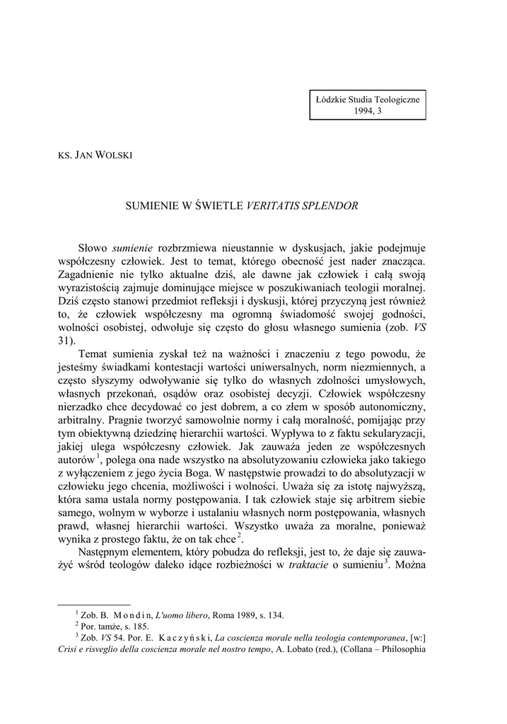 SUMIENIE W ŚWIETLE VERITATIS SPLENDOR Słowo sumienie