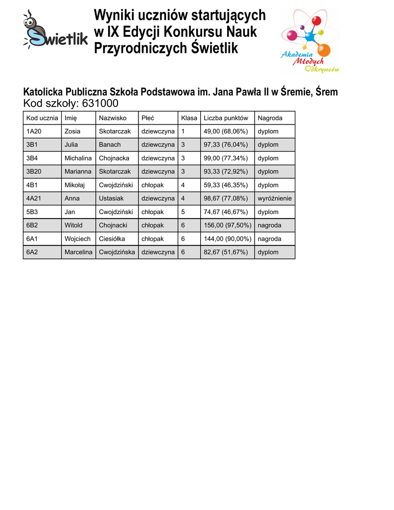 Wyniki uczniów startujących w IX Edycji Konkursu Nauk Przyrodniczych Świetlik Katolicka Publiczna Szkoła Podstawowa im. Jana Pawła II w Śremie, Śrem Kod szkoły: 631000 Kod ucznia Imię Nazwisko Płeć Klasa Liczba punktów Nagroda 1A20 Zosia Skotarczak dziewczyna 1 49,00 (68,06%) dyplom 3B1 Julia Banach dziewczyna 3 97,33 (76,04%) dyplom 3B4 Michalina Chojnacka dziewczyna 3 99,00 (77,34%) dyplom 3B20 Marianna Skotarczak dziewczyna 3 93,33 (72,92%) dyplom 4B1 Mikołaj Cwojdziński chłopak 4 59,33 (46,35%) dyplom 4A21 Anna Ustasiak dziewczyna 4 98,67 (77,08%) wyróżnienie 5B3 Jan Cwojdziński chłopak 5 74,67 (46,67%) dyplom 6B2 Witold Chojnacki chłopak 6 156,00 (97,50%) nagroda 6A1 Wojciech Ciesiółka chłopak 6 144,00 (90,00%) nagroda 6A2 Marcelina Cwojdzińska dziewczyna 6 82,67 (51,67%) dyplom