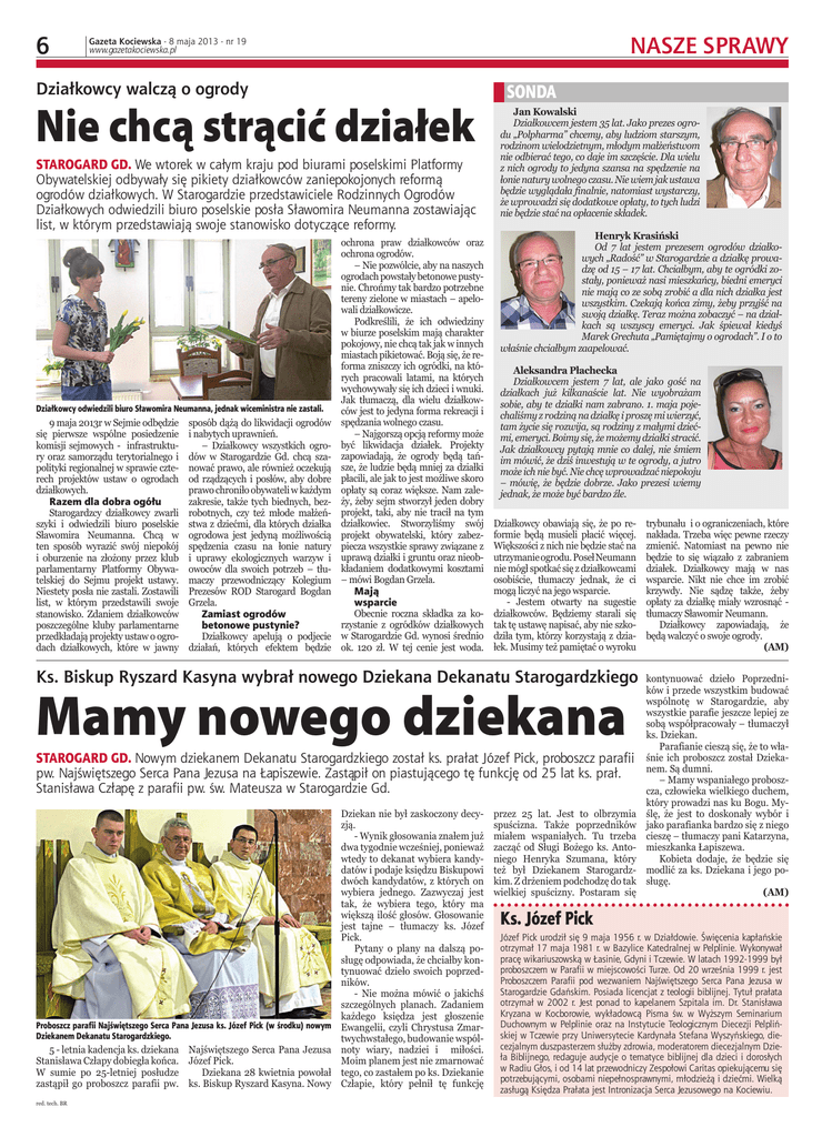 nasze sprawy Gazeta Kociewska - 8 maja 2013 - nr 19 www.gazetakociewska.pl Działkowcy walczą o ogrody Nie chcą strącić działek STAROGARD GD. We wtorek w całym kraju pod biurami poselskimi Platformy Obywatelskiej odbywały się pikiety działkowców zaniepokojonych reformą ogrodów działkowych. W Starogardzie przedstawiciele Rodzinnych Ogrodów Działkowych odwiedzili biuro poselskie posła Sławomira Neumanna zostawiając list, w którym przedstawiają swoje stanowisko dotyczące reformy. Działkowcy odwiedzili biuro Sławomira Neumanna, jednak wiceministra nie zastali. 9 maja 2013r w Sejmie odbędzie się pierwsze wspólne posiedzenie komisji sejmowych - infrastruktury oraz samorządu terytorialnego i polityki regionalnej w sprawie czterech projektów ustaw o ogrodach działkowych. Razem dla dobra ogółu Starogardzcy działkowcy zwarli szyki i odwiedzili biuro poselskie Sławomira Neumanna. Chcą w ten sposób wyrazić swój niepokój i oburzenie na złożony przez klub parlamentarny Platformy Obywatelskiej do Sejmu projekt ustawy. Niestety posła nie zastali. Zostawili list, w którym przedstawili swoje stanowisko. Zdaniem działkowców poszczególne kluby parlamentarne przedkładają projekty ustaw o ogrodach działkowych, które w jawny sposób dążą do likwidacji ogrodów i nabytych uprawnień. – Działkowcy wszystkich ogrodów w Starogardzie Gd. chcą szanować prawo, ale również oczekują od rządzących i posłów, aby dobre prawo chroniło obywateli w każdym zakresie, także tych biednych, bezrobotnych, czy też młode małżeństwa z dziećmi, dla których działka ogrodowa jest jedyną możliwością spędzenia czasu na łonie natury i uprawy ekologicznych warzyw i owoców dla swoich potrzeb – tłumaczy przewodniczący Kolegium Prezesów ROD Starogard Bogdan Grzela. Zamiast ogrodów betonowe pustynie? Działkowcy apelują o podjecie działań, których efektem będzie ochrona praw działkowców oraz ochrona ogrodów. – Nie pozwólcie, aby na naszych ogrodach powstały betonowe pustynie. Chrońmy tak bardzo potrzebne tereny zielone w miastach – apelowali działkowicze. Podkreślili, że ich odwiedziny w biurze poselskim mają charakter pokojowy, nie chcą tak jak w innych miastach pikietować. Boją się, że reforma zniszczy ich ogródki, na których pracowali latami, na których wychowywały się ich dzieci i wnuki. Jak tłumaczą, dla wielu działkowców jest to jedyna forma rekreacji i spędzania wolnego czasu. – Najgorszą opcją reformy może być likwidacja działek. Projekty zapowiadają, że ogrody będą tańsze, że ludzie będą mniej za działki płacili, ale jak to jest możliwe skoro opłaty są coraz większe. Nam zależy, żeby sejm stworzył jeden dobry projekt, taki, aby nie tracił na tym działkowiec. Stworzyliśmy swój projekt obywatelski, który zabezpiecza wszystkie sprawy związane z uprawą działki i gruntu oraz nieobkładaniem dodatkowymi kosztami – mówi Bogdan Grzela. Mają wsparcie Obecnie roczna składka za korzystanie z ogródków działkowych w Starogardzie Gd. wynosi średnio ok. 120 zł. W tej cenie jest woda. sonda Jan Kowalski Działkowcem jestem 35 lat. Jako prezes ogrodu „Polpharma” chcemy, aby ludziom starszym, rodzinom wielodzietnym, młodym małżeństwom nie odbierać tego, co daje im szczęście. Dla wielu z nich ogrody to jedyna szansa na spędzenie na łonie natury wolnego czasu. Nie wiem jak ustawa będzie wyglądała finalnie, natomiast wystarczy, że wprowadzi się dodatkowe opłaty, to tych ludzi nie będzie stać na opłacenie składek. Henryk Krasiński Od 7 lat jestem prezesem ogrodów działkowych „Radość” w Starogardzie a działkę prowadzę od 15 – 17 lat. Chciałbym, aby te ogródki zostały, ponieważ nasi mieszkańcy, biedni emeryci nie mają co ze sobą zrobić a dla nich działka jest wszystkim. Czekają końca zimy, żeby przyjść na swoją działkę. Teraz można zobaczyć – na działkach są wszyscy emeryci. Jak śpiewał kiedyś Marek Grechuta „Pamiętajmy o ogrodach”. I o to właśnie chciałbym zaapelować. Aleksandra Płachecka Działkowcem jestem 7 lat, ale jako gość na działkach już kilkanaście lat. Nie wyobrażam sobie, aby te działki nam zabrano. 1. maja pojechaliśmy z rodziną na działkę i proszę mi wierzyć, tam życie się rozwija, są rodziny z małymi dziećmi, emeryci. Boimy się, że możemy działki stracić. Jak działkowcy pytają mnie co dalej, nie śmiem im mówić, że dziś inwestują w te ogrody, a jutro może ich nie być. Nie chcę wprowadzać niepokoju – mówię, że będzie dobrze. Jako prezesi wiemy jednak, że może być bardzo źle. Działkowcy obawiają się, że po reformie będą musieli płacić więcej. Większości z nich nie będzie stać na utrzymanie ogrodu. Poseł Neumann nie mógł spotkać się z działkowcami osobiście, tłumaczy jednak, że ci mogą liczyć na jego wsparcie. - Jestem otwarty na sugestie działkowców. Będziemy starali się tak tę ustawę napisać, aby nie szkodziła tym, którzy korzystają z działek. Musimy też pamiętać o wyroku Ks. Biskup Ryszard Kasyna wybrał nowego Dziekana Dekanatu Starogardzkiego Mamy nowego dziekana STAROGARD GD. Nowym dziekanem Dekanatu Starogardzkiego został ks. prałat Józef Pick, proboszcz parafii pw. Najświętszego Serca Pana Jezusa na Łapiszewie. Zastąpił on piastującego tę funkcję od 25 lat ks. prał. Stanisława Człapę z parafii pw. św. Mateusza w Starogardzie Gd. Proboszcz parafii Najświętszego Serca Pana Jezusa ks. Józef Pick (w środku) nowym Dziekanem Dekanatu Starogardzkiego. 5 - letnia kadencja ks. dziekana Najświętszego Serca Pana Jezusa Stanisława Człapy dobiegła końca. Józef Pick. W sumie po 25-letniej posłudze Dziekana 28 kwietnia powołał zastąpił go proboszcz parafii pw. ks. Biskup Ryszard Kasyna. Nowy red. tech. BR Dziekan nie był zaskoczony decyzją. - Wynik głosowania znałem już dwa tygodnie wcześniej, ponieważ