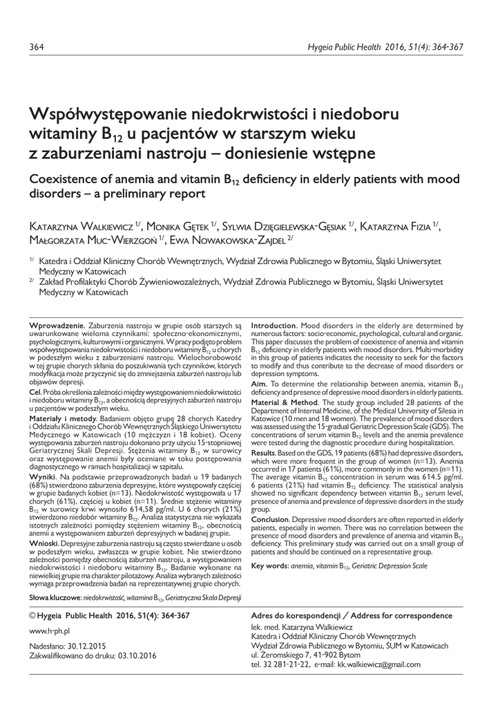 364 Hygeia Public Health 2016, 51(4): 364-367 Współwystępowanie niedokrwistości i niedoboru witaminy B12 u pacjentów w starszym wieku z zaburzeniami nastroju – doniesienie wstępne Coexistence of anemia and vitamin B12 deficiency in elderly patients with mood disorders – a preliminary report Katarzyna Walkiewicz 1/, Monika Gętek 1/, Sylwia Dzięgielewska-Gęsiak 1/, Katarzyna Fizia 1/, Małgorzata Muc-Wierzgoń 1/, Ewa Nowakowska-Zajdel 2/ Katedra i Oddział Kliniczny Chorób Wewnętrznych, Wydział Zdrowia Publicznego w Bytomiu, Śląski Uniwersytet Medyczny w Katowicach 2/ Zakład Profilaktyki Chorób Żywieniowozależnych, Wydział Zdrowia Publicznego w Bytomiu, Śląski Uniwersytet Medyczny w Katowicach 1/ Wprowadzenie. Zaburzenia nastroju w grupie osób starszych są uwarunkowane wieloma czynnikami: społeczno-ekonomicznymi, psychologicznymi, kulturowymi i organicznymi. W pracy podjęto problem współwystępowania niedokrwistości i niedoboru witaminy B12 u chorych w podeszłym wieku z zaburzeniami nastroju. Wielochorobowość w tej grupie chorych skłania do poszukiwania tych czynników, których modyfikacja może przyczynić się do zmniejszenia zaburzeń nastroju lub objawów depresji. Cel. Próba określenia zależności między występowaniem niedokrwistości i niedoboru witaminy B12, a obecnością depresyjnych zaburzeń nastroju u pacjentów w podeszłym wieku. Materiały i metody. Badaniem objęto grupę 28 chorych Katedry i Oddziału Klinicznego Chorób Wewnętrznych Śląskiego Uniwersytetu Medycznego w Katowicach (10 mężczyzn i 18 kobiet). Oceny występowania zaburzeń nastroju dokonano przy użyciu 15-stopniowej Geriatrycznej Skali Depresji. Stężenia witaminy B 12 w surowicy oraz występowanie anemii były oceniane w toku postępowania diagnostycznego w ramach hospitalizacji w szpitalu. Wyniki. Na podstawie przeprowadzonych badań u 19 badanych (68%) stwierdzono zaburzenia depresyjne, które występowały częściej w grupie badanych kobiet (n=13). Niedokrwistość występowała u 17 chorych (61%), częściej u kobiet (n=11). Średnie stężenie witaminy B12 w surowicy krwi wynosiło 614,58 pg/ml. U 6 chorych (21%) stwierdzono niedobór witaminy B12. Analiza statystyczna nie wykazała istotnych zależności pomiędzy stężeniem witaminy B12, obecnością anemii a występowaniem zaburzeń depresyjnych w badanej grupie. Wnioski. Depresyjne zaburzenia nastroju są często stwierdzane u osób w podeszłym wieku, zwłaszcza w grupie kobiet. Nie stwierdzono zależności pomiędzy obecnością zaburzeń nastroju, a występowaniem niedokrwistości i niedoboru witaminy B12. Badanie wykonane na niewielkiej grupie ma charakter pilotażowy. Analiza wybranych zależności wymaga przeprowadzenia badań na reprezentatywnej grupie chorych. Introduction. Mood disorders in the elderly are determined by numerous factors: socio-economic, psychological, cultural and organic. This paper discusses the problem of coexistence of anemia and vitamin B12 deficiency in elderly patients with mood disorders. Multi-morbidity in this group of patients indicates the necessity to seek for the factors to modify and thus contribute to the decrease of mood disorders or depression symptoms. Aim. To determine the relationship between anemia, vitamin B12 deficiency and presence of depressive mood disorders in elderly patients. Material & Method. The study group included 28 patients of the Department of Internal Medicine, of the Medical University of Silesia in Katowice (10 men and 18 women). The prevalence of mood disorders was assessed using the 15-gradual Geriatric Depression Scale (GDS). The concentrations of serum vitamin B12 levels and the anemia prevalence were tested during the diagnostic procedure during hospitalization. Results. Based on the GDS, 19 patients (68%) had depressive disorders, which were more frequent in the group of women (n=13). Anemia occurred in 17 patients (61%), more commonly in the women (n=11). The average vitamin B12 concentration in serum was 614.5 pg/ml. 6 patients (21%) had vitamin B12 deficiency. The statistical analysis showed no significant dependency between vitamin B12 serum level, presence of anemia and prevalence of depressive disorders in the study group. Conclusion. Depressive mood disorders are often reported in elderly patients, especially in women. There was no correlation between the presence of mood disorders and prevalence of anemia and vitamin B12 deficiency. This preliminary study was carried out on a small group of patients and should be continued on a representative group. Key words: anemia, vitamin B12, Geriatric Depression Scale Słowa kluczowe: niedokrwistość, witamina B12, Geriatryczna Skala Depresji © Hygeia Public Health 2016, 51(4): 364-367 Adres do korespondencji / Address for correspondence www.h-ph.pl lek. med. Katarzyna Walkiewicz Katedra i Oddział Kliniczny Chorób Wewnętrznych Wydział Zdrowia Publicznego w Bytomiu, ŚUM w Katowicach ul. Żeromskiego 7, 41-902 Bytom tel. 32 281-21-22, e-mail: [email protected] Nadesłano: 30.12.2015 Zakwalifikowano do druku: 03.10.2016 Walkiewicz K i wsp. Współwystępowanie niedokrwistości i niedoboru witaminy B12 u pacjentów w starszym wieku ... 365 Wprowadzenie Cel Według aktualnych danych demograficznych średnia długość życia w Polsce wynosi 72,7 lat dla mężczyzny i 80,9 lat dla kobiet. Z analizy parametru dalszego przewidywanego życia dla osób w wieku 60 lat wynika, że wynosi on aktualnie 18,5 lat dla mężczyzn i 23,7 lat dla kobiet. W porównaniu z latami poprzednimi długość ta jest większa o kilka lat, i nadal wykazuje tendencję rosnącą. Dane te są odzwierciedleniem procesów demograficznych, które opisywane są jako starzenie się populacji. Fakt ten stawia nowe wyzwania przed organizacją ochrony zdrowia i zmusza do bardziej szczegółowego przyjrzenia się problemom zdrowotnym populacji osób starszych [1]. Charakterystyczną cechą pacjentów w starszym wiek