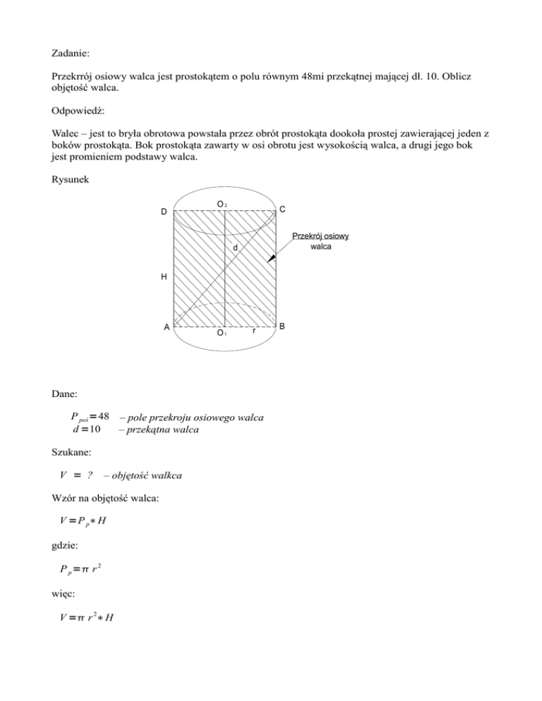Zadanie: Przekrrój osiowy walca jest prostokątem o polu równym 48mi przekątnej mającej dł. 10. Oblicz objętość walca. Odpowiedź: Walec – jest to bryła obrotowa powstała przez obrót prostokąta dookoła prostej zawierającej jeden z boków prostokąta. Bok prostokąta zawarty w osi obrotu jest wysokością walca, a drugi jego bok jest promieniem podstawy walca. Rysunek O2 C D Przekrój osiowy walca d H A O1 r Dane: P poś =48 – pole przekroju osiowego walca d =10 – przekątna walca Szukane: V = ? – objętość walkca Wzór na objętość walca: V =P p∗H gdzie: P p = r 2 więc: V = r 2∗H B Wiemy, Ŝe : – pole przekroju osiowego walca jest równe: P poś =2 r ∗ H – z trójkąta ABC, stosując Tw. Pitagorasa otrzymamy: 2r2 H 2 = d 2 Mając dane pole przekroju osiowego i długośćprzekątnej, z powyŜszych wzorów układamy układ równań i rozwiązujemy go. P poś =2 r ∗ H 2r2 H 2 = d 2 2 r ∗ H = 48 2r 2 H 2 = 10 2 2 r= 48 H 2 48 2 2 H = 10 H Wyznaczamy H 2304 H 2 = 100 2 H 2304 H 4 = 100 H 2 H 4 −100 H 2 2304=0 Z powyŜszego równania kwadratowego wyznaczamy wysokość H: Niech H 2= x mamy więc 2 x −100 x 2304=0 Wyznaczamy wyróŜnik delta, gdzie: a=1; b=-100; c=2304. =b2−4ac =−1002−4∗1∗2030 =784 =28 x 1= −b− 2a x 1= x 2= −b 2a x 2= −−100−28 =36 2∗1 −−10028 =64 2∗1 Wracamy do podstawienia H 2= x 2 H =36 2 H =64 H = x1 H = x2 2 H=6 2 H=8 W powyŜszym rozwiązaniu ominęliśmy ujemne rozwiązania, poniewaŜ długość, odcinek itp. Nie mogą mieć wartości ujemnych. Jak z rozwiązania wynika, będziemy rozpatrywać dwa walce o wysokości – Dla 2 r= 2 r= H =8 . H=6 48 H – Dla H =6 i 2 r= 48 6 2 r=8 r=4 48 8 2 r=6 r =3 H=8 48 H 2 r= Ze względu na załoŜenia i rozwiązania rozpatrujemy dwa walce i obliczamy objętość dla dwóch walców. V = r 2∗H – Dla H =6 i r=4 V = 42∗6 V = 96 – Dla H =8 i r =3 V = 32∗8 V = 72 Odpowiedź: Oblicz objętość walca wynosi: – Dla H=6 i r=4 – V = 96 – Dla H =8 i r =3 – V = 72