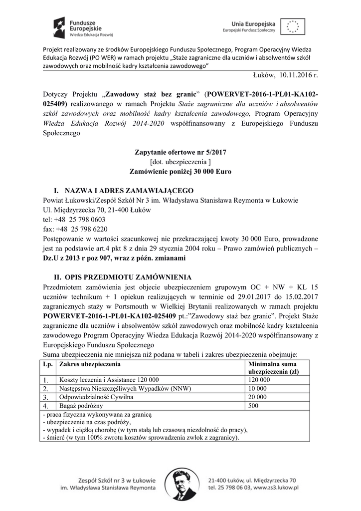 Projekt realizowany ze środków Europejskiego Funduszu Społecznego, Program Operacyjny Wiedza Edukacja Rozwój (PO WER) w ramach projektu „Staże zagraniczne dla uczniów i absolwentów szkół zawodowych oraz mobilność kadry kształcenia zawodowego” Łuków, 10.11.2016 r. Dotyczy Projektu „Zawodowy staż bez granic” (POWERVET-2016-1-PL01-KA102025409) realizowanego w ramach Projektu Staże zagraniczne dla uczniów i absolwentów szkół zawodowych oraz mobilność kadry kształcenia zawodowego, Program Operacyjny Wiedza Edukacja Rozwój 2014-2020 współfinansowany z Europejskiego Funduszu Społecznego Zapytanie ofertowe nr 5/2017 [dot. ubezpieczenia ] Zamówienie poniżej 30 000 Euro I. NAZWA I ADRES ZAMAWIAJĄCEGO Powiat Łukowski/Zespół Szkół Nr 3 im. Władysława Stanisława Reymonta w Łukowie Ul. Międzyrzecka 70, 21-400 Łuków tel: +48 25 798 0603 fax: +48 25 798 6220 Postępowanie w wartości szacunkowej nie przekraczającej kwoty 30 000 Euro, prowadzone jest na podstawie art.4 pkt 8 z dnia 29 stycznia 2004 roku – Prawo zamówień publicznych – Dz.U z 2013 r poz 907, wraz z późn. zmianami II. OPIS PRZEDMIOTU ZAMÓWNIENIA Przedmiotem zamówienia jest objecie ubezpieczeniem grupowym OC + NW + KL 15 uczniów technikum + 1 opiekun realizujących w terminie od 29.01.2017 do 15.02.2017 zagranicznych staży w Portsmouth w Wielkiej Brytanii realizowanych w ramach projektu POWERVET-2016-1-PL01-KA102-025409 pt.:”Zawodowy staż bez granic”. Projekt Staże zagraniczne dla uczniów i absolwentów szkół zawodowych oraz mobilność kadry kształcenia zawodowego Program Operacyjny Wiedza Edukacja Rozwój 2014-2020 współfinansowany z Europejskiego Funduszu Społecznego Suma ubezpieczenia nie mniejsza niż podana w tabeli i zakres ubezpieczenia obejmuje: Lp. Zakres ubezpieczenia Koszty leczenia i Assistance 120 000 Następstwa Nieszczęśliwych Wypadków (NNW) Odpowiedzialność Cywilna Bagaż podróżny - praca fizyczna wykonywana za granicą - ubezpieczenie na czas podróży, - wypadek i ciężką chorobę (w tym stałą lub czasową niezdolność do pracy), - śmierć (w tym 100% zwrotu kosztów sprowadzenia zwłok z zagranicy). 1. 2. 3. 4. Minimalna suma ubezpieczenia (zł) 120 000 10 000 20 000 500 Projekt realizowany ze środków Europejskiego Funduszu Społecznego, Program Operacyjny Wiedza Edukacja Rozwój (PO WER) w ramach projektu „Staże zagraniczne dla uczniów i absolwentów szkół zawodowych oraz mobilność kadry kształcenia zawodowego” III.TERMIN WYKONANIA 1. Wykonawca zobowiązuje się by przedmiot zamówienia zrealizować najpóźniej do dania 18.01.2017 r. IV. OPIS WARUNKÓW UDZIAŁU W POSTĘPOWANIU ORAZ OPIS SPOSOBU DOKONYWANIA OCENY SPEŁNIENIA WARUNKÓW: 1. Zamawiający zastrzega sobie prawo do prowadzenia negocjacji z wykonawcami, którzy złożyli oferty, jak też do niedokonywania wyboru oferty bez podania przyczyny. V. OSOBA UPRAWNIONA DO POROZUMIEWANIA SIĘ Z WYKONWCAMI : 1. Wszystkie informacje można uzyskać pod numerem tel. 25 798 06 03 . Osobą wyznaczoną do kontaktów jest: Bartosz Sawicki VI. OPIS SPOSOBU PRZYGOTOWANIA OFERTY 1. Ofertę stanowi prawidłowo wypełniany Formularz Ofertowy wraz z załącznikami. 2. Formularz Ofertowy należy sporządzić na podstawie wzoru stanowiącego załącznik nr 1 do niniejszego zapytania. 3. Oferta musi być podpisana przez osobę lub osoby uprawnione do składania oświadczeń woli w imieniu Wykonawcy 4. Wszelkie miejsca w ofercie gdzie dokonano naniesienia poprawek lub zmiany wpisywanej treści muszą być podpisane przez osobę uprawnioną do podpisania oferty. VII. TERMIN ZWIĄZANIA Z OFERTĄ 30 dni od podanego niżej terminu składania ofert. VIII. ODRZUCENIE OFERT 1. Zamawiający odrzuci oferty niezgodne z zapytaniem ofertowym, szczególnie w zakresie: przedmiotu zamówienia, terminu wykonania zamówienia oraz wymaganego sposobu złożenia oferty. IX. MIEJSCE ORAZ TERMIN SKŁADANIA OFERT 1. Oferta z załącznikiem winna być złożona na druku załączonego Formularza do dnia 18.01.2017 r. do godz. 14.00 w siedzibie Zespołu Szkół Nr 3 im. Wł. St. Reymonta w Łukowie ul. Międzyrzecka 70 21-400 Łuków lub drogą elektroniczna na adres: [email protected] 2. Oferta oraz wymagane załączniki składane wraz z ofertą wymagają podpisu osób uprawnionych do reprezentowania firmy. Oferta winna zawierać: a) Wypełniony Formularz oferty – przygotowany zgodnie ze wzorem stanowiącym załącznik nr 1 do niniejszego zapytania, 3. Ofertę należy umieścić w zamkniętej kopercie opatrzonej danymi Wykonawcy oraz poniższym opisem tematu, którego postępowanie dotyczy: Projekt realizowany ze środków Europejskiego Funduszu Społecznego, Program Operacyjny Wiedza Edukacja Rozwój (PO WER) w ramach projektu „Staże zagraniczne dla uczniów i absolwentów szkół zawodowych oraz mobilność kadry kształcenia zawodowego” Oferta na ubezpieczenie osób wyjeżdżających na staże zagraniczne „Zawodowy staż bez granic” X. KRYTERIUM OCENY OFERT 1. Wybór oferty zostanie dokonany według następujących kryteriów oceny ofert: • Cena – 100 % Punkty za cenę będą obliczane wg następującego wzoru: Najniższa cena oferty Liczba punktów = ------------------------------------------ x 100 Cena badanej oferty Cenę za przedmiot zamawiania Wykonawca przedstawia w „formularzu oferty” stanowiącym załącznik nr 1 do niniejszego zapytania. Wszystkie ceny jednostkowe i wartości należy podać z dokładnością do dwóch miejsc po przecinku. Cena oferty musi być podana w PLN cyfrowo, dla poszczególnych rodzajów produktów osobno i podliczona zbiorczo dla całości zamówienia. Wykonawca może zaproponować tylko jedną cenę i nie może jej zmienić po złożeniu oferty. Wszystkie koszty związane z realizacją niniejszego zamówienia powinny być skalkulowane w cenie oferty. Oferta, która uzyska największą liczbę punktów zostanie uznana przez Zamawiającego za ofertę najkor