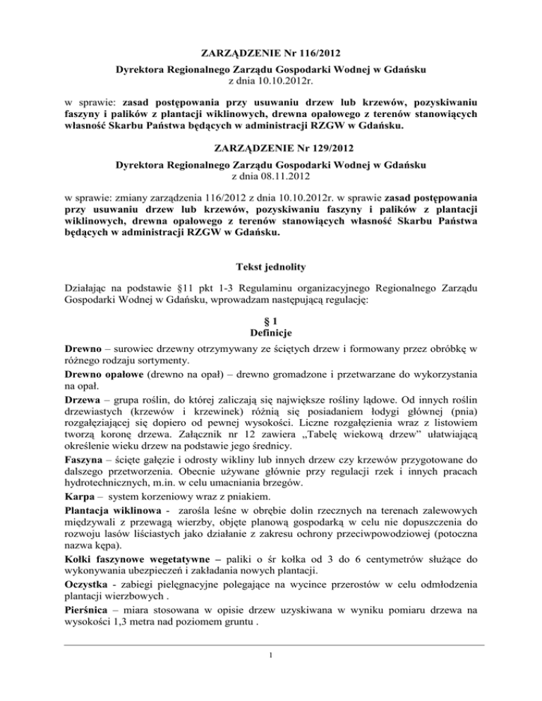 ZARZĄDZENIE Nr 116/2012 Dyrektora Regionalnego Zarządu Gospodarki Wodnej w Gdańsku z dnia 10.10.2012r. w sprawie: zasad postępowania przy usuwaniu drzew lub krzewów, pozyskiwaniu faszyny i palików z plantacji wiklinowych, drewna opałowego z terenów stanowiących własność Skarbu Państwa będących w administracji RZGW w Gdańsku. ZARZĄDZENIE Nr 129/2012 Dyrektora Regionalnego Zarządu Gospodarki Wodnej w Gdańsku z dnia 08.11.2012 w sprawie: zmiany zarządzenia 116/2012 z dnia 10.10.2012r. w sprawie zasad postępowania przy usuwaniu drzew lub krzewów, pozyskiwaniu faszyny i palików z plantacji wiklinowych, drewna opałowego z terenów stanowiących własność Skarbu Państwa będących w administracji RZGW w Gdańsku. Tekst jednolity Działając na podstawie §11 pkt 1-3 Regulaminu organizacyjnego Regionalnego Zarządu Gospodarki Wodnej w Gdańsku, wprowadzam następującą regulację: §1 Definicje Drewno – surowiec drzewny otrzymywany ze ściętych drzew i formowany przez obróbkę w róŜnego rodzaju sortymenty. Drewno opałowe (drewno na opał) – drewno gromadzone i przetwarzane do wykorzystania na opał. Drzewa – grupa roślin, do której zaliczają się największe rośliny lądowe. Od innych roślin drzewiastych (krzewów i krzewinek) róŜnią się posiadaniem łodygi głównej (pnia) rozgałęziającej się dopiero od pewnej wysokości. Liczne rozgałęzienia wraz z listowiem tworzą koronę drzewa. Załącznik nr 12 zawiera „Tabelę wiekową drzew” ułatwiającą określenie wieku drzew na podstawie jego średnicy. Faszyna – ścięte gałęzie i odrosty wikliny lub innych drzew czy krzewów przygotowane do dalszego przetworzenia. Obecnie uŜywane głównie przy regulacji rzek i innych pracach hydrotechnicznych, m.in. w celu umacniania brzegów. Karpa – system korzeniowy wraz z pniakiem. Plantacja wiklinowa - zarośla leśne w obrębie dolin rzecznych na terenach zalewowych międzywali z przewagą wierzby, objęte planową gospodarką w celu nie dopuszczenia do rozwoju lasów liściastych jako działanie z zakresu ochrony przeciwpowodziowej (potoczna nazwa kępa). Kołki faszynowe wegetatywne – paliki o śr kołka od 3 do 6 centymetrów słuŜące do wykonywania ubezpieczeń i zakładania nowych plantacji. Oczystka - zabiegi pielęgnacyjne polegające na wycince przerostów w celu odmłodzenia plantacji wierzbowych . Pierśnica – miara stosowana w opisie drzew uzyskiwana w wyniku pomiaru drzewa na wysokości 1,3 metra nad poziomem gruntu . 1 Pomiar drewna – jednostką miary jest metr przestrzenny (mp), drewno mierzone jest w stosach, elementami pomiaru jest długość, szerokość i wysokość stosu. Załącznik nr 11 zawiera współczynniki przeliczeniowe m3 na mp. Pomiar faszyny – jednostką miary jest metr przestrzenny (mp), pomiar winien być zgodny BN-68/9221-04. Elementami pomiaru jest długość, szerokość i wysokość stosu, termin pomiaru nie moŜe być krótszy niŜ 48 godzin od ułoŜenia partii faszyny do odbioru. Pomiar zrębki – jednostką miary jest metr przestrzenny (mp), zrębka mierzona jest na przyczepie, elementami pomiaru jest długość, szerokość i wysokość pryzmy. Przerost, przerosty – drzewostan, który ze względu na wiek powyŜej ośmiu lat nie nadaje się do pozyskania faszyny, przeznaczany jest na cele opałowe. Wiatrołom - drzewo połamane silnym wiatrem. Wiatrołomy ze względu na duŜe zagroŜenie są usuwane z terenu, jednak nie są to drzewa obumarłe i ich usuwanie w Polsce wymaga odpowiedniego zezwolenia. Wiklina – gatunki wierzby uprawiane na plantacji wiklinowej (kępie) w celu uzyskania faszyny. Wywrót, wykrot, wiatrował – drzewo z naderwanym korzeniem, lub całkowicie wywrócone w wyniku działania wiatru rzadziej deszczu. Zator – powalone w koryto rzeczne drzewa, które powodują podpiętrzenie wody, oraz wzmagają erozję brzegową i denną. Zrębki – cząstki drewna o wymiarach mieszących się w granicach od kilku milimetrów do kilkunastu centymetrów, powstające w wyniku rozdrabniania drewna za pomocą maszyn zrębkujących. §2 Stosowanie przepisów prawnych Komórki organizacyjne oraz jednostki terenowe właściwe w sprawach usuwania drzew lub krzewów, zobowiązuję do ścisłego przestrzegania i odpowiedniego stosowania przepisów prawnych, zawartych w następujących aktach prawnych: 1. Ustawa z dnia 16 kwietnia 2004 r. o ochronie przyrody (Dz.U. z 2009 Nr 151 poz. 1220 ze zm.) 2. Ustawa z dnia 18 lipca 2001 r. – Prawo wodne (Dz.U. z 2012 poz. 145) 3. Ustawa o udostępnianiu informacji o środowisku i jego ochronie, udziale społeczeństwa w ochronie środowiska oraz o ocenach oddziaływania na środowisko z dnia 3 października 2008 r. (Dz.U. Nr 199 poz. 1227 z późn. zm.) 4. Rozporządzenie Ministra Środowiska w sprawie ochrony gatunkowej zwierząt (Dz.U. z 2011r nr 237 poz. 1419) 5. Ustawa z dnia 27 kwietnia 2001 r. – Prawo ochrony środowiska (Dz.U. Nr 62 poz. 627 ze zm.) 6. Ustawa z dnia 29 stycznia 2004 r. Prawo zamówień publicznych (Dz.U. z 2010 r. Nr 113 poz. 759 ze zm.) 7. Ustawa z dnia 23 lipca 2003 r. o ochronie zabytków i opiece nad zabytkami (Dz.U. Nr 162 poz. 1568 ze zm.) 8. Ustawa z dnia 23 kwietnia 1964 r. – Kodeks cywilny (Dz.U. Nr 16 poz. 93) 9. Ustawa z dnia 11 marca 2004 r. o podatku od towarów i usług (Dz.U. Nr 54 poz. 535 ze zm.). 2 §3 Decyzje administracyjne 1. Usunięcie drzew lub krzewów w wieku powyŜej dziesięciu lat (z zastrzeŜeniem ust. 4 i 5) wymaga uzyskania zezwolenia władz samorządu lokalnego (wójta, burmistrza lub prezydenta) lub wojewódzkiego konserwatora zabytków na wycinkę. PowyŜsze dotyczy równieŜ drzew przewróconych (wykrotów i wiatrołomów) zalegających w korytach rzecznych. 2. Usunięcie drzew i krzewów w wieku nie przekraczającym 10 lat, nie wymaga uzyskania ww. zezwolenia z wyjątkiem terenów objętych ochroną krajobrazową lub konserwatorską. 3. Wydanie zezwolenia na usunięcie drzew lub krzew