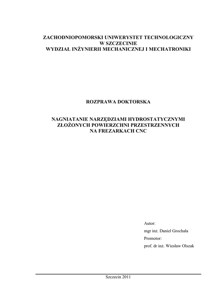 ZACHODNIOPOMORSKI UNIWERYSTET TECHNOLOGICZNY W SZCZECINIE WYDZIAŁ INŻYNIERII MECHANICZNEJ I MECHATRONIKI ROZPRAWA DOKTORSKA NAGNIATANIE NARZĘDZIAMI HYDROSTATYCZNYMI ZŁOŻONYCH POWIERZCHNI PRZESTRZENNYCH NA FREZARKACH CNC Autor: mgr inż. Daniel Grochała Promotor: prof. dr inż. Wiesław Olszak Szczecin 2011 SPIS TREŚCI WYKAZ WAŻNIEJSZYCH OZNACZEŃ I AKRONIMÓW ..................................................................4 WSTĘP ................................................................................................................................................6 1. PRZEGLĄD LITERATURY ............................................................................................................8 1.1. NAGNIATANIE NA FREZARKACH............................................................................................................... 9 1.1.1. Wstępne badania z wykorzystaniem nagniataków sprężystych .................................................. 10 1.1.2. Badania z wykorzystaniem nagniataków hydrostatycznych ....................................................... 12 1.2. NARZĘDZIA DO OBRÓBKI POWIERZCHNI PRZESTRZENNYCH ZŁOŻONYCH ............................................... 18 1.2.1. Zasada działania nagniataka hydrostatycznego ........................................................................ 19 1.2.2. Przegląd rozwiązań nagniataków hydrostatycznych.................................................................. 20 1.3. ZASILANIE HYDRAULICZNYCH NARZĘDZI DO NAGNIATANIA .................................................................. 28 1.4. WNIOSKI Z PRZEGLĄDU LITERATURY ..................................................................................................... 35 2. CELE I PROGRAM PRACY ........................................................................................................36 3. PRZYGOTOWANIE STANOWISKA DOŚWIADCZALNEGO.....................................................37 3.1. NARZĘDZIA HYDROSTATYCZNE DO NAGNIATANIA ................................................................................. 37 3.1.1. Konstrukcja końcówki roboczej ................................................................................................. 38 3.1.2. Wymienne końcówki nagniataków hydrostatycznych ................................................................. 42 3.1.3. Konstrukcja narzędzia z siłomierzem ......................................................................................... 44 3.2. NAGNIATAK HYDROSTATYCZNY PROSTY ............................................................................................... 46 3.3. NAGNIATAK Z TŁOKIEM MIECHOWYM .................................................................................................... 56 3.3.1. Zasada działania nagniataka z tłokiem miechowym .................................................................. 58 3.3.2. Stabilizacja siły nagniatania ...................................................................................................... 62 3.4. HYDROSTATYCZNY NAGNIATAK KĄTOWY ............................................................................................. 67 3.5. HYDRAULICZNY UKŁAD ZASILANIA NARZĘDZI HFA .............................................................................. 69 3.5.1. Wymagania wobec hydraulicznego układu zasilania................................................................. 69 3.5.2. Projekt hydraulicznego układu zasilającego.............................................................................. 70 4. BADANIA DOBORU TECHNOLOGICZNYCH PARAMETRÓW OBRÓBKI..............................82 4.1. PLANOWANIE BADAŃ ............................................................................................................................. 82 4.2. BADANIA EKSPERYMENTALNE – ETAP PIERWSZY ................................................................................... 83 4.3. BADANIA EKSPERYMENTALNE – ETAP DRUGI......................................................................................... 98 4.3.1. Statystyczne opracowanie wyników badań – materiał C45 ..................................................... 103 4.3.2. Statystyczne opracowanie wyników badań – materiał 42CrMo4 (dk=10) ............................... 106 2 4.3.3. Statystyczne opracowanie wyników badań – materiał 42CrMo4 (dk=20) ............................... 118 4.3.4. Weryfikacja wyników drugiego etapu badań doświadczalnych ............................................... 129 4.4. BADANIA NAPRĘŻEŃ W WARSTWIE WIERZCHNIEJ................................................................................. 138 5. WNIOSKI ....................................................................................................................................148 5.1. WNIOSKI POZNAWCZE .......................................................................................................................... 148 5.2. WNIOSKI UTYLITARNE ......................................................................................................................... 149 5.3. DALSZE KIERUNKI PRACY .................................................................................................................... 151 SPIS LITERATURY ........................................................................................................................153 3 Wykaz ważniejszych oznaczeń i akronimów ae – szerokość frezowania [mm] ap – głębokość frezowania [mm] b – szerokość warstwy skrawanej [mm] Dc – średnica czołowa freza [mm] De – średnica efektywna freza [mm] dh – średnica łożyska hydrostatycznego [mm] dk – średnica kulki narzędzia nagniatającego [mm] DM – średnica miecha [mm] do – średnica płytki skrawającej [mm] dt – średnica efektywna tłoka narzędzia nagniatającego [mm] FN – siła nagniatania [N] Fh – siła w nośna w łożysku hydrostatycznym [N] F