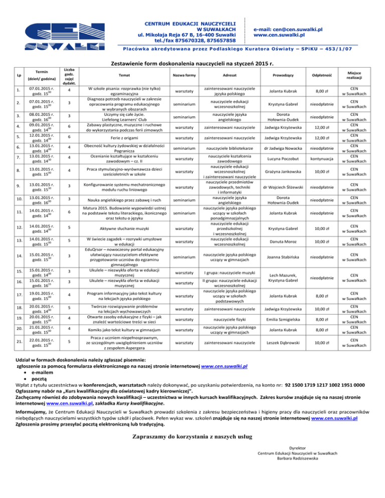 Zestawienie form doskonalenia nauczycieli na styczeń 2015 r