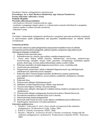 Przedmiot: Interna i pielęgniarstwo internistyczne Prowadzący: dr n. med. Barbara Sokołowska, mgr Justyna Paszkiewicz Forma zaliczenia: zaliczenie z oceną Praktyki: 40 godzin Warunki zaliczenia przedmiotu: - obowiązkowa obecność studenta podczas zajęć; - uzyskanie wymaganego stopnia wprawy w wykonywaniu czynności określonych w programie; - postawa zgodna z cechami sylwetki zawodowej, - zaliczenie z oceną. Cel Utrwalanie i doskonalenie umiejętności określonych w programie nauczania przedmiotu związanych ze sprawowaniem opieki pielęgniarskiej nad pacjentem hospitalizowanym na oddziale chorób wewnętrznych. Tematyka praktyk: Sprawowanie całościowej opieki pielęgniarskiej nad pacjentem hospitalizowanym na oddziale wewnętrznym pod kierunkiem pielęgniarki -praktyka (zgodnie z programem zajęć praktycznych) obejmującej następujące umiejętności: 1. Organizowanie stanowiska pracy. 2. Komunikowanie się z chorym, jego rodziną i zespołem terapeutycznym. 3. Ocena stanu funkcji układu krążenia, oddechowego, moczowego, pokarmowego, krwiotwórczego, narządów zmysłu, ruchu, gruczołów wewnętrznego wydzielania poprzez pomiar, obserwację, wywiad, analizę dokumentacji, analizę wyników badań. 4. Pobieranie materiałów do badań diagnostycznych (krew, mocz, wydzielina, kał). 5. Asystowanie przy punkcjach. 6. Przygotowanie, asystowanie i udział w badaniach diagnostycznych: usg, radiologicznych, endoskopowych, spirometrycznych, biopsjach. 7. Podawanie leków różnymi drogami (doustnie, doodbytniczo, poprzez gastrostomię, przez zgłębnik nosowo-żołądkowy, nosowo-jelitowy, podskórnie, domięśniowo, dożylnie, naskórnie) 8. Podawanie tlenu. 9. Wykonywanie zabiegów fizjoterapeutycznych. 10. Zakładanie cewnika dopęcherzowego i dbanie o jego drożność. 11. Utrzymywanie higieny osobistej i otoczenia chorego. 12. Wykonywanie zabiegów ułatwiających wydalanie (enema, kroplowy przyśpieszony wlew doodbytniczy). 13. Wykonywanie zabiegów pielęgnacyjno-leczniczych na skórze i błonach śluzowych. 14. Prowadzenie poradnictwa odnośnie trybu życia z chorobą. 15. Dokumentowanie działań pielęgniarskich. 16. Stosowanie skali Norton do oceny ryzyka odleżyn i profilaktyka przeciwodleżynowa. 17. Zapobieganie zakażeniom wewnątrzszpitalnym. Literatura podstawowa: 1. Daniluk J. Jurkowska G. (red.): Zarys chorób wewnętrznych dla studentów pielęgniarstwa. Wydawnictwo Czelej. Lublin, 2005. 2. Kokot F. Choroby wewnętrzne. PZWL, 2006. 3. Pączek L. Mucha K., Froncewicz B (red.): Choroby wewnętrzne. Podręcznik dla studentów pielęgniarstwa i położnictwa. Wydawnictwo Lekarskie PZWL. Warszawa, 2009. 4. Talarska D. Zozulinska- Ziółkiewicz D. (red): Pielęgniarstwo Internistyczne. Wydawnictwo Lekarskie PZWL. Warszawa, 2009. Literatura uzupełniająca: 1. Kózka M., Płaszewska-Żywko L. (red.): Diagnozy i interwencje pielęgniarskie. Wydawnictwo Lekarskie PZWL, Warszawa, 2008. 2. Kózka M., Płaszewska-Żywko L. (red.): Procedury pielęgniarskie. Wydawnictwo Lekarskie PZWL, Warszawa, 2009. 3. Szczeklik A (red.): Choroby wewnętrzne. Wydawnictwo Medycyna Praktyczna. Kraków, 2005. 4. Talarska Dorota, Zozulińska-Ziółkiewicz Dorota red. Pielęgniarstwo internistyczne Podręcznik dla studiów medycznych Wydawnictwo: PZWL, 2009 5. Herold Gerd, Medycyna wewnętrzna – repetytorium dla studentów medycyny i lekarzy, PZWL, 2007. 6. Francis Morris, William J. Brady, John Camm: ABC elektrokardiografii klinicznej, 2009 , wydanie 1, ISBN: 978-1-4051-7064-2 7. Tatoń J. Czech A. Cukrzyca: Podręcznik diagnostyki i terapii. Elamed, 2009.